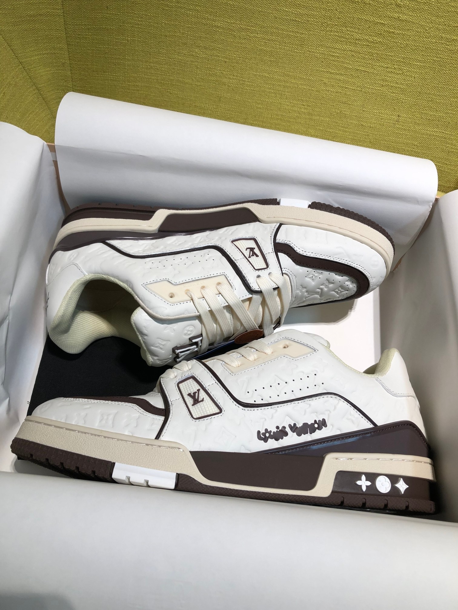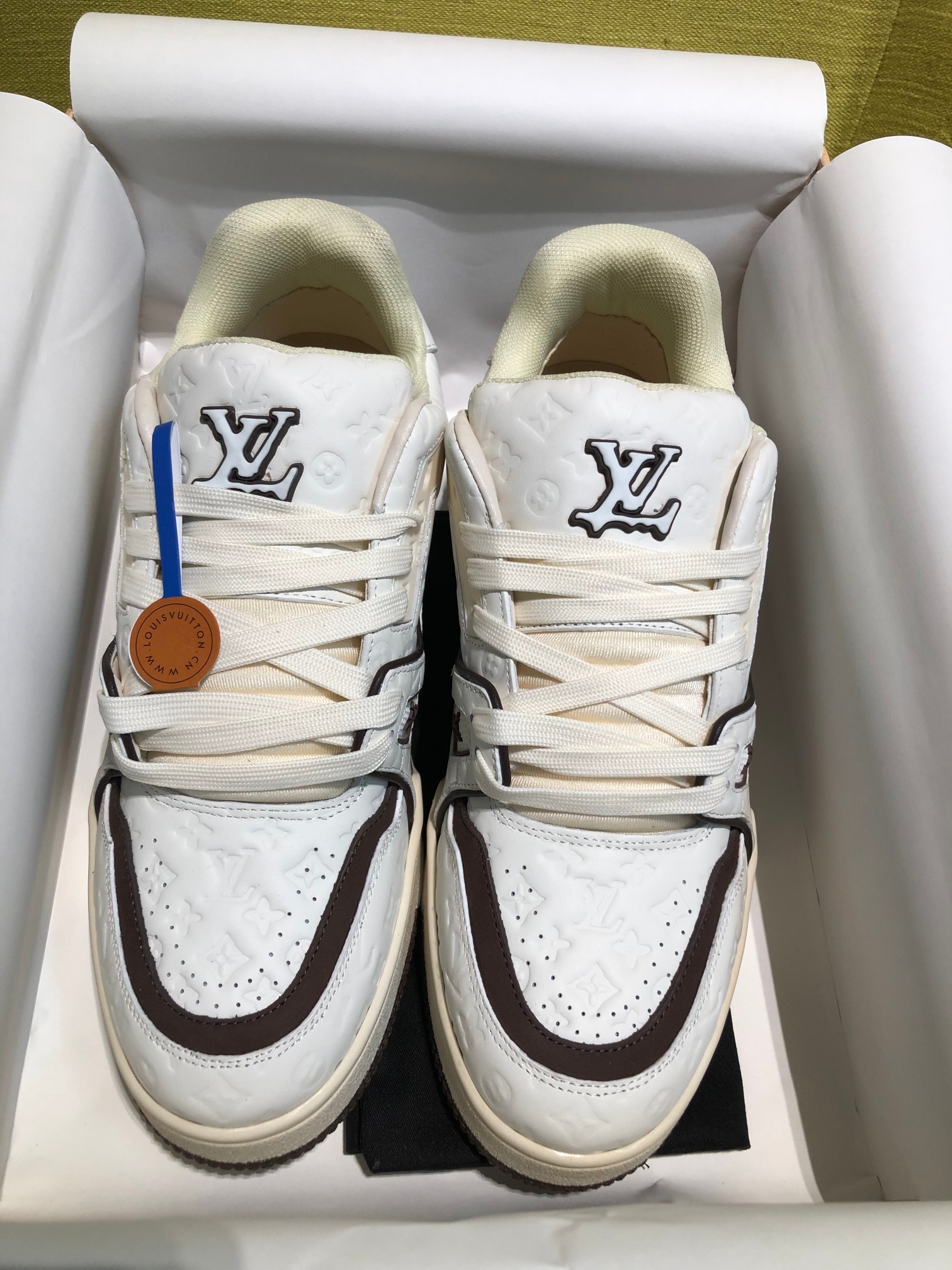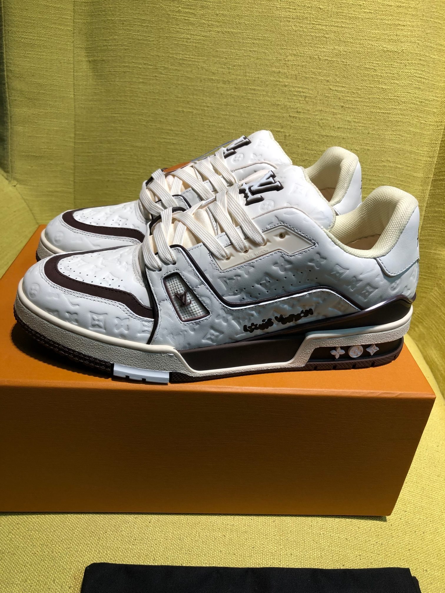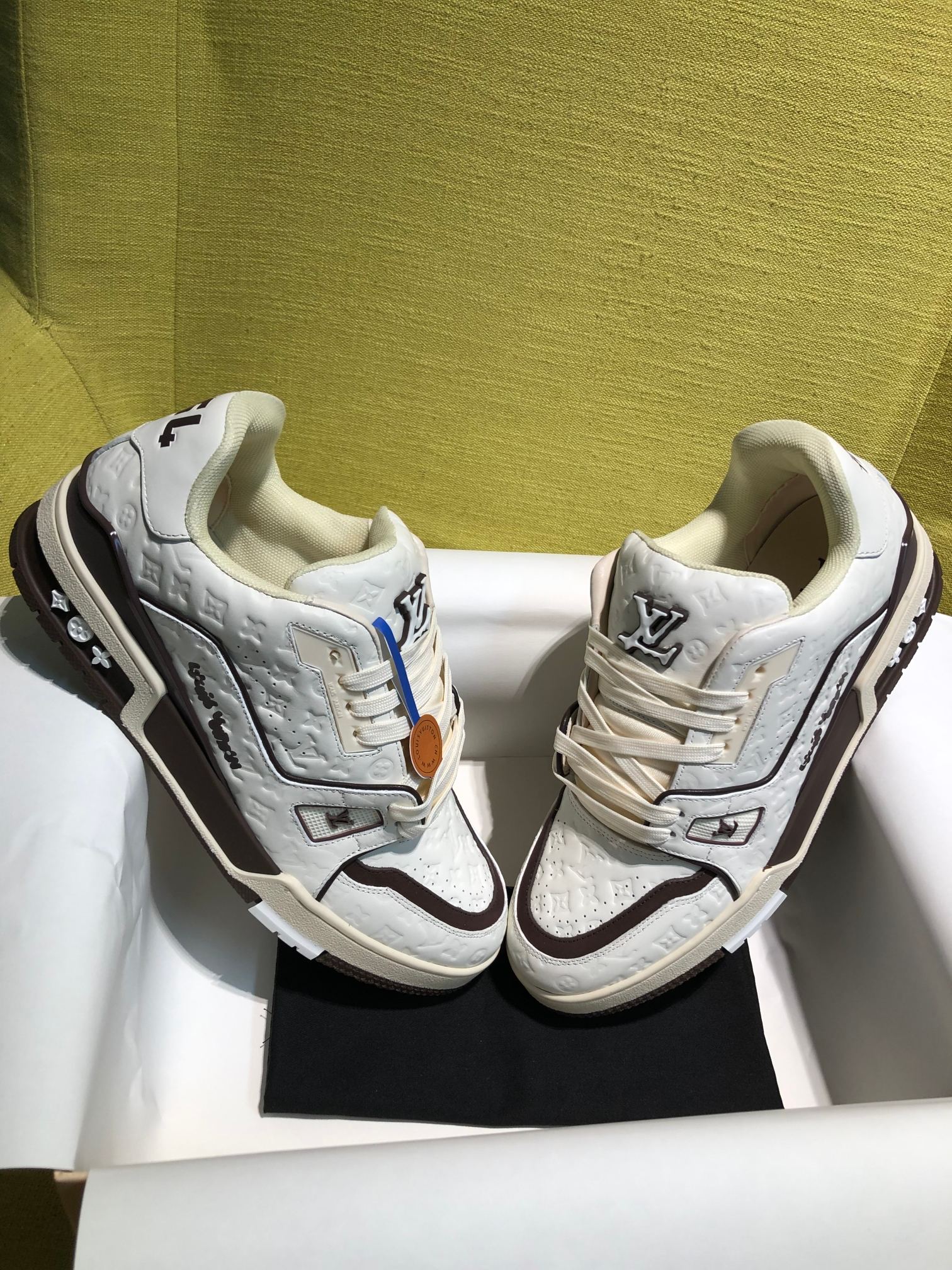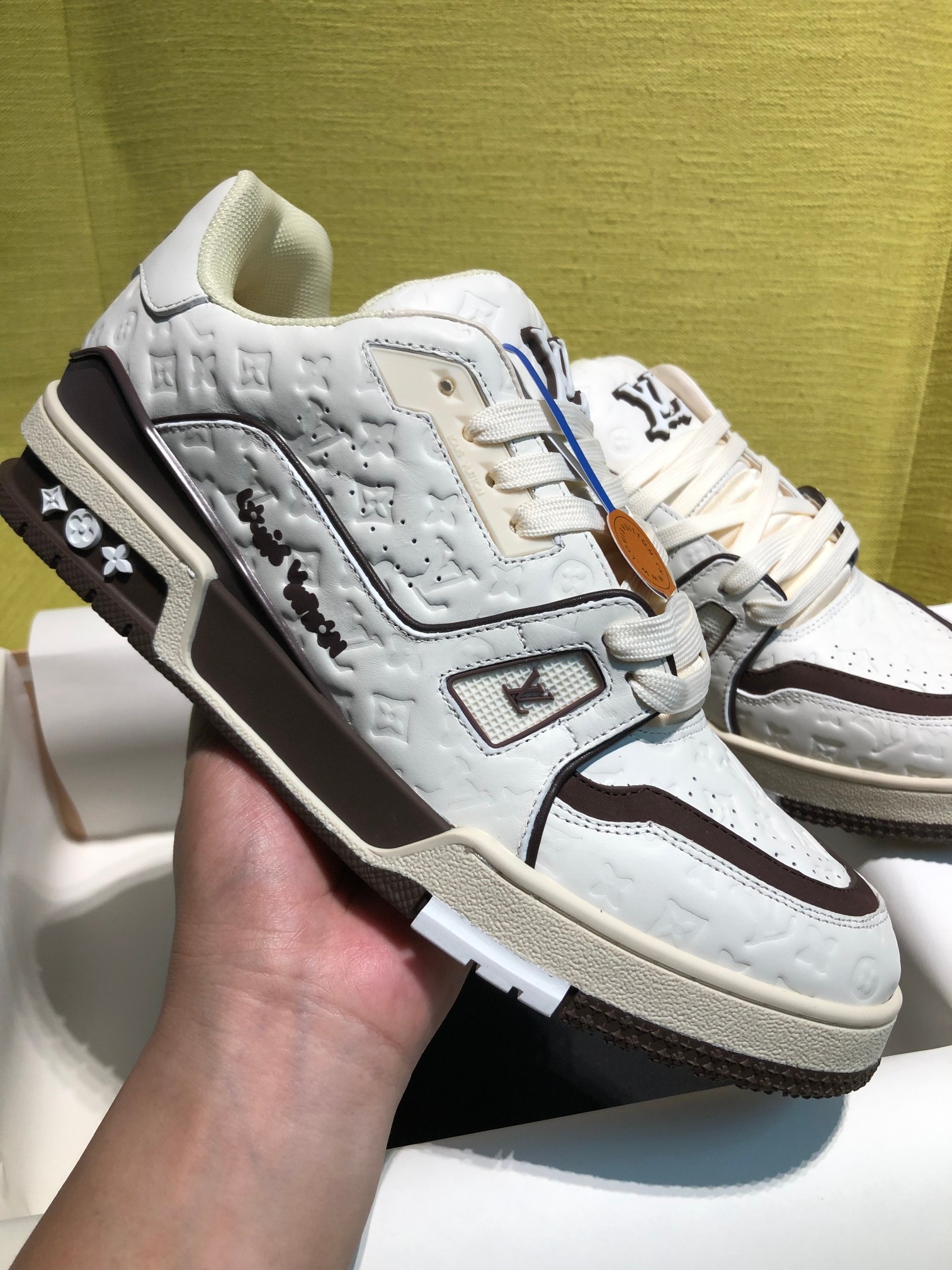 这款鞋子是AAAAA 1:1 质量 (非常棒). 使用了和原版一模一样的材料. 商标部分也保持了和路易威登/Louis Vuitton一样. 图片拍摄是实物鞋子拍摄, 您所收到的实物保证和我们图片一模一样.