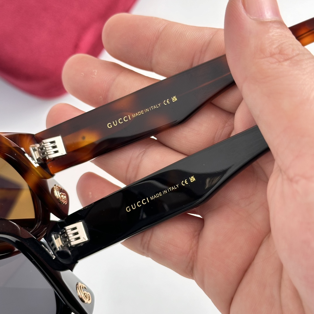 这款太阳眼镜是AAAAA 1:1 质量 (非常棒). 使用了和原版一模一样的材料. 商标部分也保持了和古奇/Gucci一样. 图片拍摄是实物太阳眼镜拍摄, 您所收到的实物保证和我们图片一模一样.
