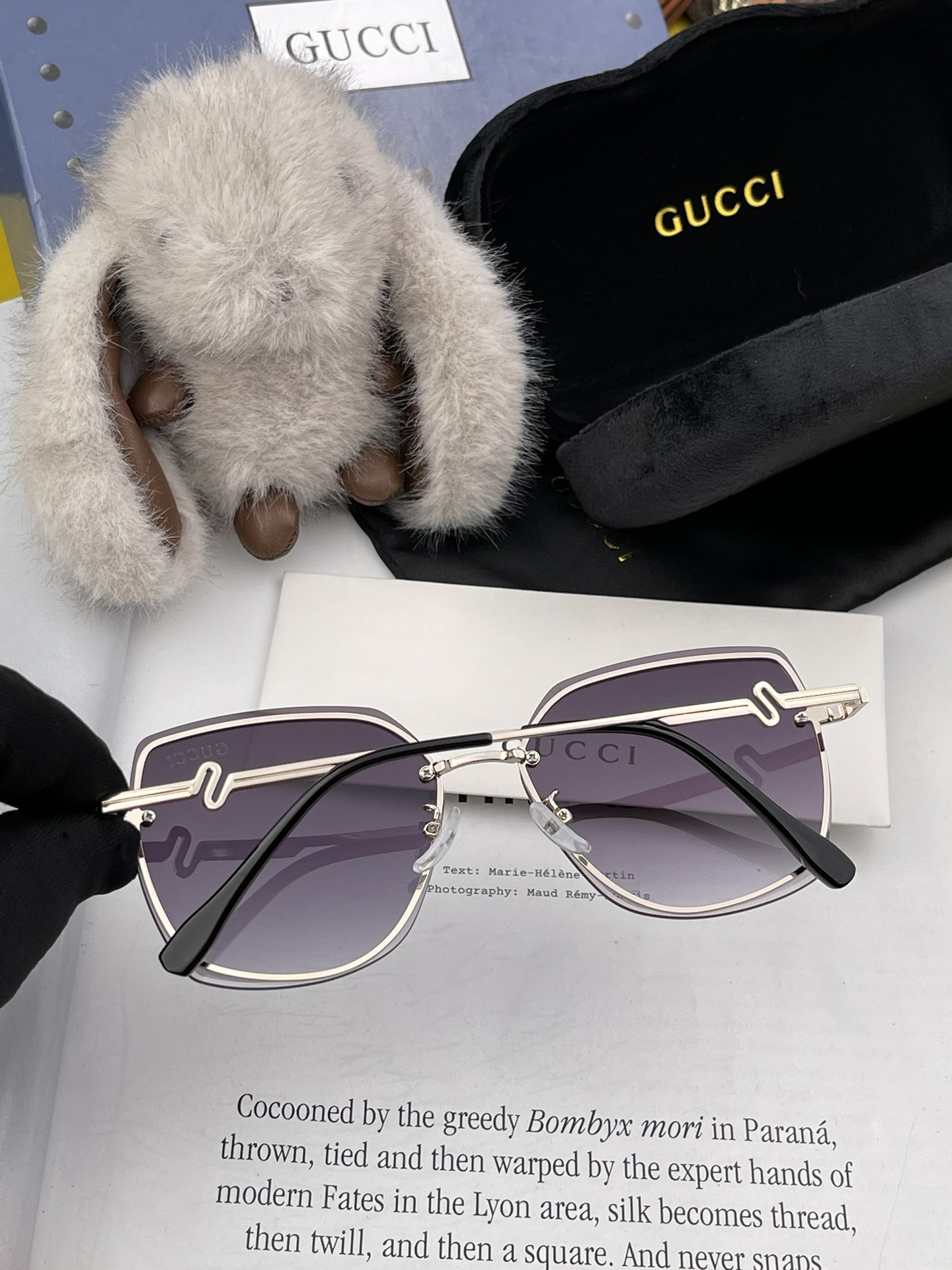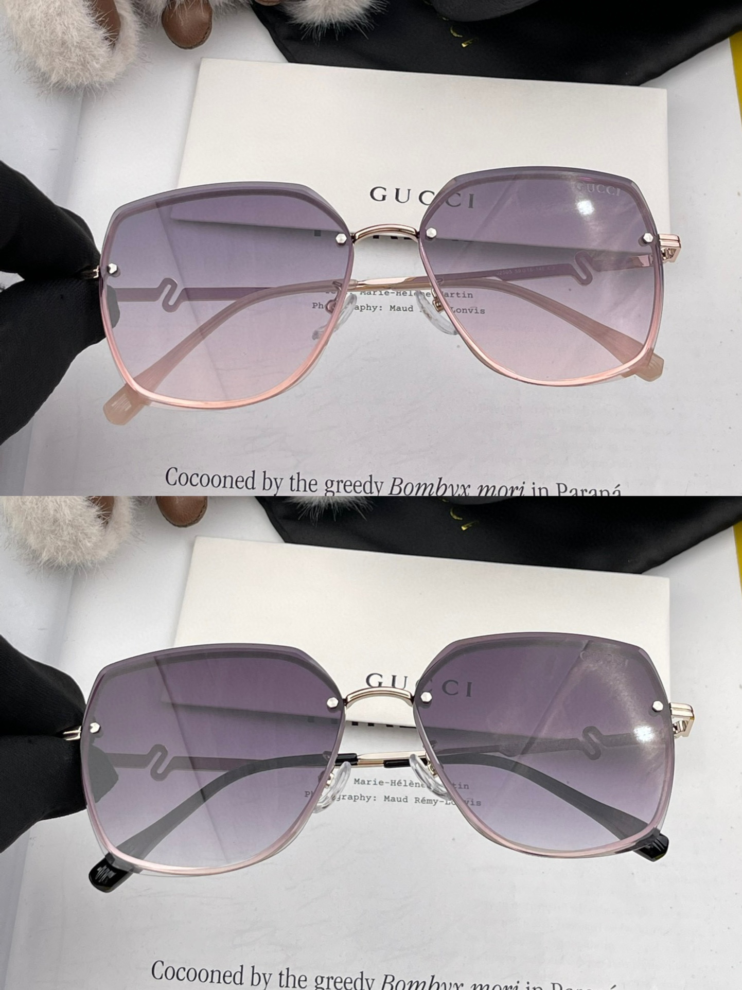 这款太阳眼镜是AAAAA 1:1 质量 (非常棒). 使用了和原版一模一样的材料. 商标部分也保持了和古奇/Gucci一样. 图片拍摄是实物太阳眼镜拍摄, 您所收到的实物保证和我们图片一模一样.