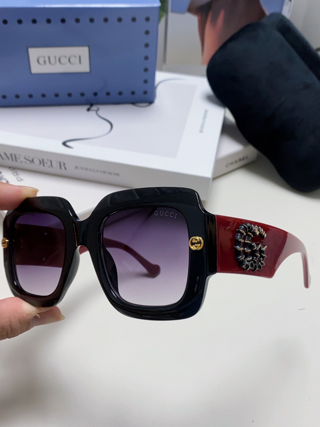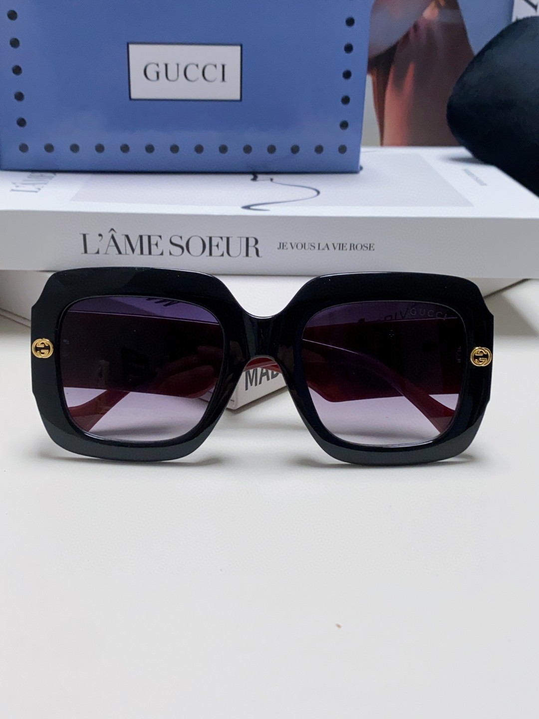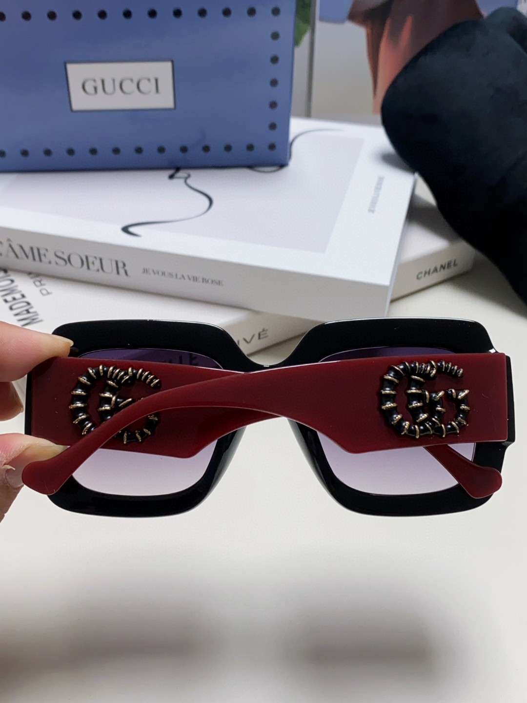 这款太阳眼镜是AAAAA 1:1 质量 (非常棒). 使用了和原版一模一样的材料. 商标部分也保持了和古奇/Gucci一样. 图片拍摄是实物太阳眼镜拍摄, 您所收到的实物保证和我们图片一模一样.