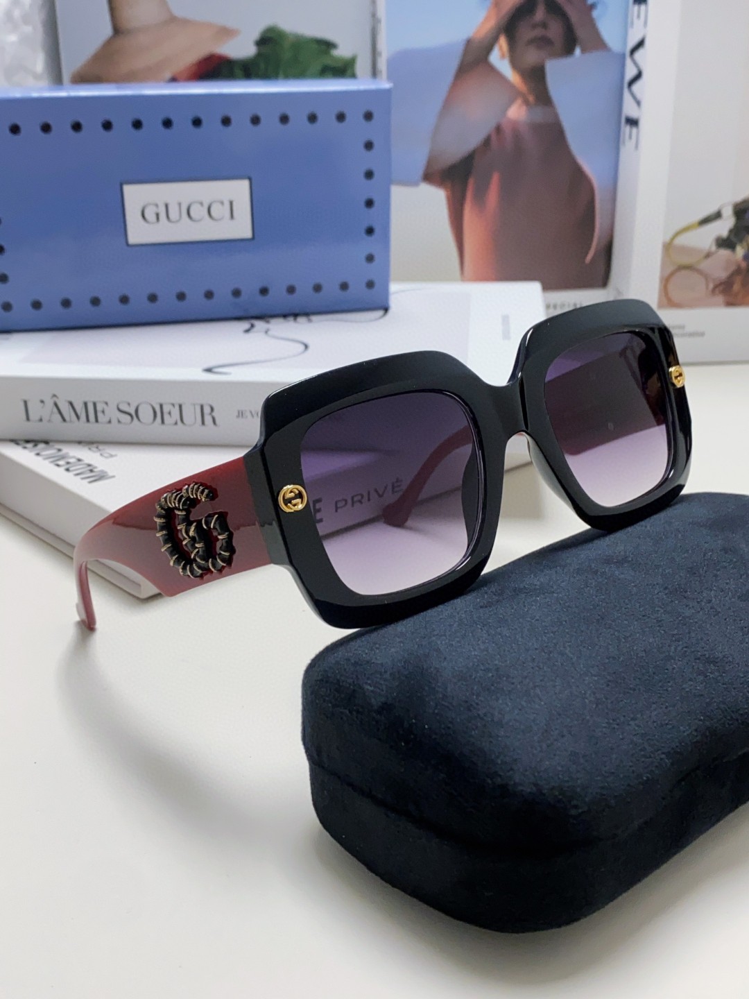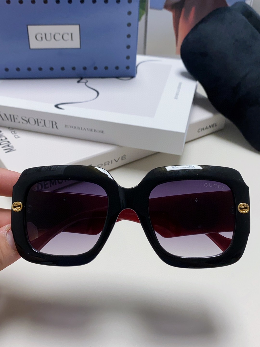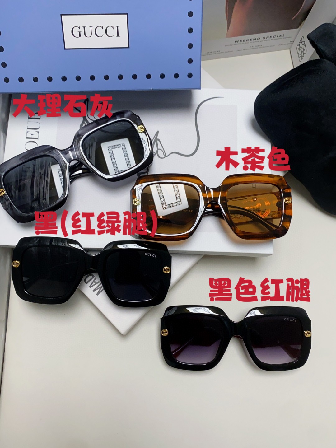 这款太阳眼镜是AAAAA 1:1 质量 (非常棒). 使用了和原版一模一样的材料. 商标部分也保持了和古奇/Gucci一样. 图片拍摄是实物太阳眼镜拍摄, 您所收到的实物保证和我们图片一模一样.