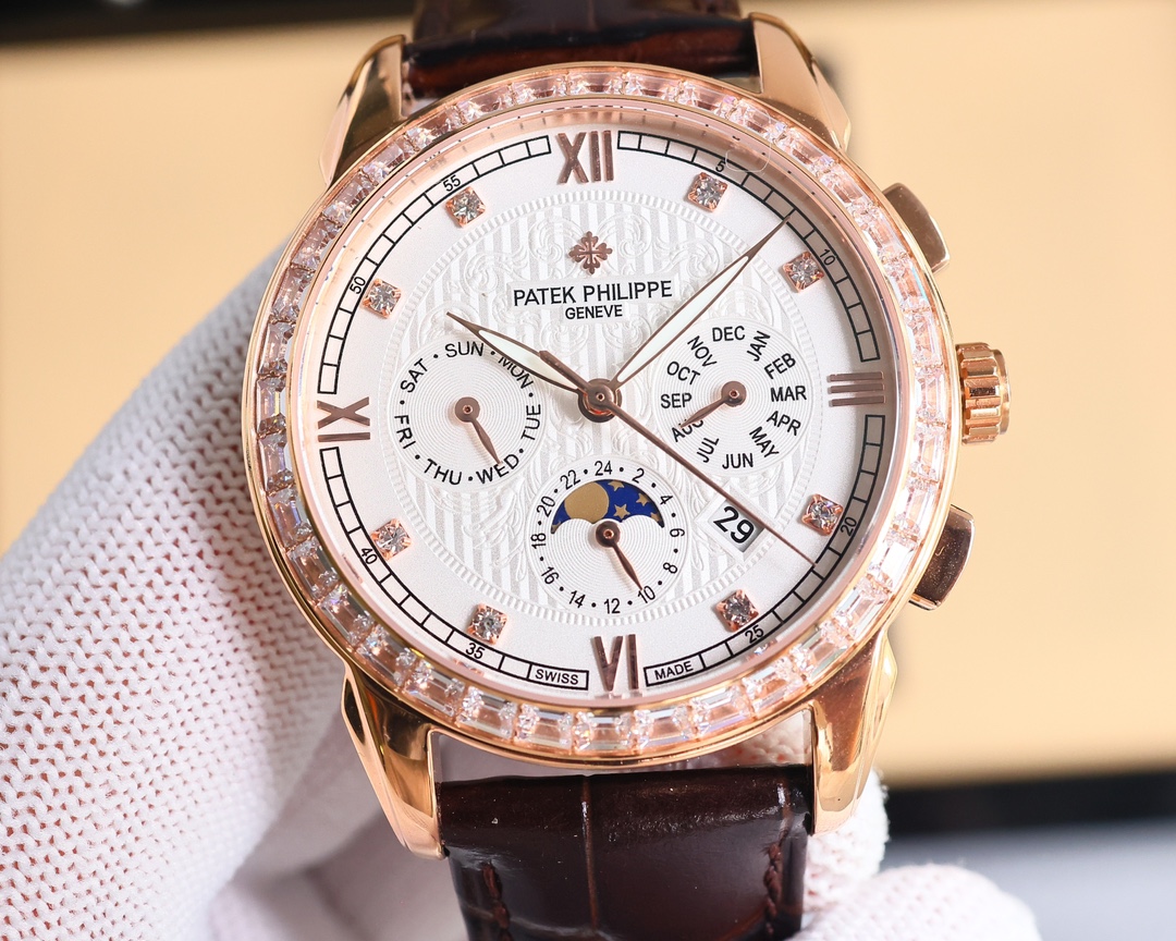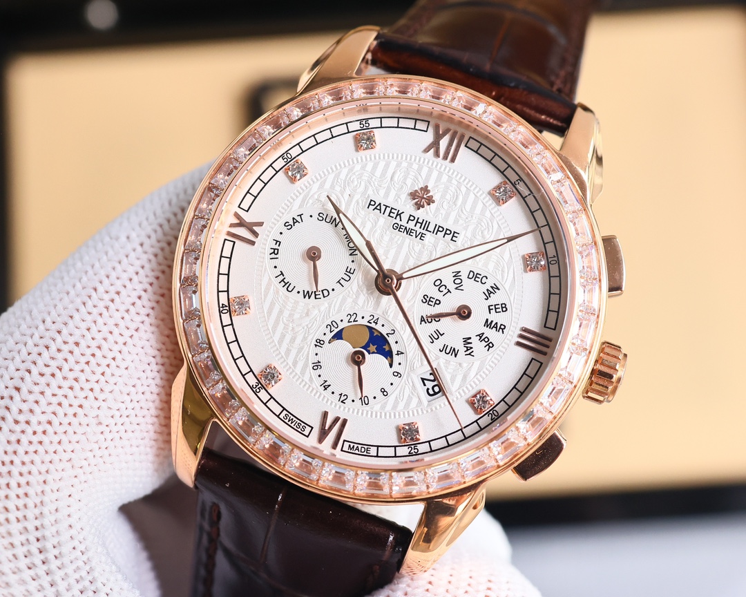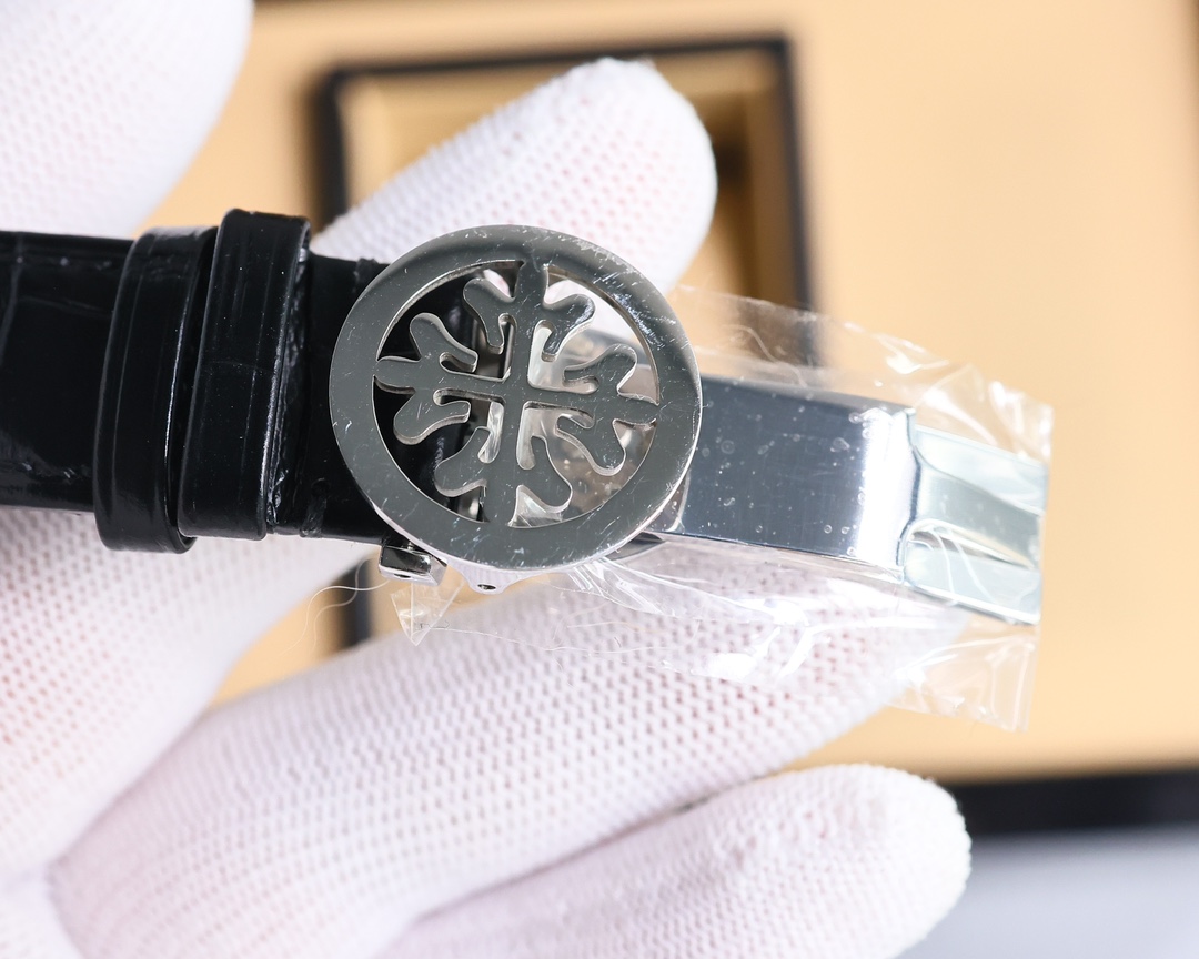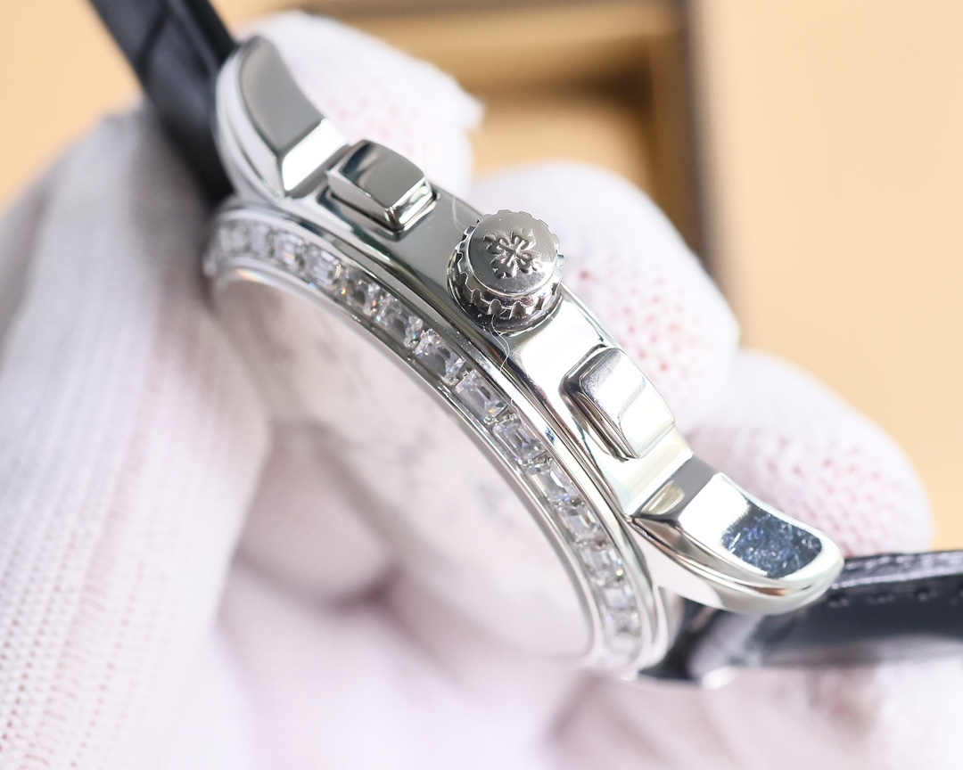 这款手表是AAAAA 1:1 质量 (非常棒). 使用了和原版一模一样的材料. 商标部分也保持了和百达翡丽/Patek Philippe一样. 图片拍摄是实物手表拍摄, 您所收到的实物保证和我们图片一模一样.