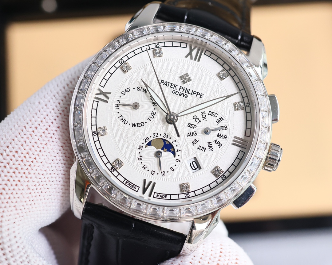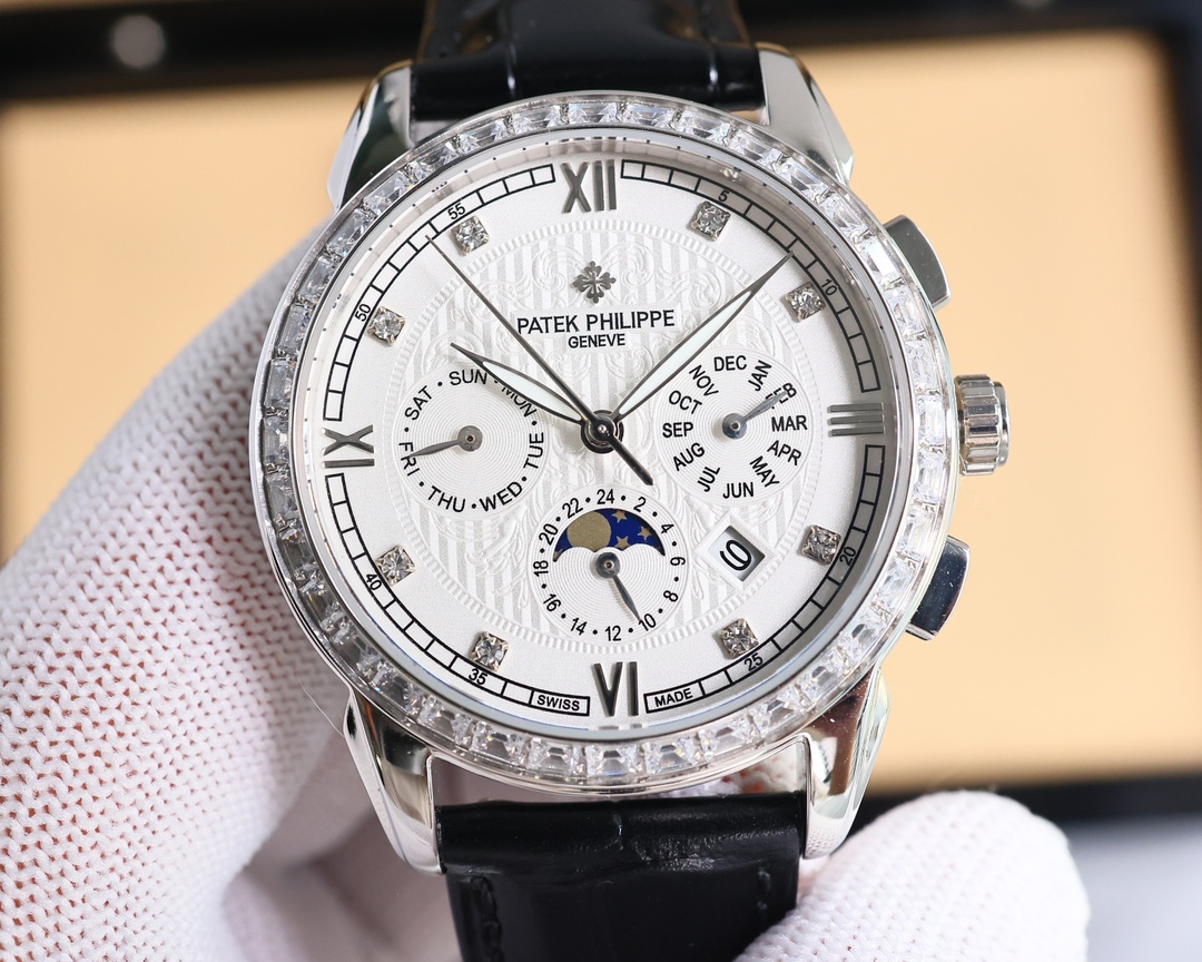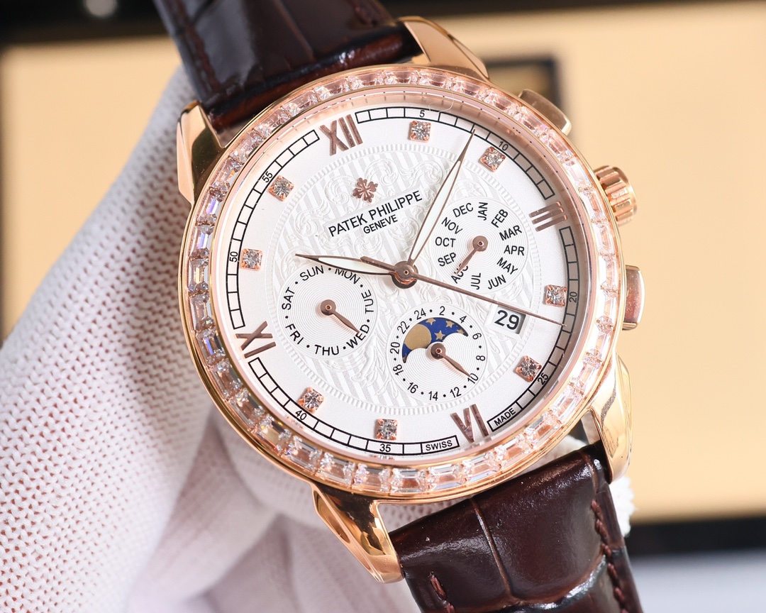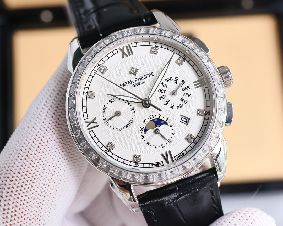 这款手表是AAAAA 1:1 质量 (非常棒). 使用了和原版一模一样的材料. 商标部分也保持了和百达翡丽/Patek Philippe一样. 图片拍摄是实物手表拍摄, 您所收到的实物保证和我们图片一模一样.