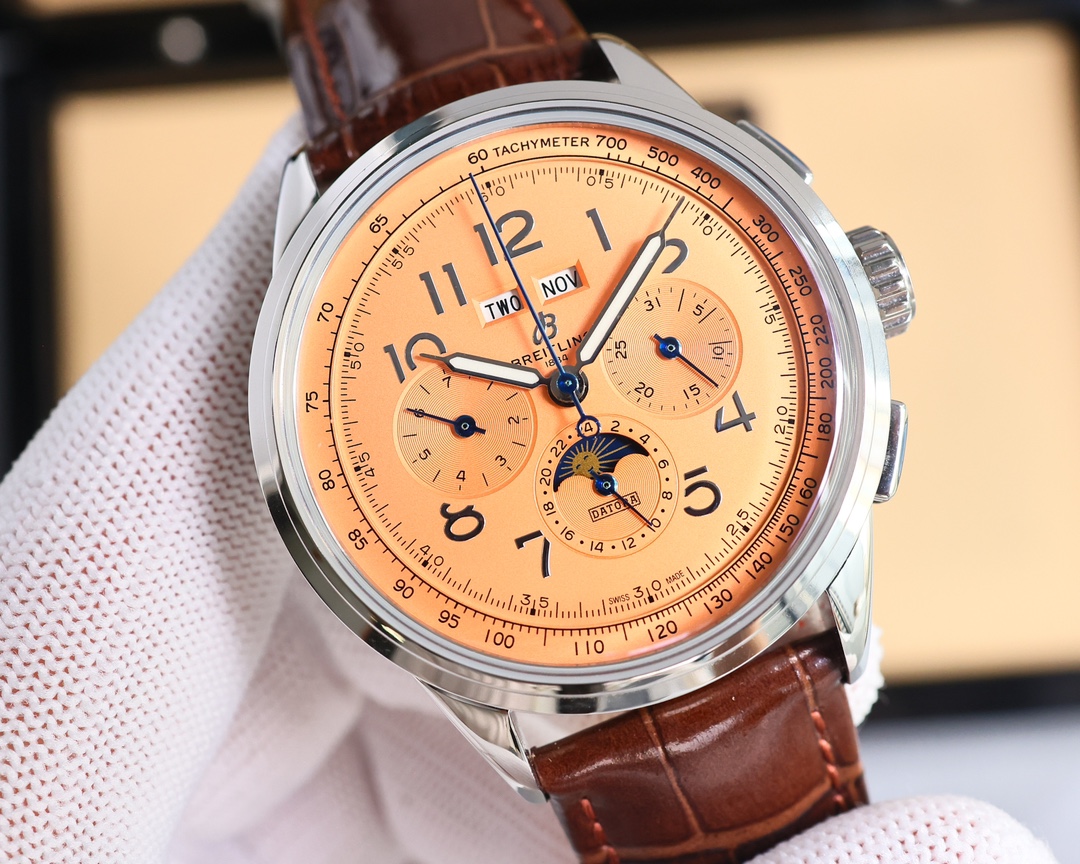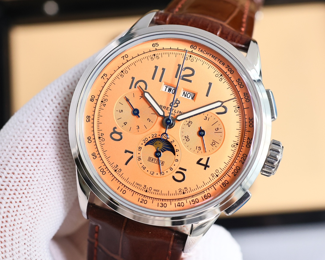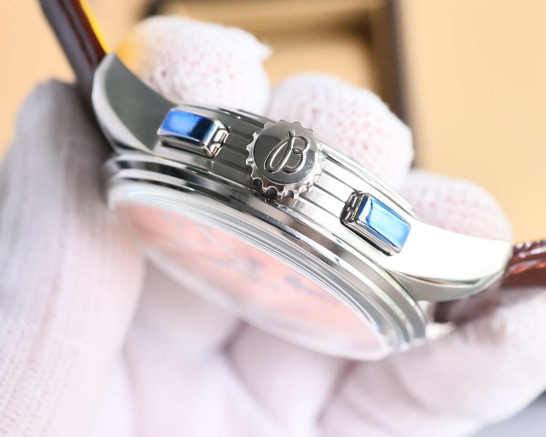 这款手表是AAAAA 1:1 质量 (非常棒). 使用了和原版一模一样的材料. 商标部分也保持了和Breitling一样. 图片拍摄是实物手表拍摄, 您所收到的实物保证和我们图片一模一样.