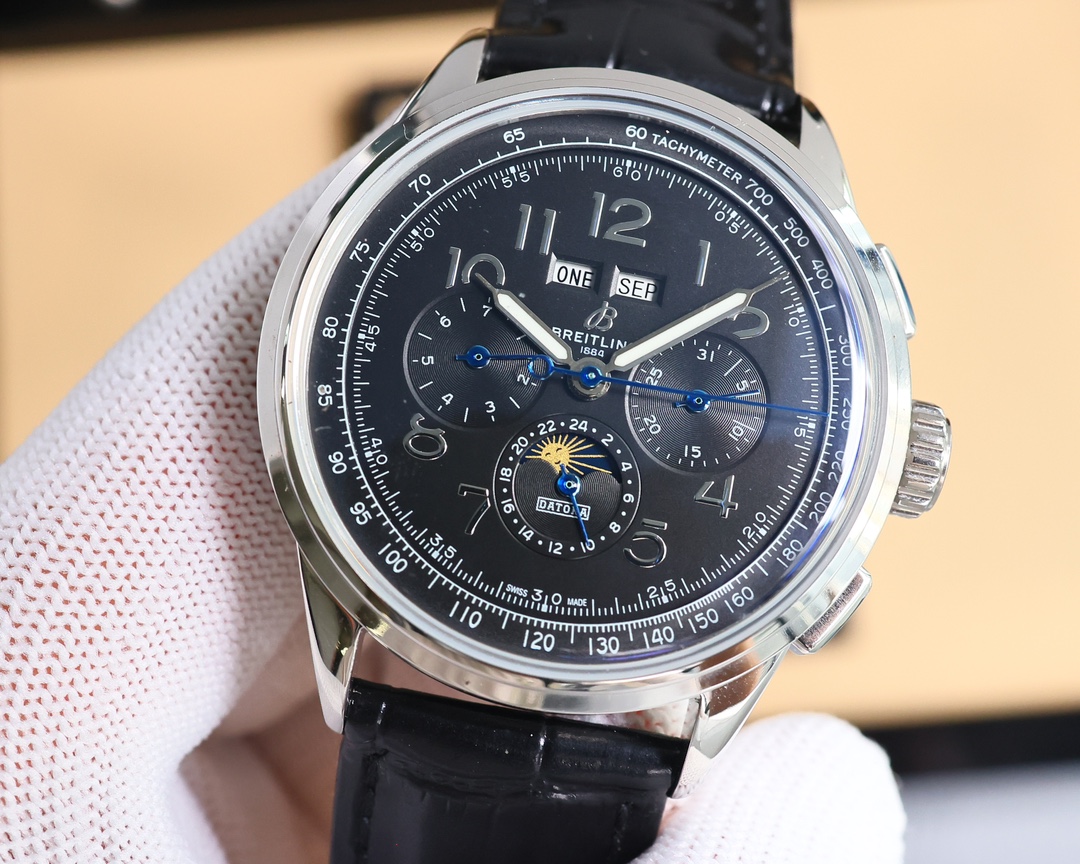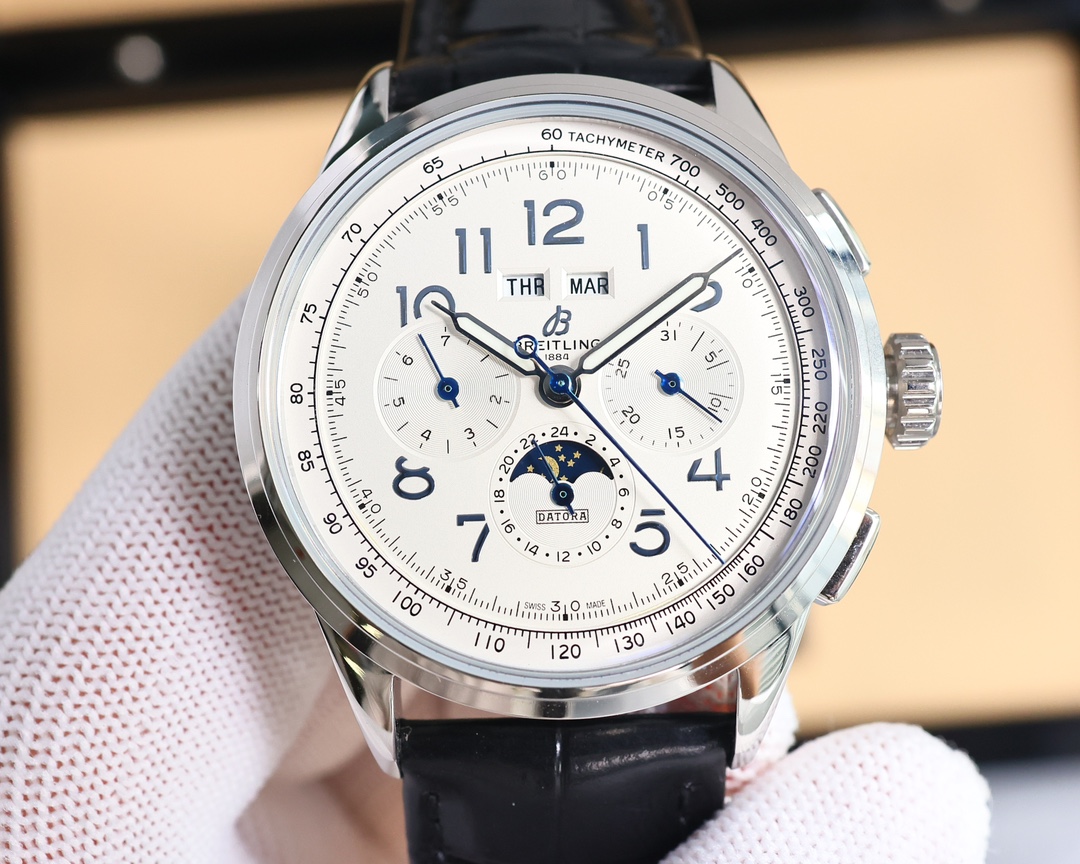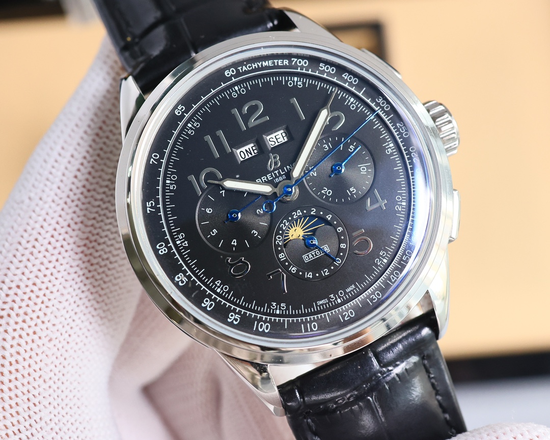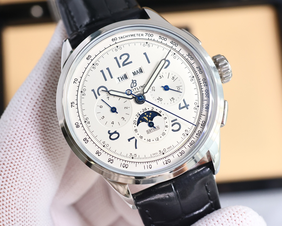 这款手表是AAAAA 1:1 质量 (非常棒). 使用了和原版一模一样的材料. 商标部分也保持了和Breitling一样. 图片拍摄是实物手表拍摄, 您所收到的实物保证和我们图片一模一样.