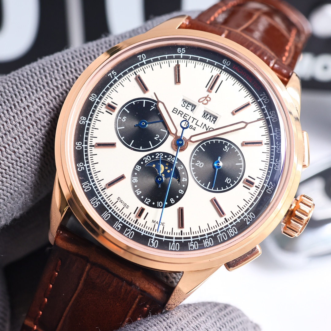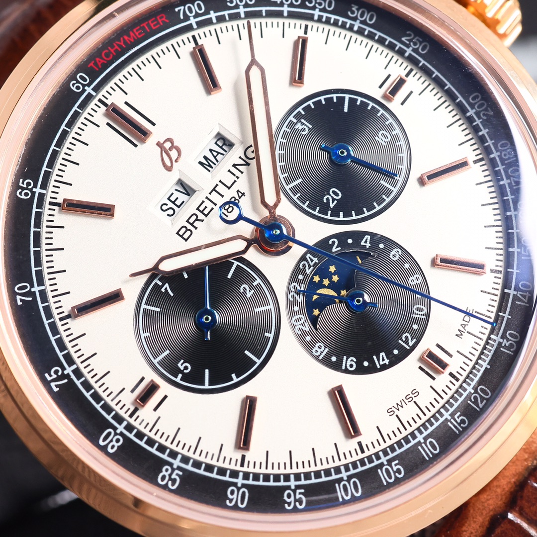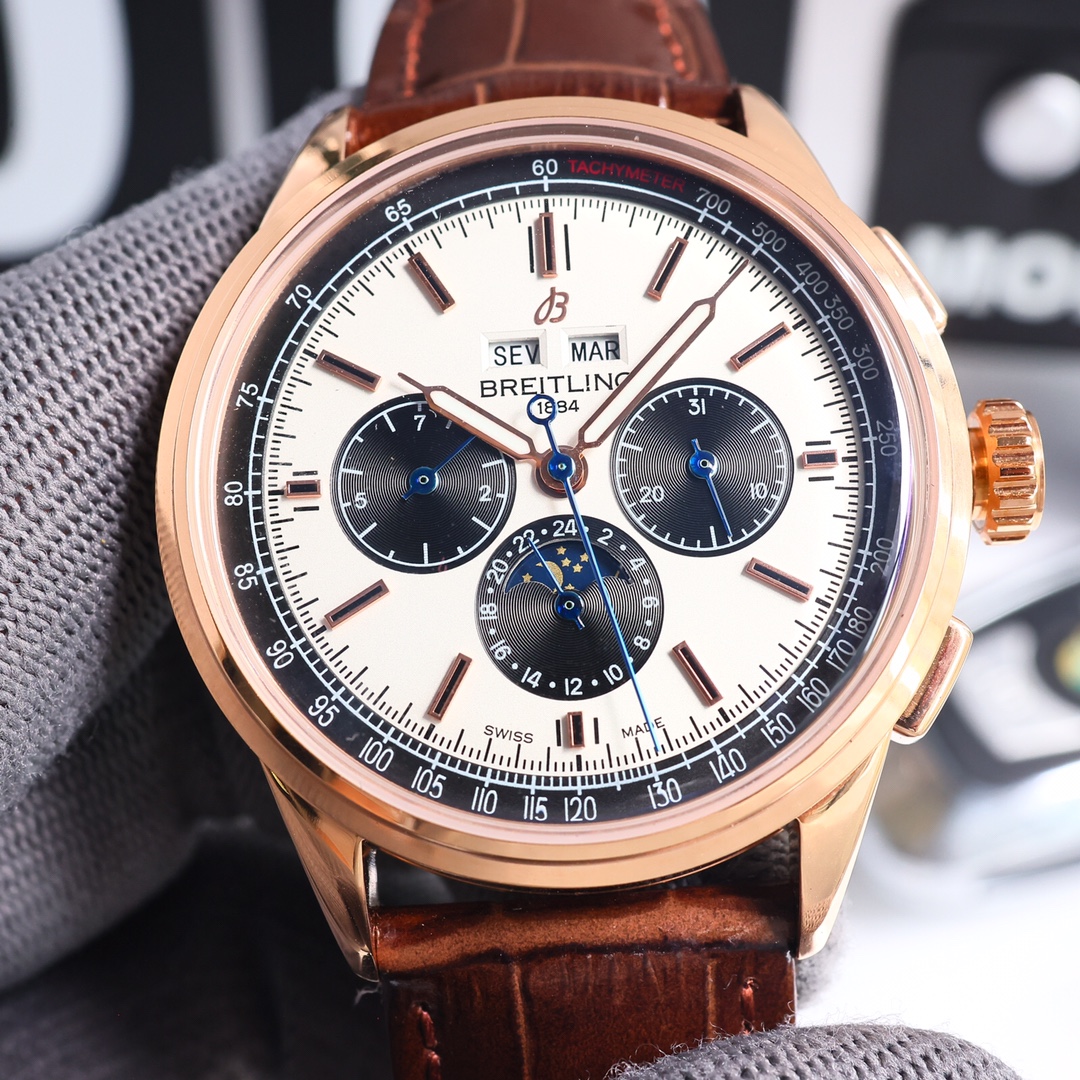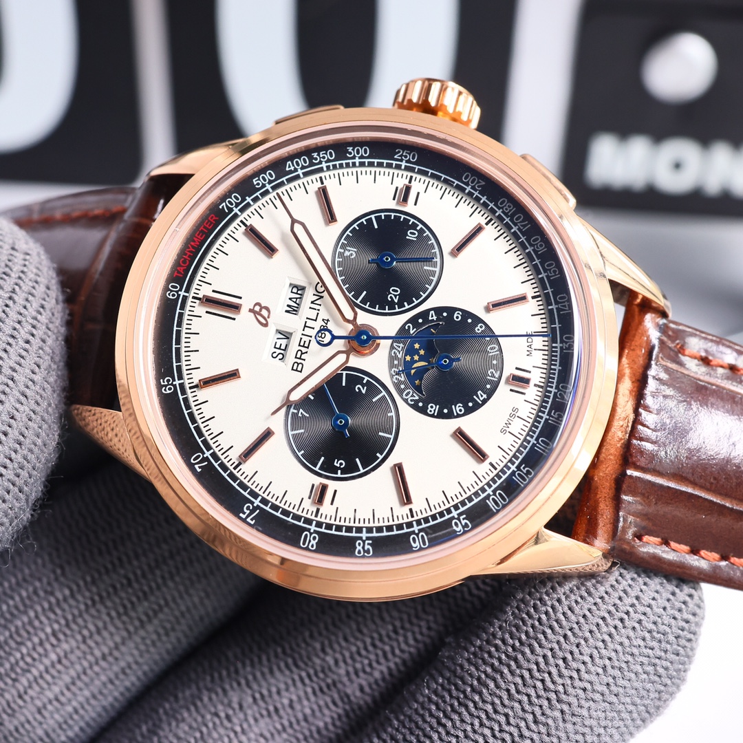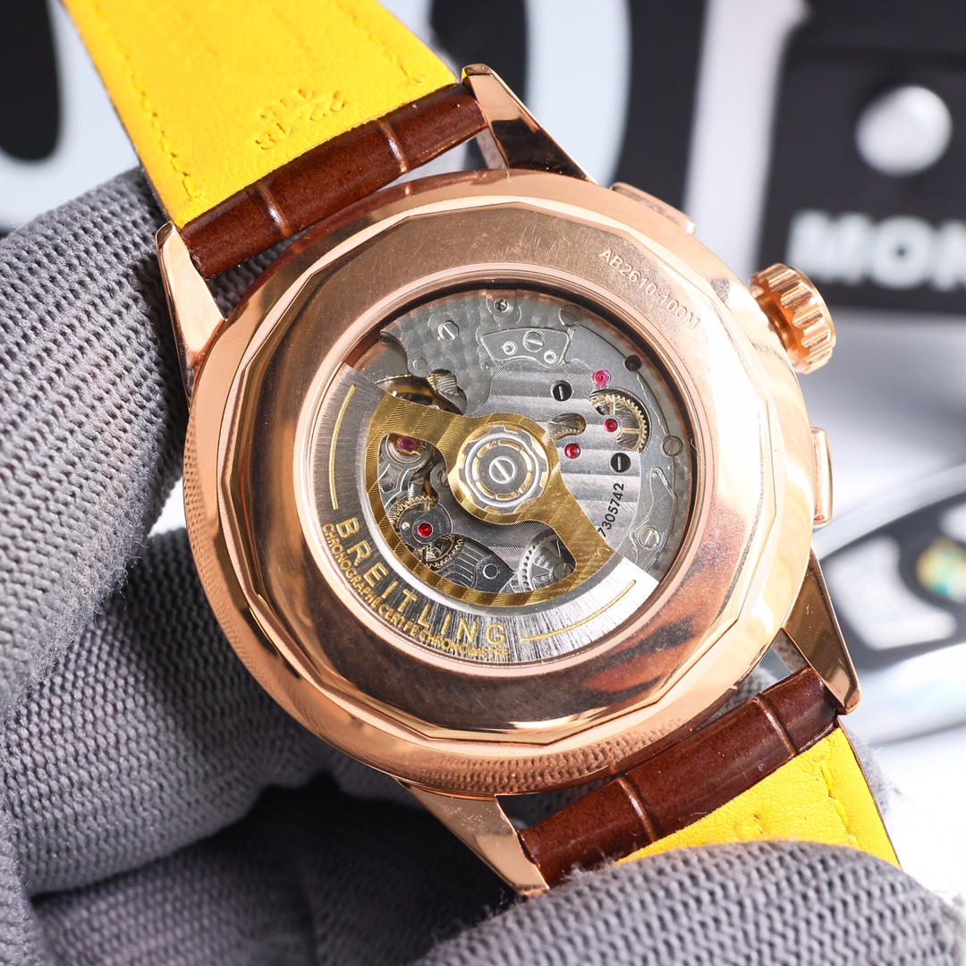 这款手表是AAAAA 1:1 质量 (非常棒). 使用了和原版一模一样的材料. 商标部分也保持了和Breitling一样. 图片拍摄是实物手表拍摄, 您所收到的实物保证和我们图片一模一样.