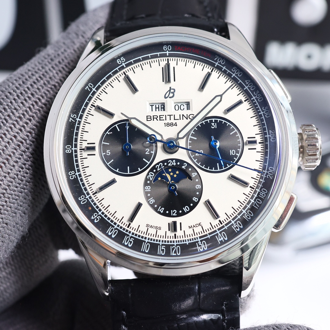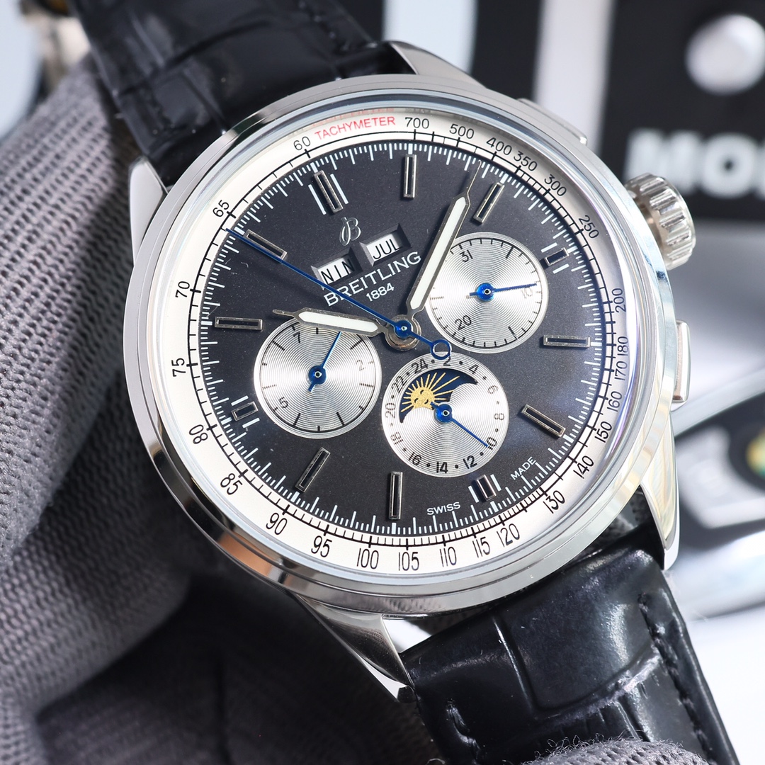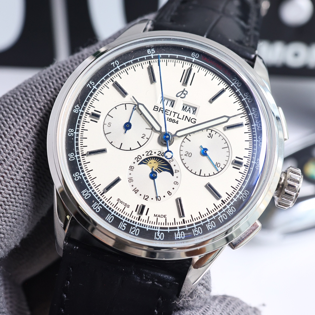 这款手表是AAAAA 1:1 质量 (非常棒). 使用了和原版一模一样的材料. 商标部分也保持了和Breitling一样. 图片拍摄是实物手表拍摄, 您所收到的实物保证和我们图片一模一样.