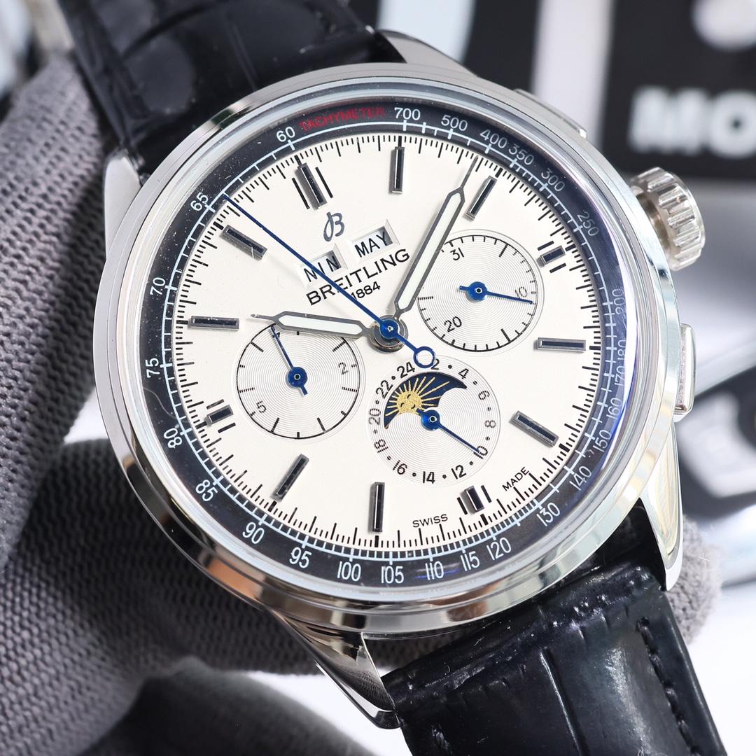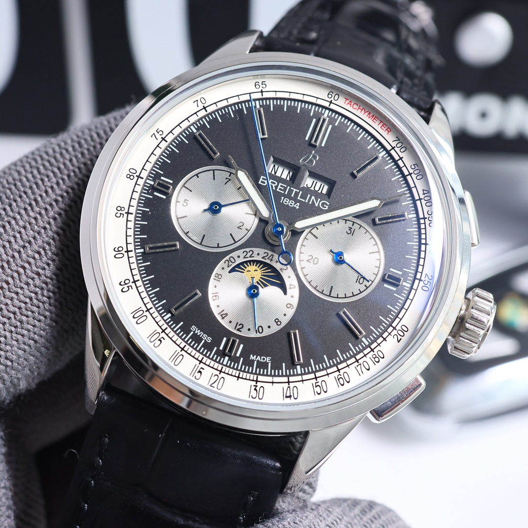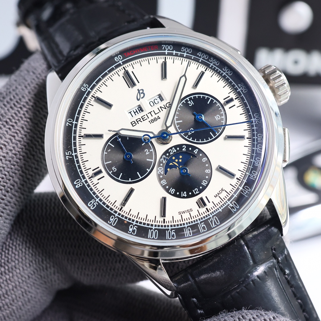 这款手表是AAAAA 1:1 质量 (非常棒). 使用了和原版一模一样的材料. 商标部分也保持了和Breitling一样. 图片拍摄是实物手表拍摄, 您所收到的实物保证和我们图片一模一样.