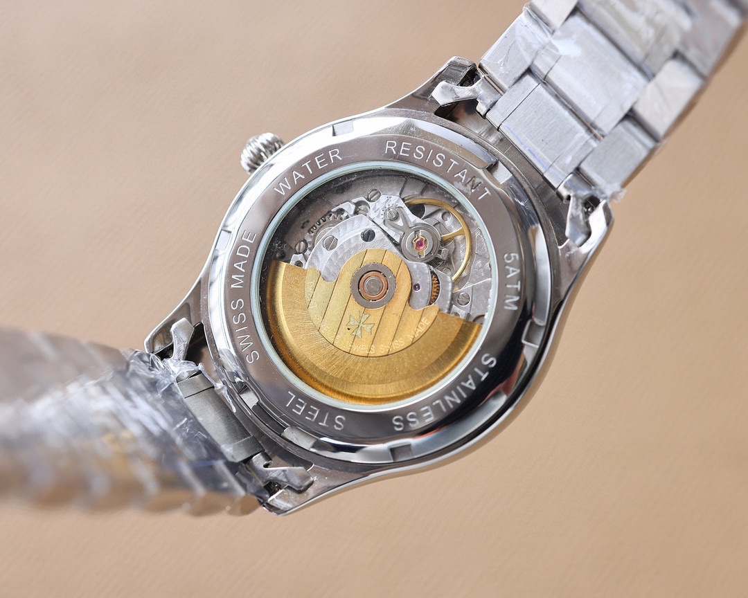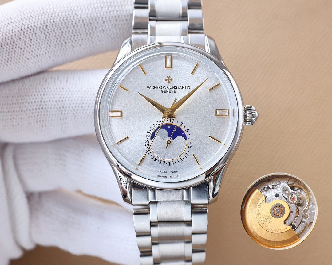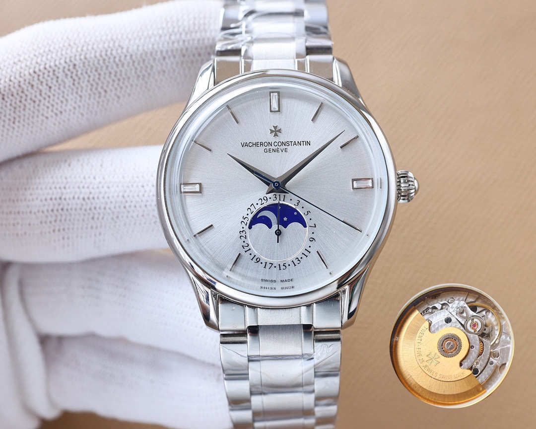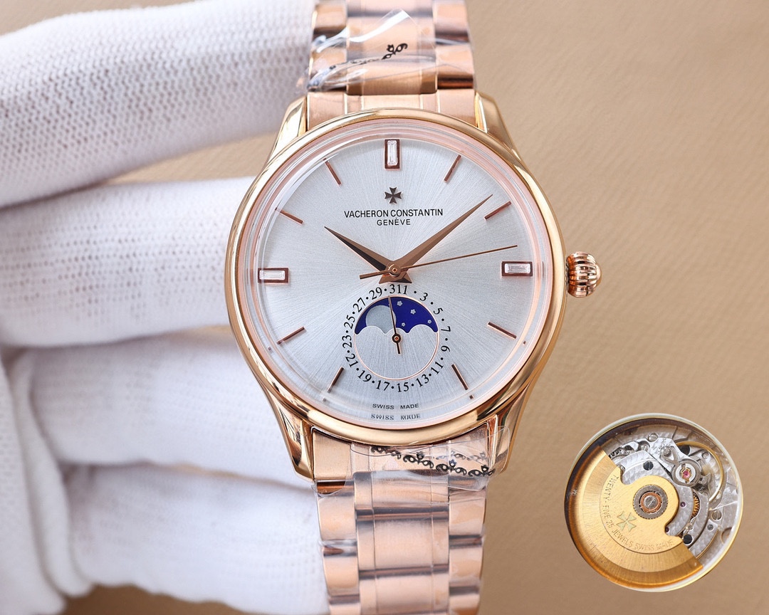 这款手表是AAAAA 1:1 质量 (非常棒). 使用了和原版一模一样的材料. 商标部分也保持了和江诗丹顿/Vacheron Constantin一样. 图片拍摄是实物手表拍摄, 您所收到的实物保证和我们图片一模一样.