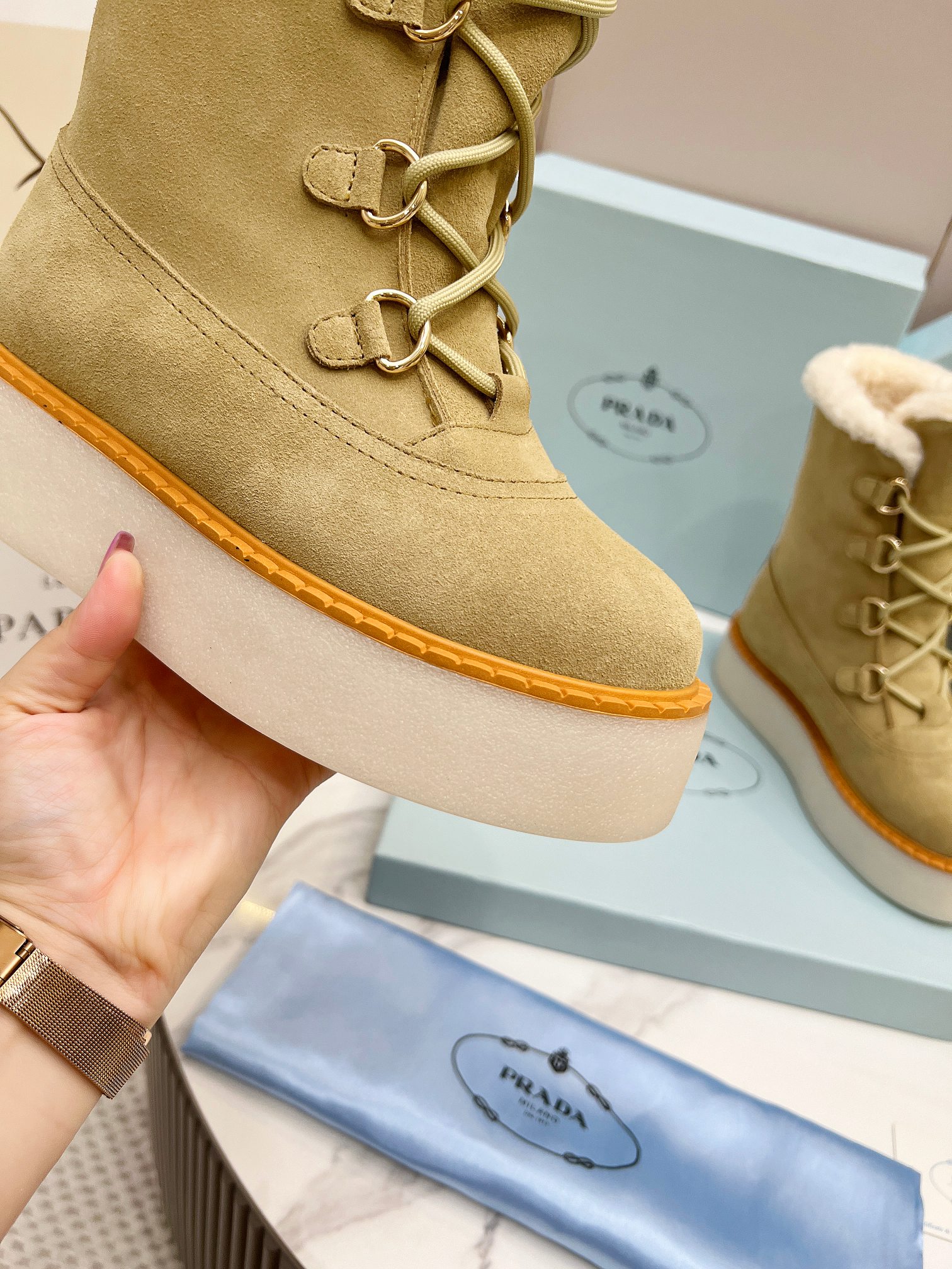 这款鞋子是AAAAA 1:1 质量 (非常棒). 使用了和原版一模一样的材料. 商标部分也保持了和普拉达/Prada一样. 图片拍摄是实物鞋子拍摄, 您所收到的实物保证和我们图片一模一样.
