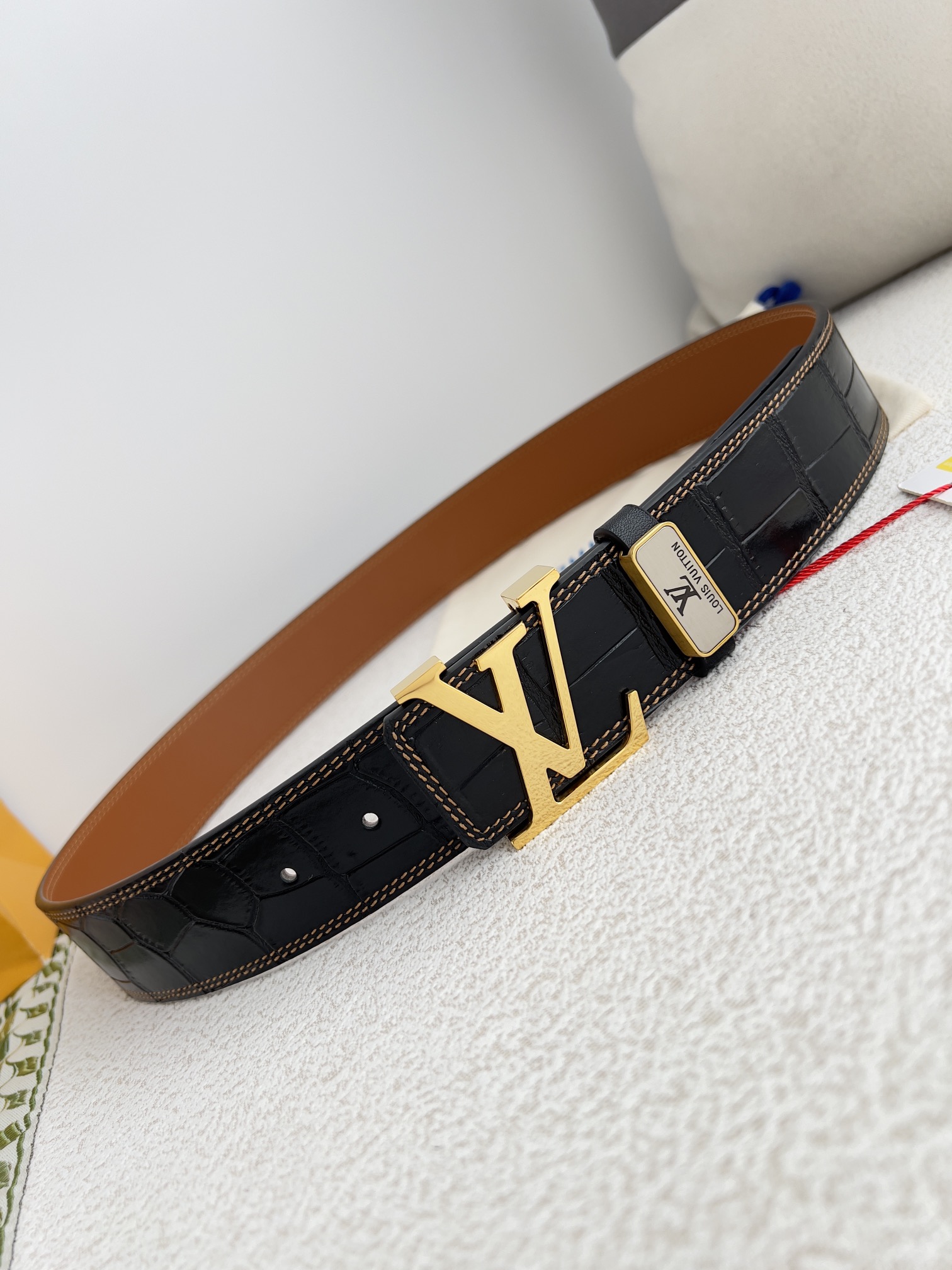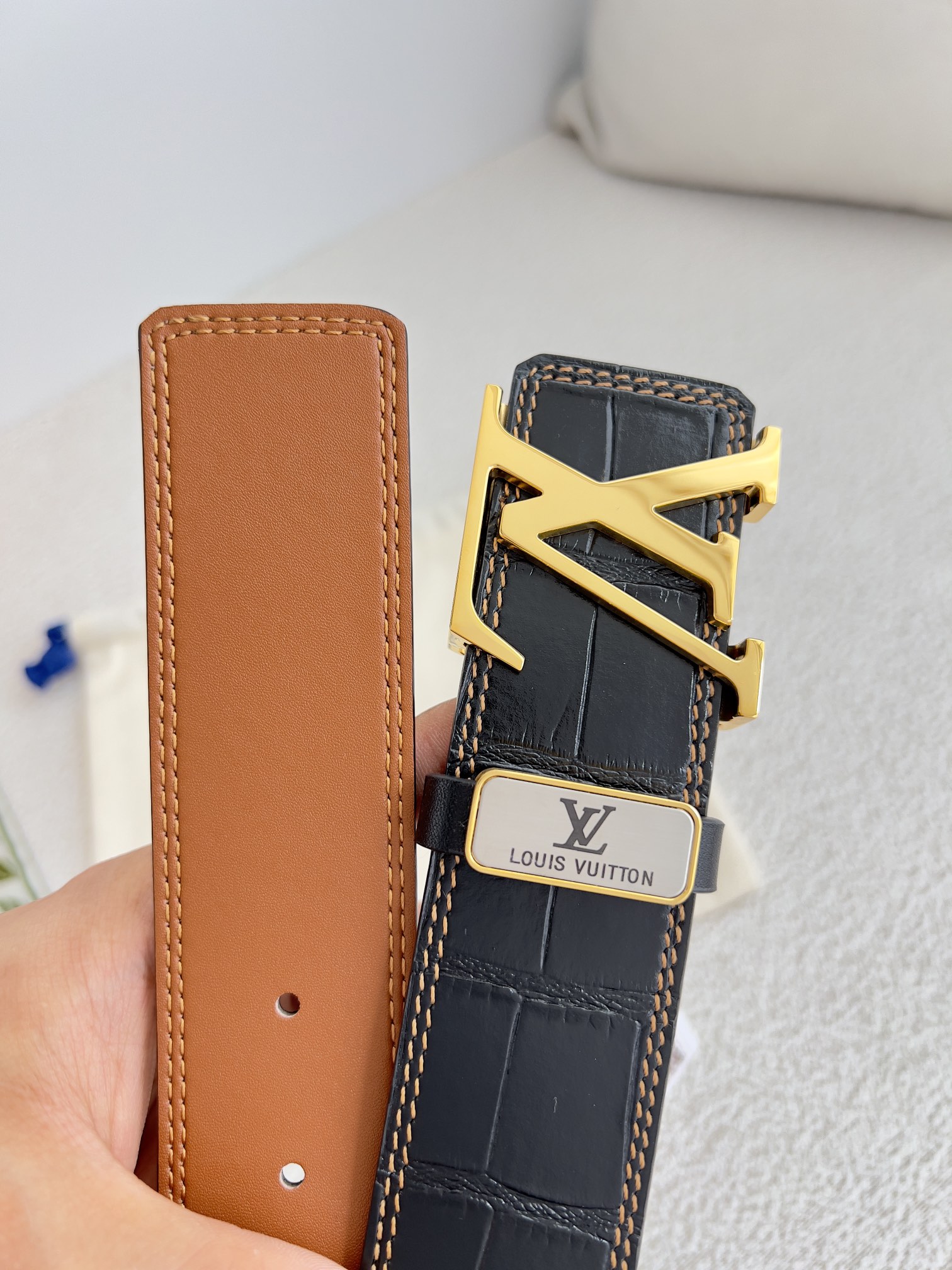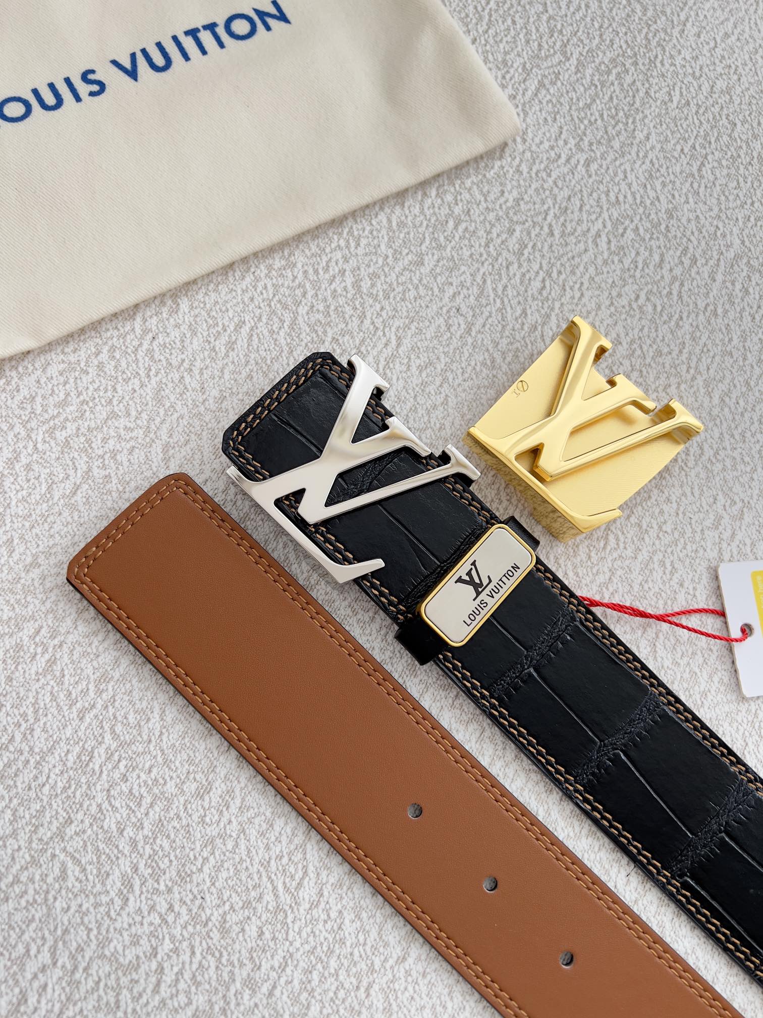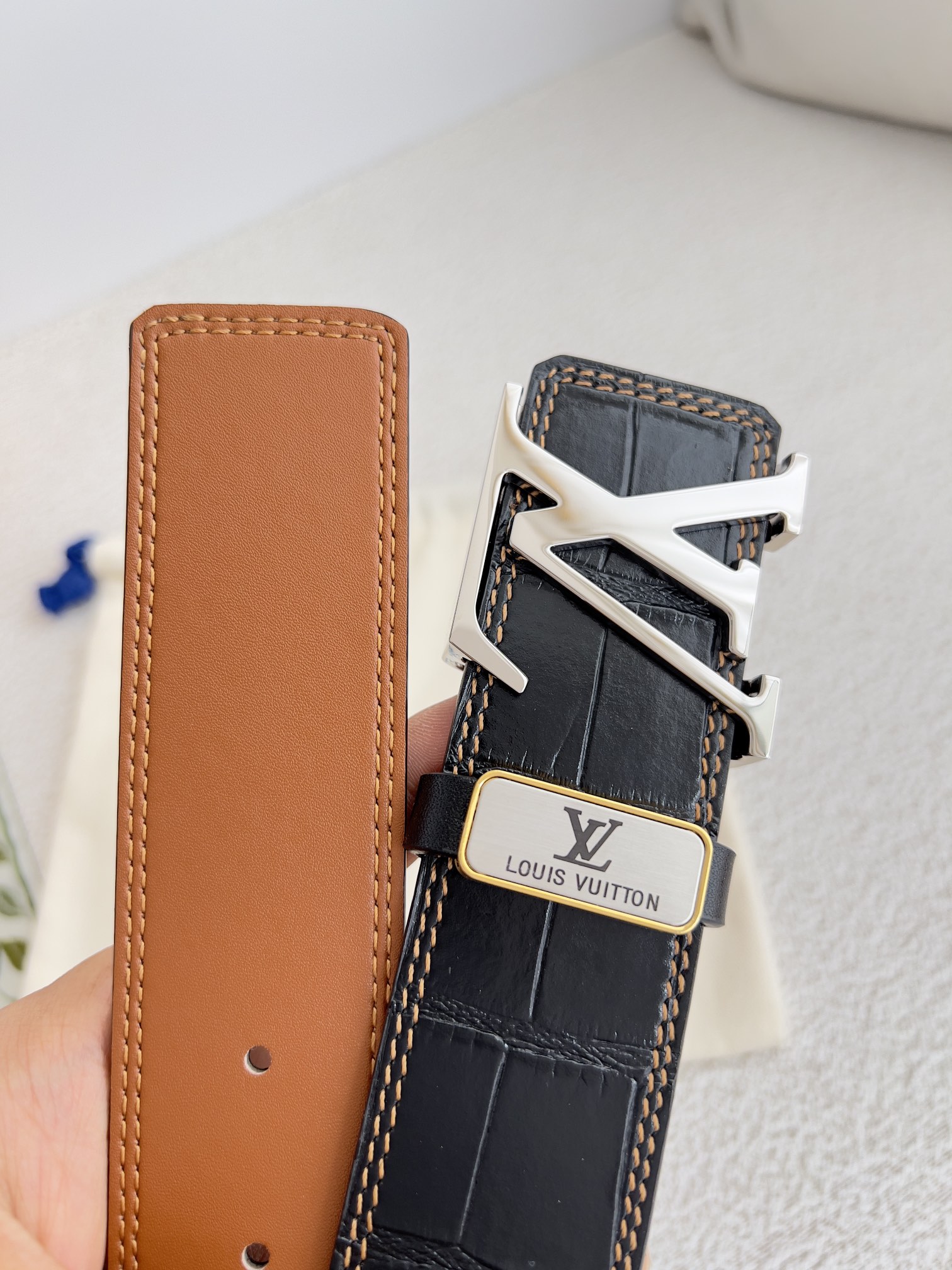 这款皮带是AAAAA 1:1 质量 (非常棒). 使用了和原版一模一样的材料. 商标部分也保持了和路易威登/Louis Vuitton一样. 图片拍摄是实物皮带拍摄, 您所收到的实物保证和我们图片一模一样.