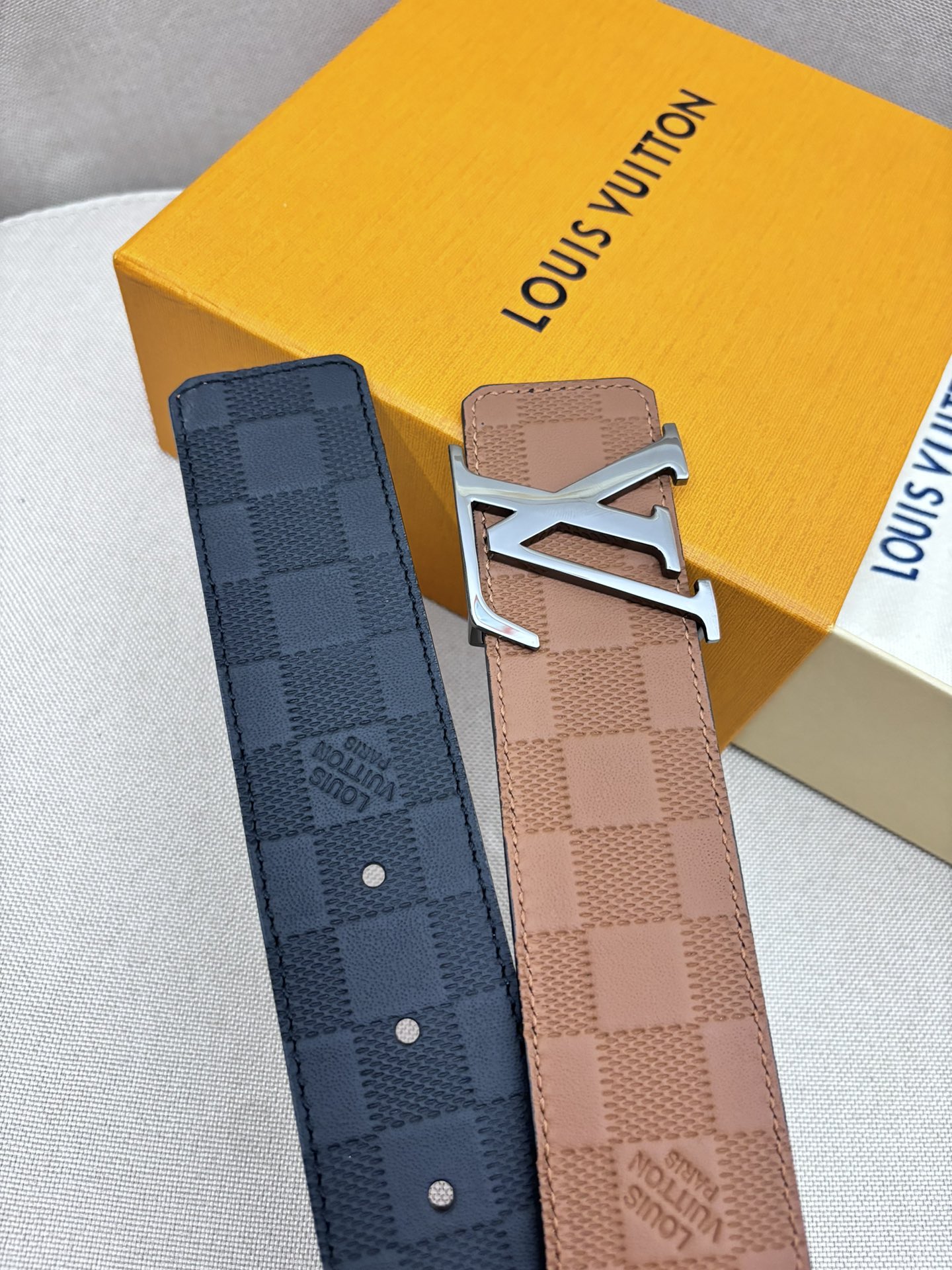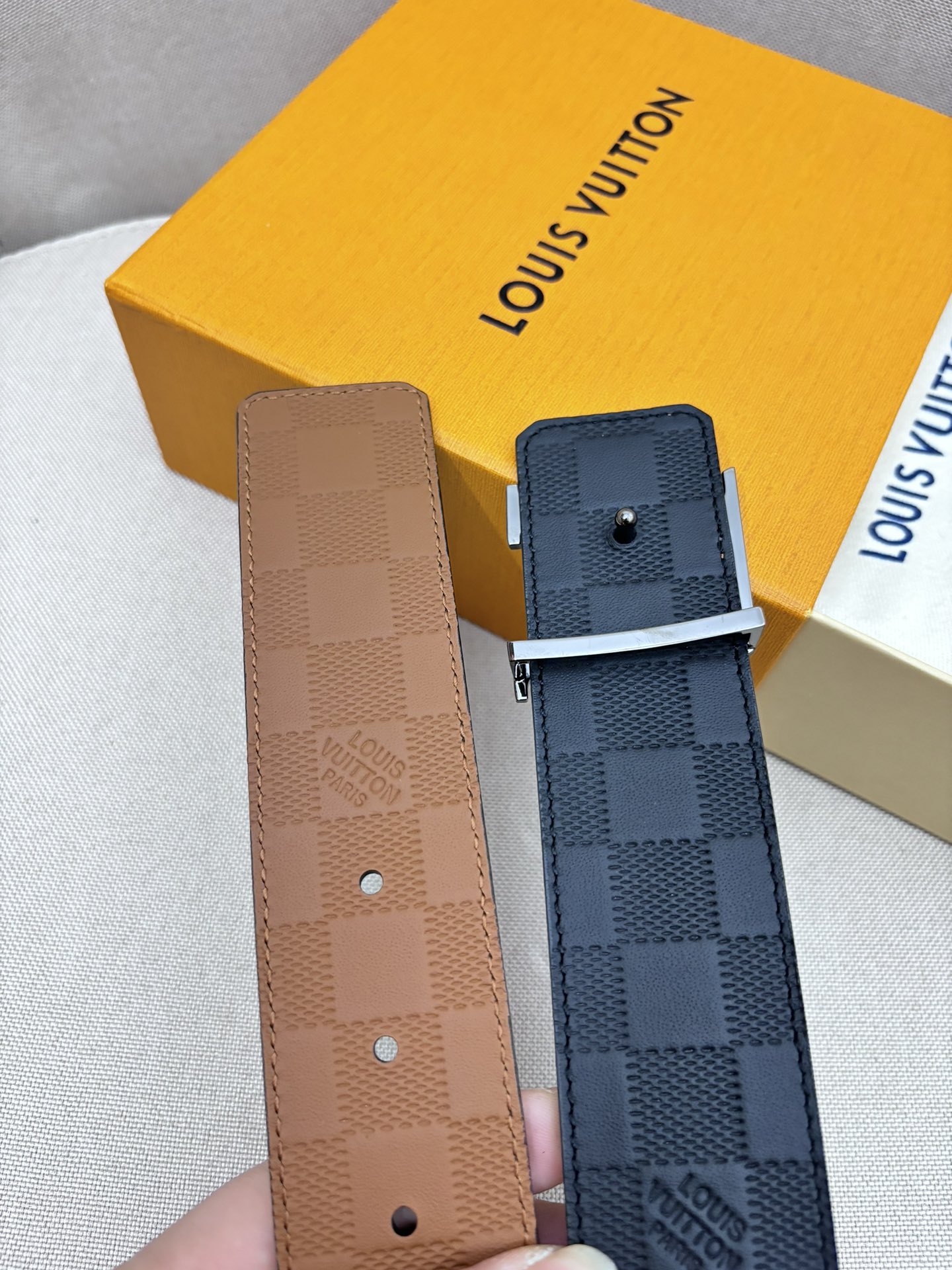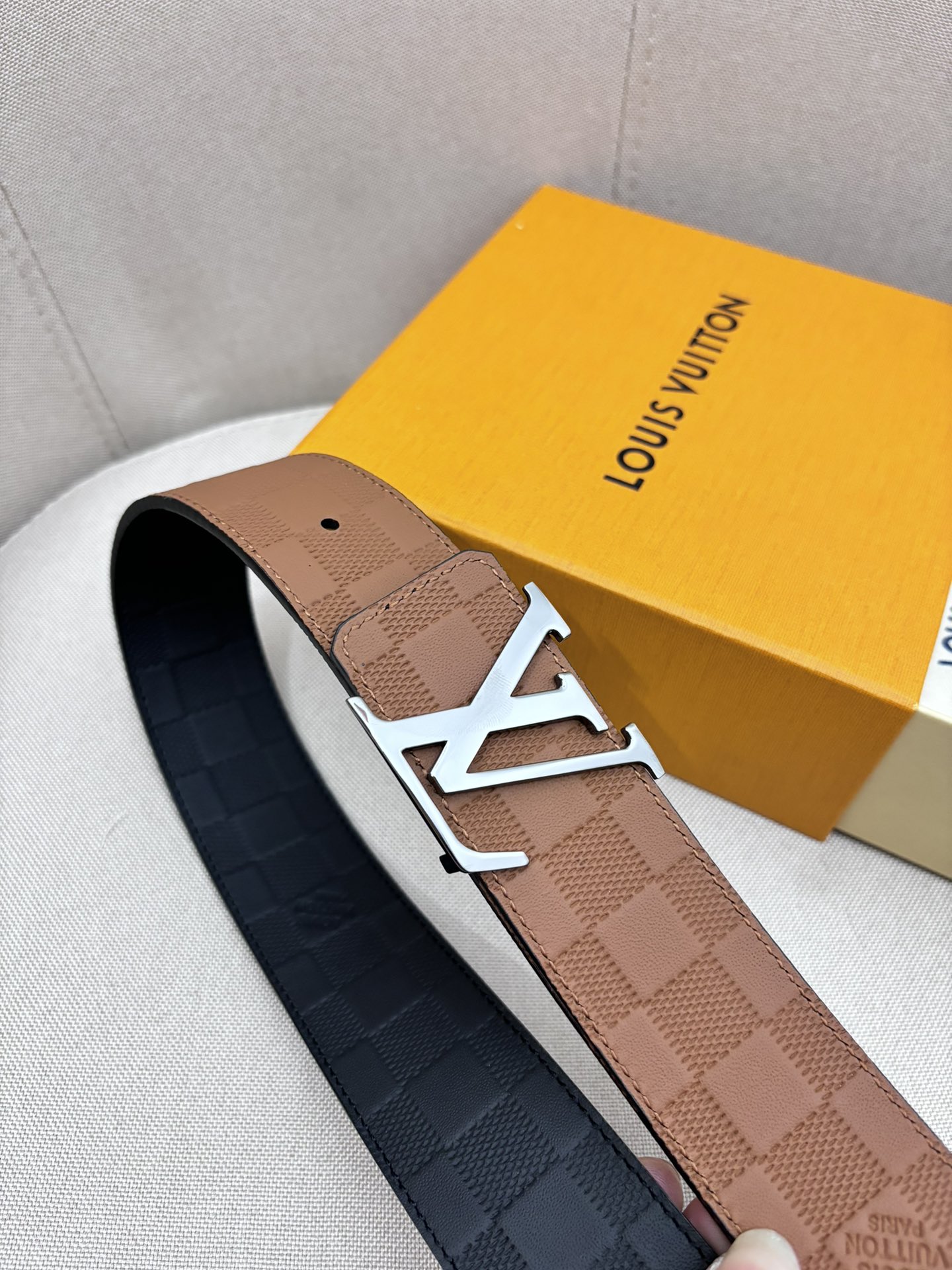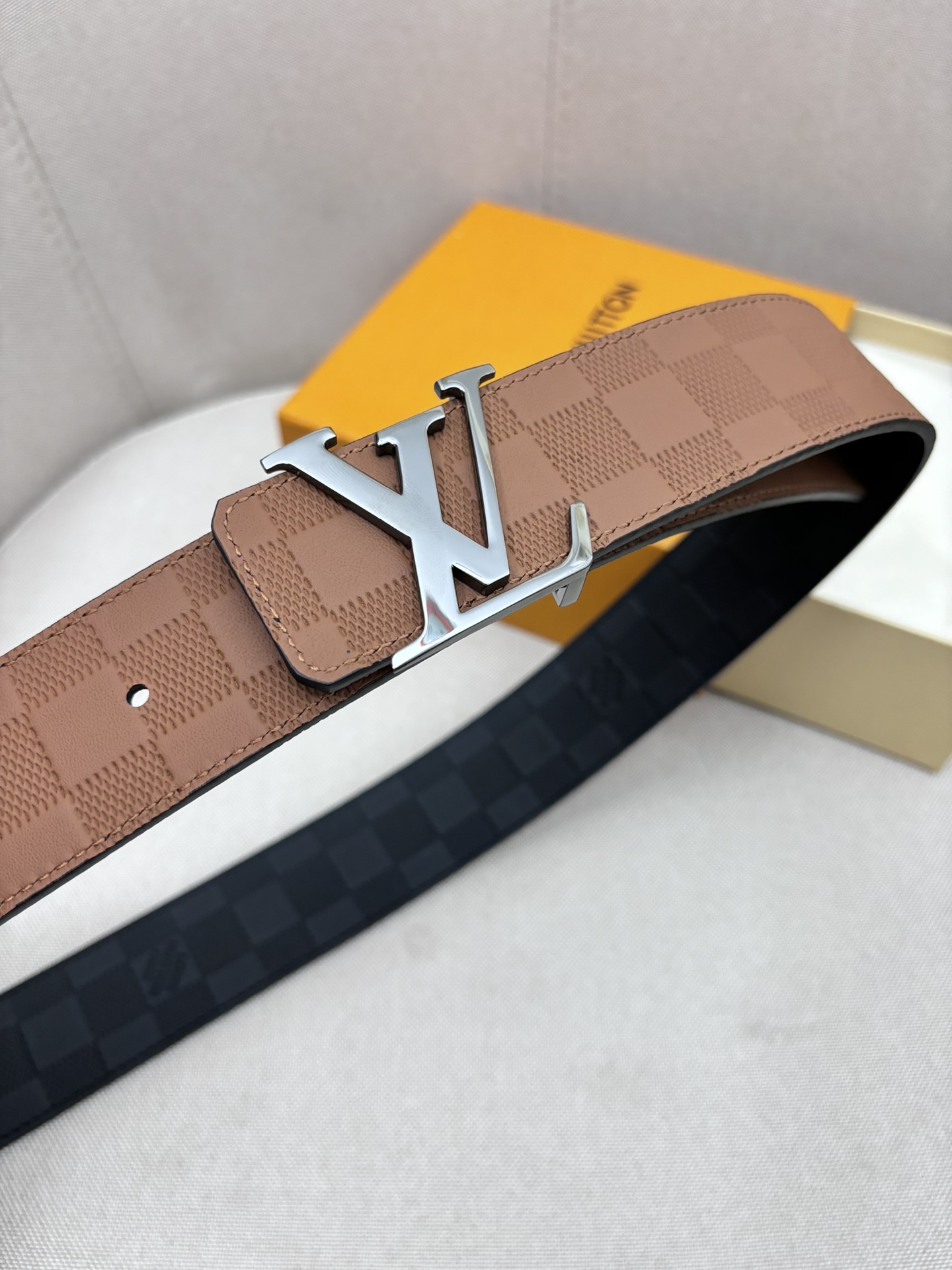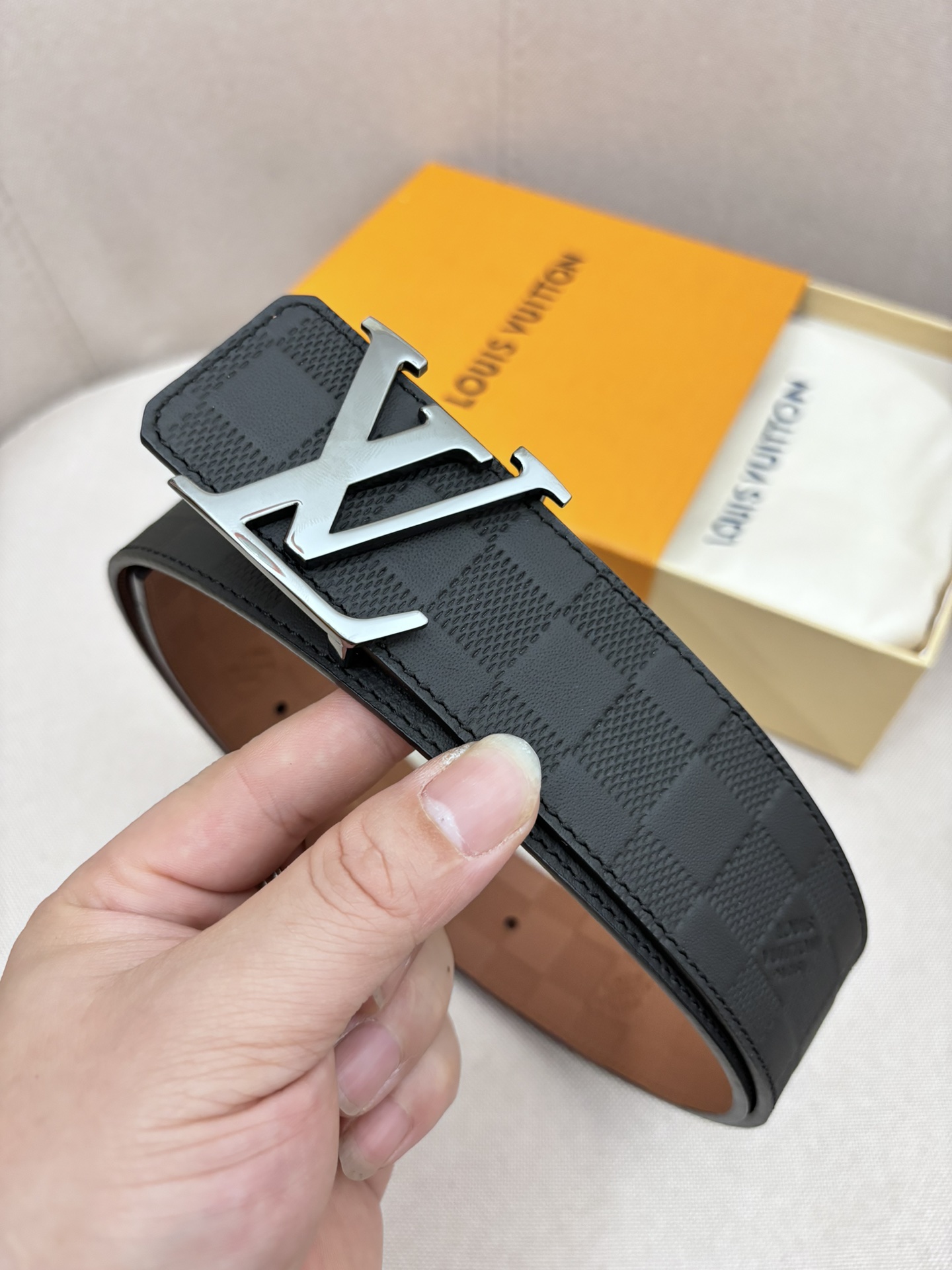 这款皮带是AAAAA 1:1 质量 (非常棒). 使用了和原版一模一样的材料. 商标部分也保持了和路易威登/Louis Vuitton一样. 图片拍摄是实物皮带拍摄, 您所收到的实物保证和我们图片一模一样.