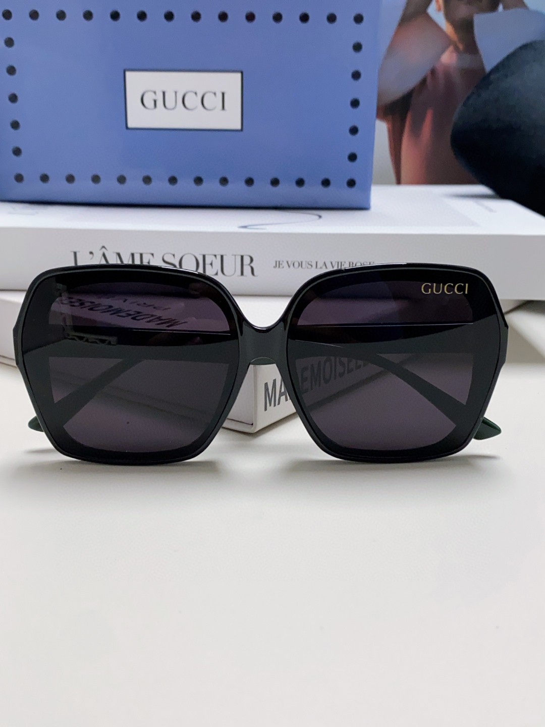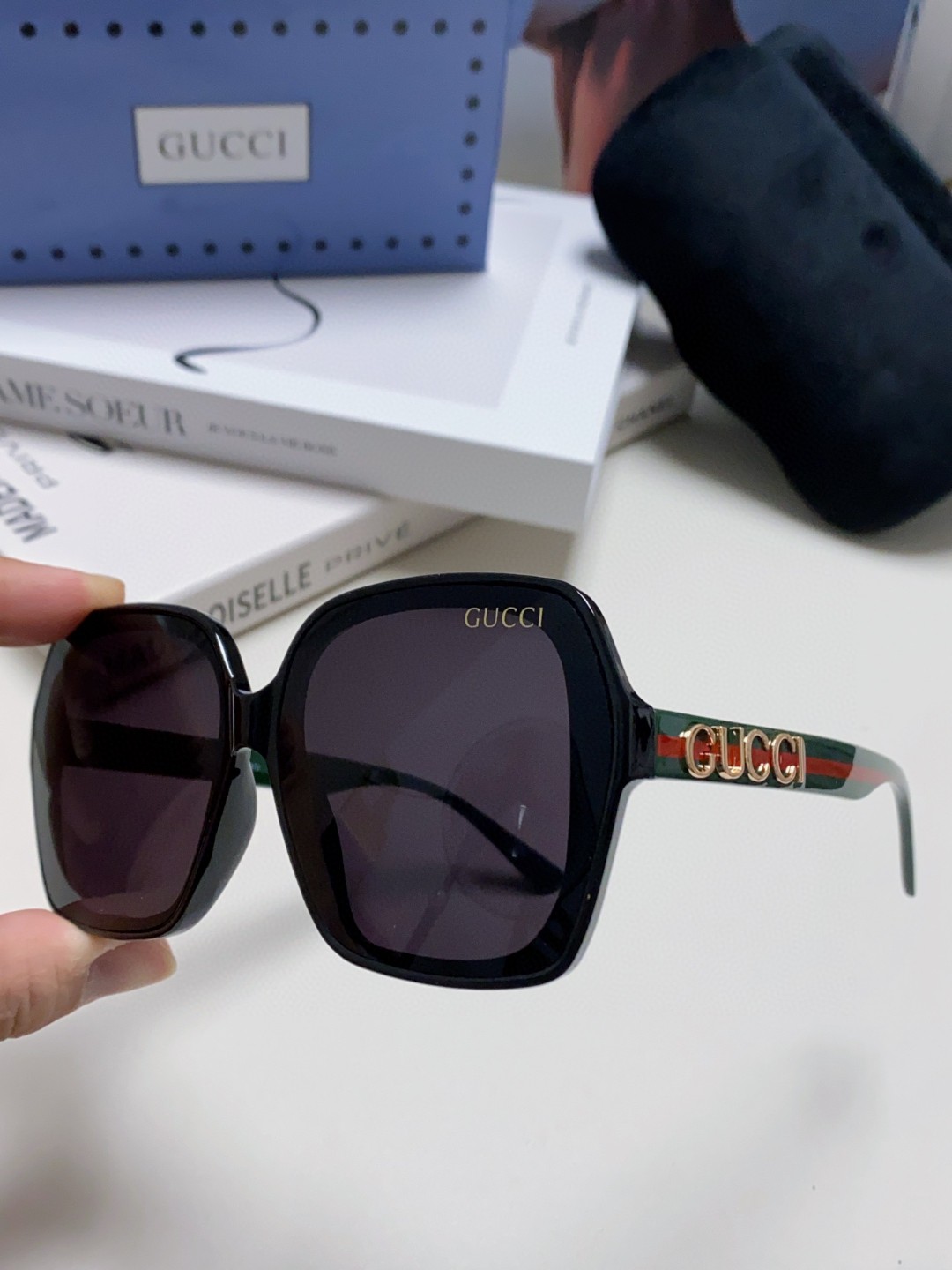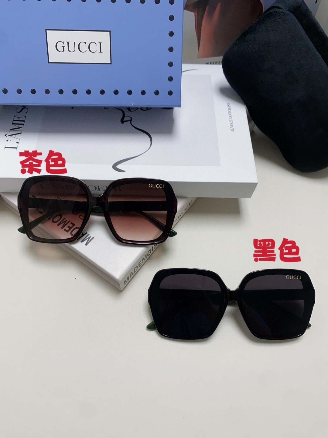这款太阳眼镜是AAAAA 1:1 质量 (非常棒). 使用了和原版一模一样的材料. 商标部分也保持了和古奇/Gucci一样. 图片拍摄是实物太阳眼镜拍摄, 您所收到的实物保证和我们图片一模一样.