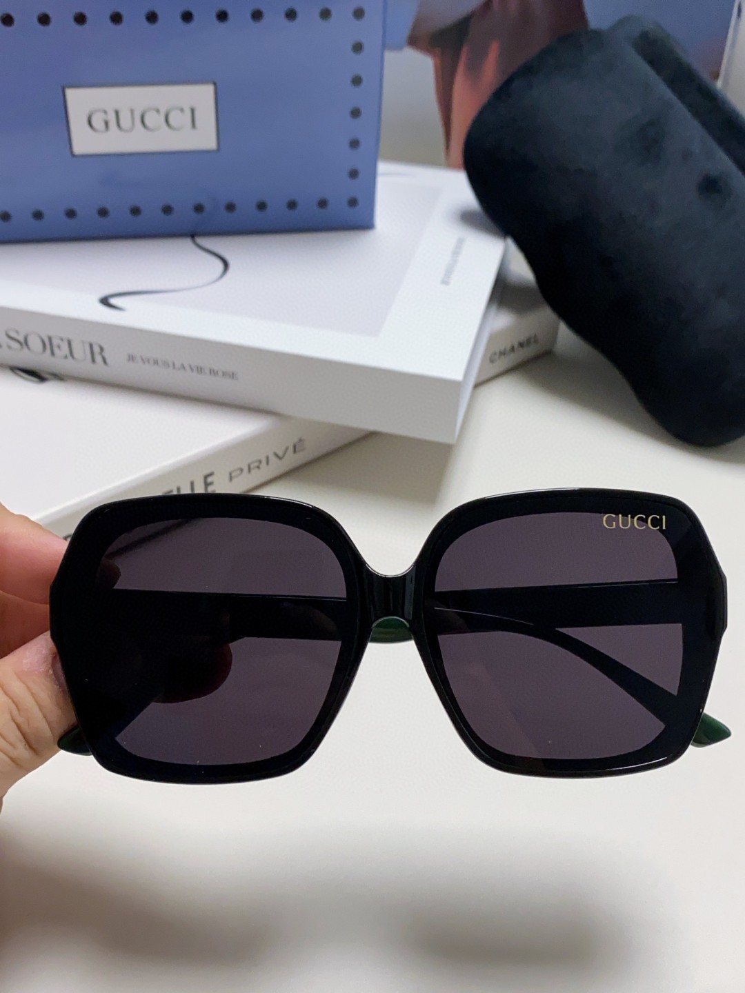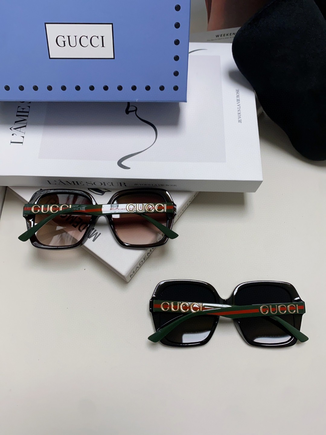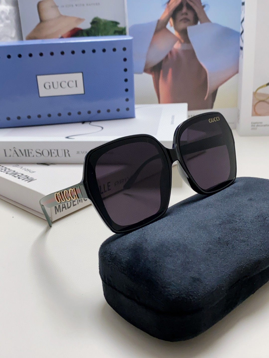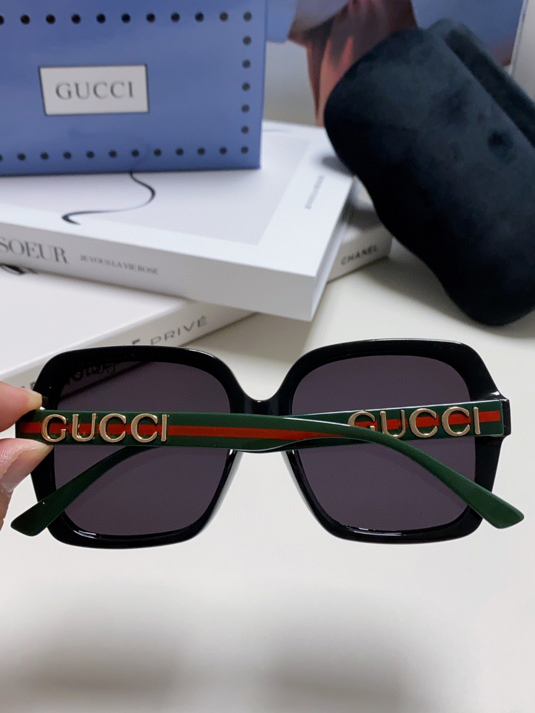 这款太阳眼镜是AAAAA 1:1 质量 (非常棒). 使用了和原版一模一样的材料. 商标部分也保持了和古奇/Gucci一样. 图片拍摄是实物太阳眼镜拍摄, 您所收到的实物保证和我们图片一模一样.