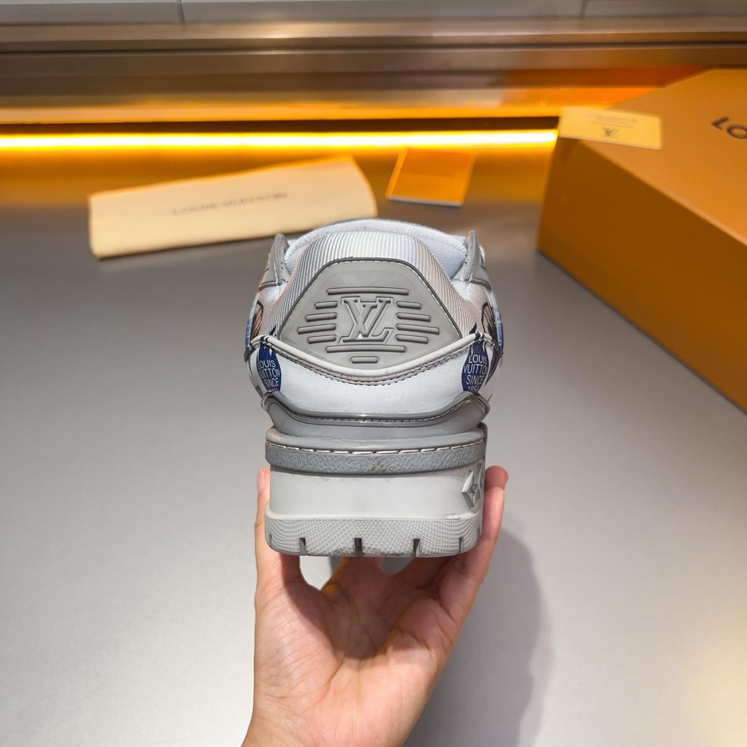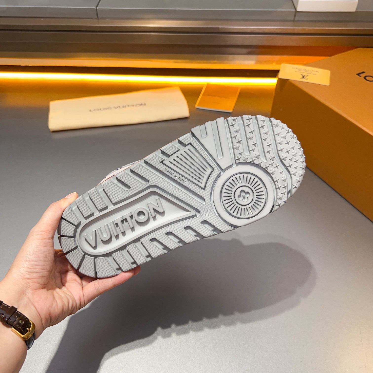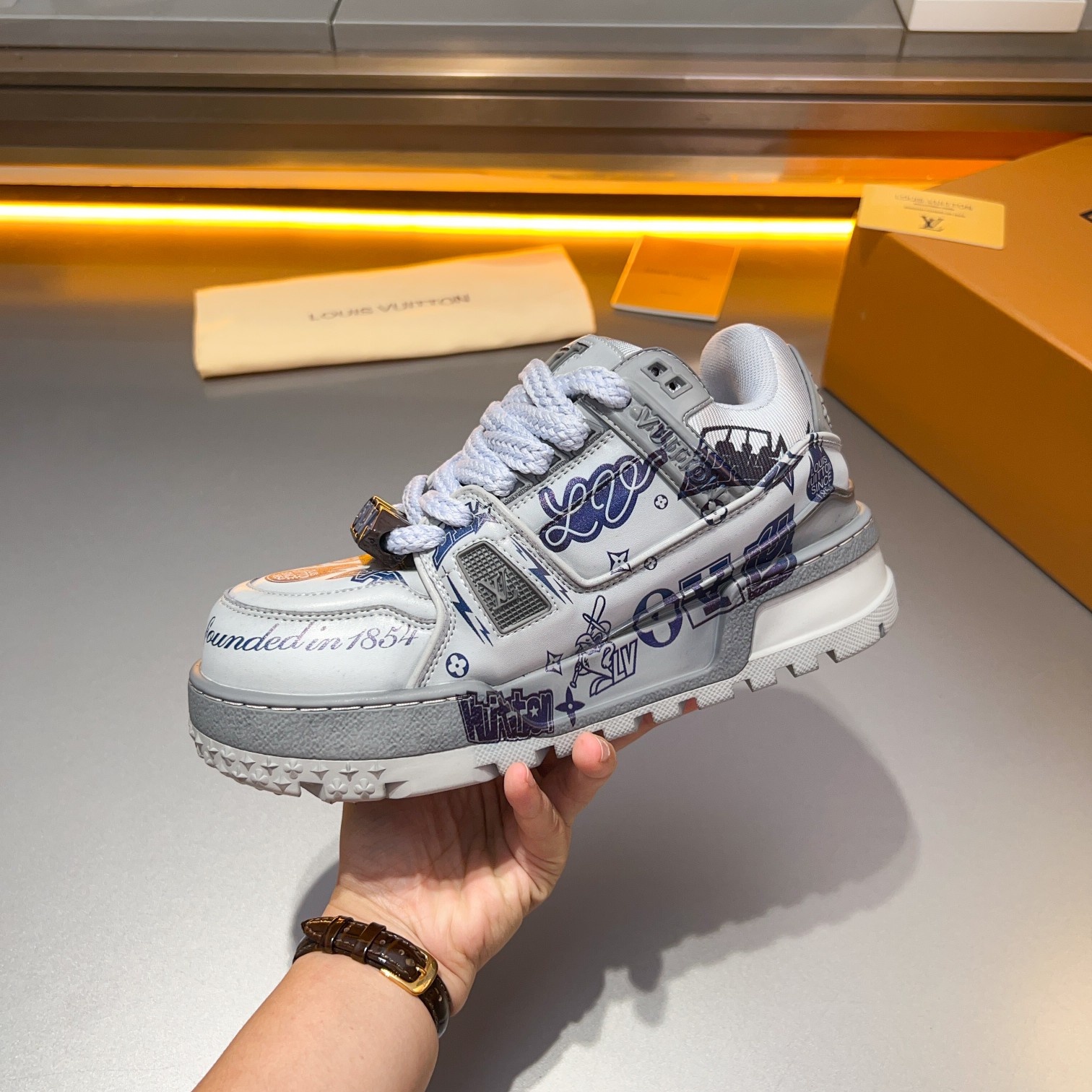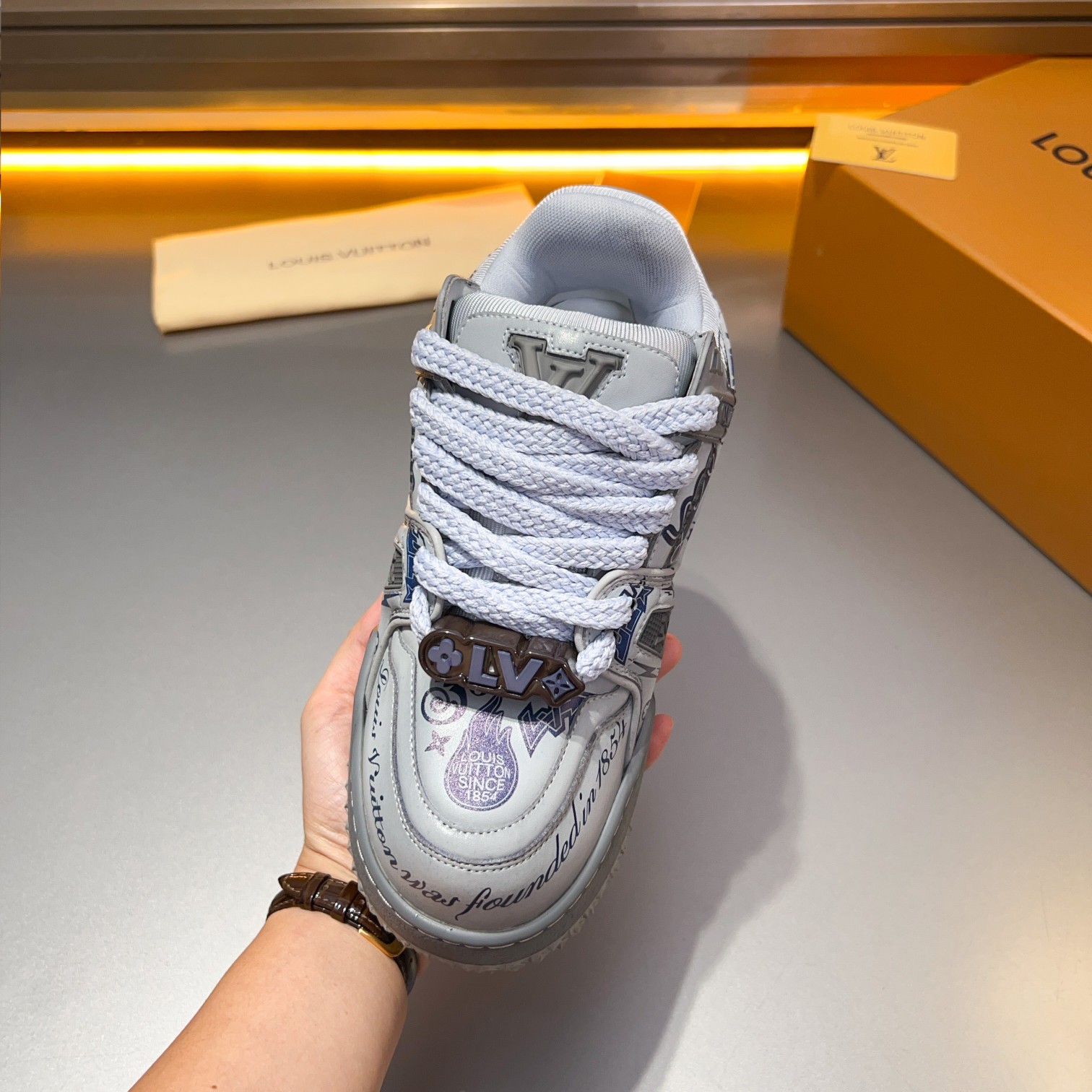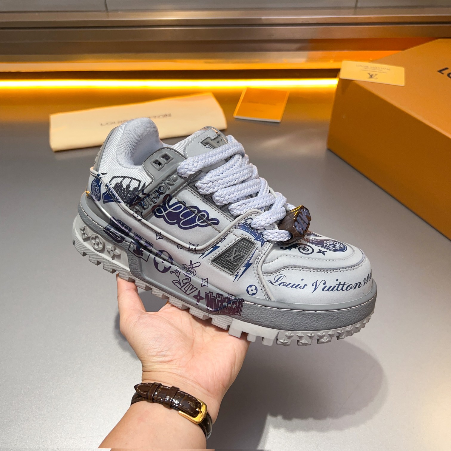 这款鞋子是AAAAA 1:1 质量 (非常棒). 使用了和原版一模一样的材料. 商标部分也保持了和路易威登/Louis Vuitton一样. 图片拍摄是实物鞋子拍摄, 您所收到的实物保证和我们图片一模一样.