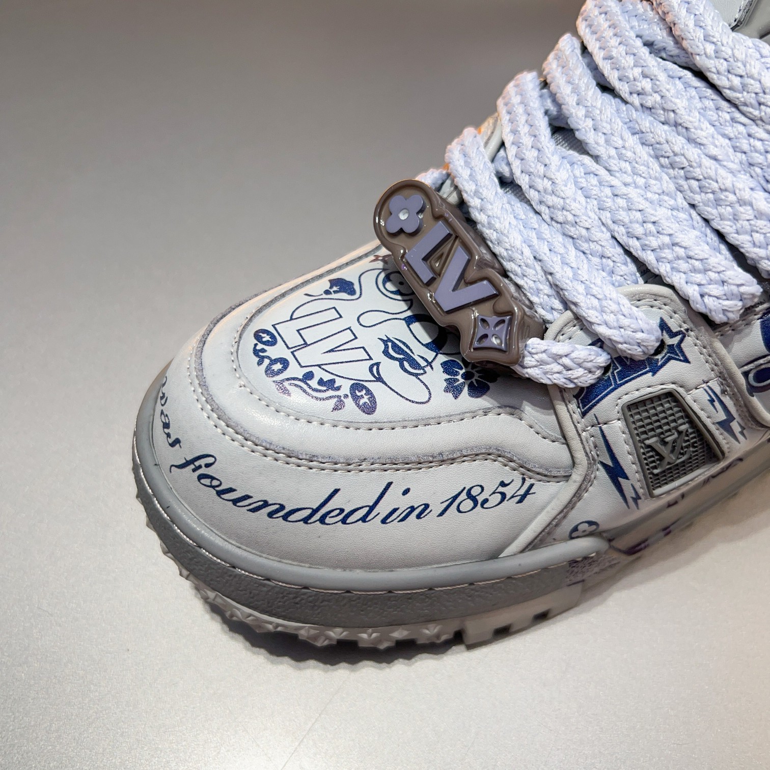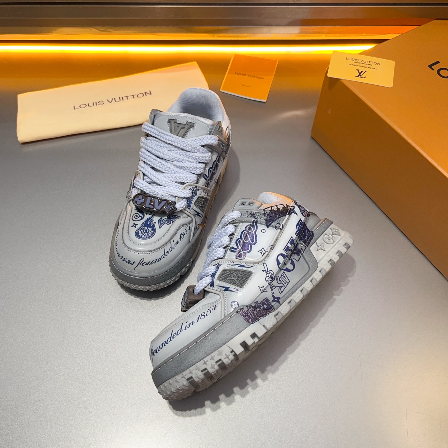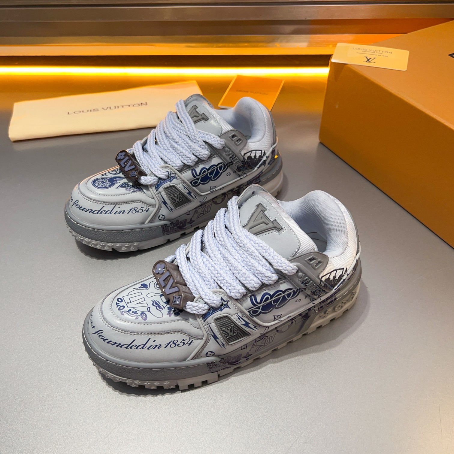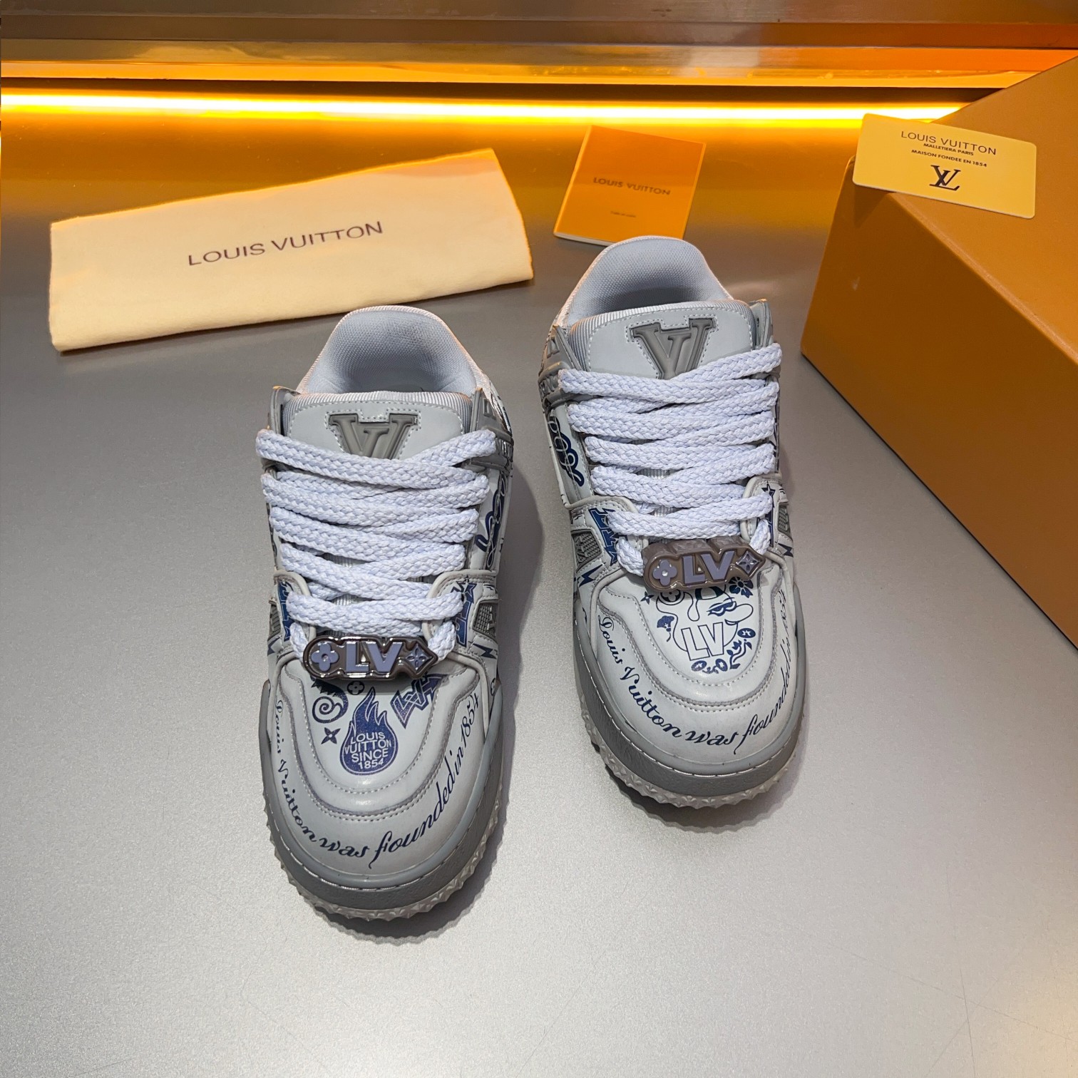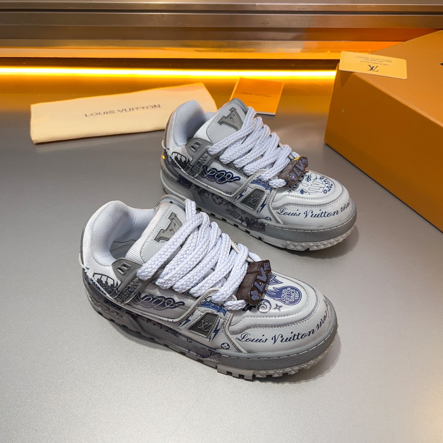 这款鞋子是AAAAA 1:1 质量 (非常棒). 使用了和原版一模一样的材料. 商标部分也保持了和路易威登/Louis Vuitton一样. 图片拍摄是实物鞋子拍摄, 您所收到的实物保证和我们图片一模一样.