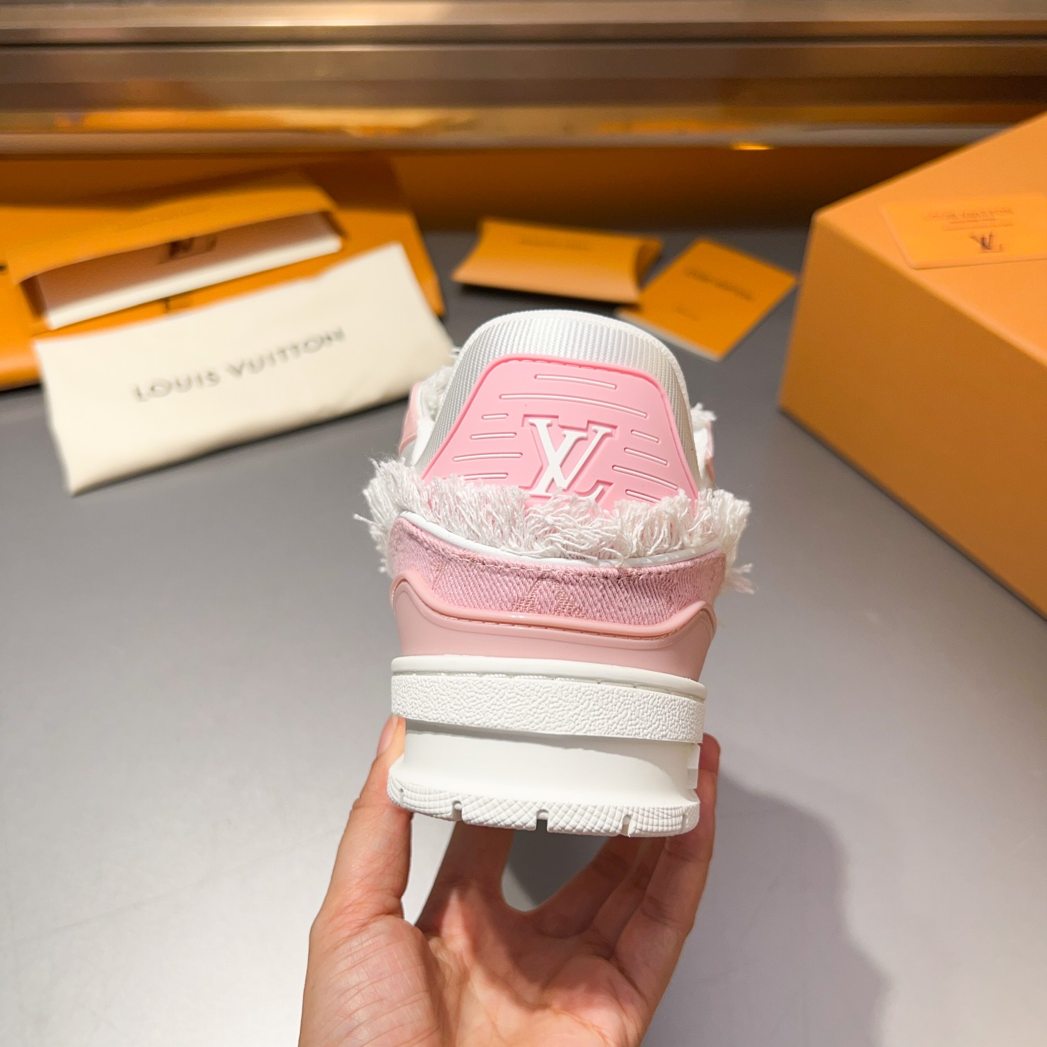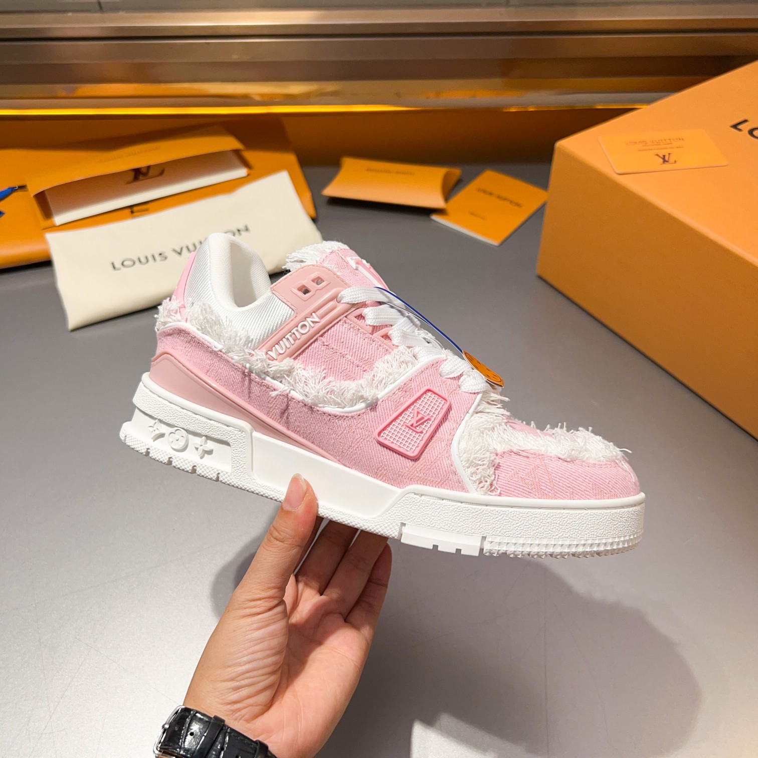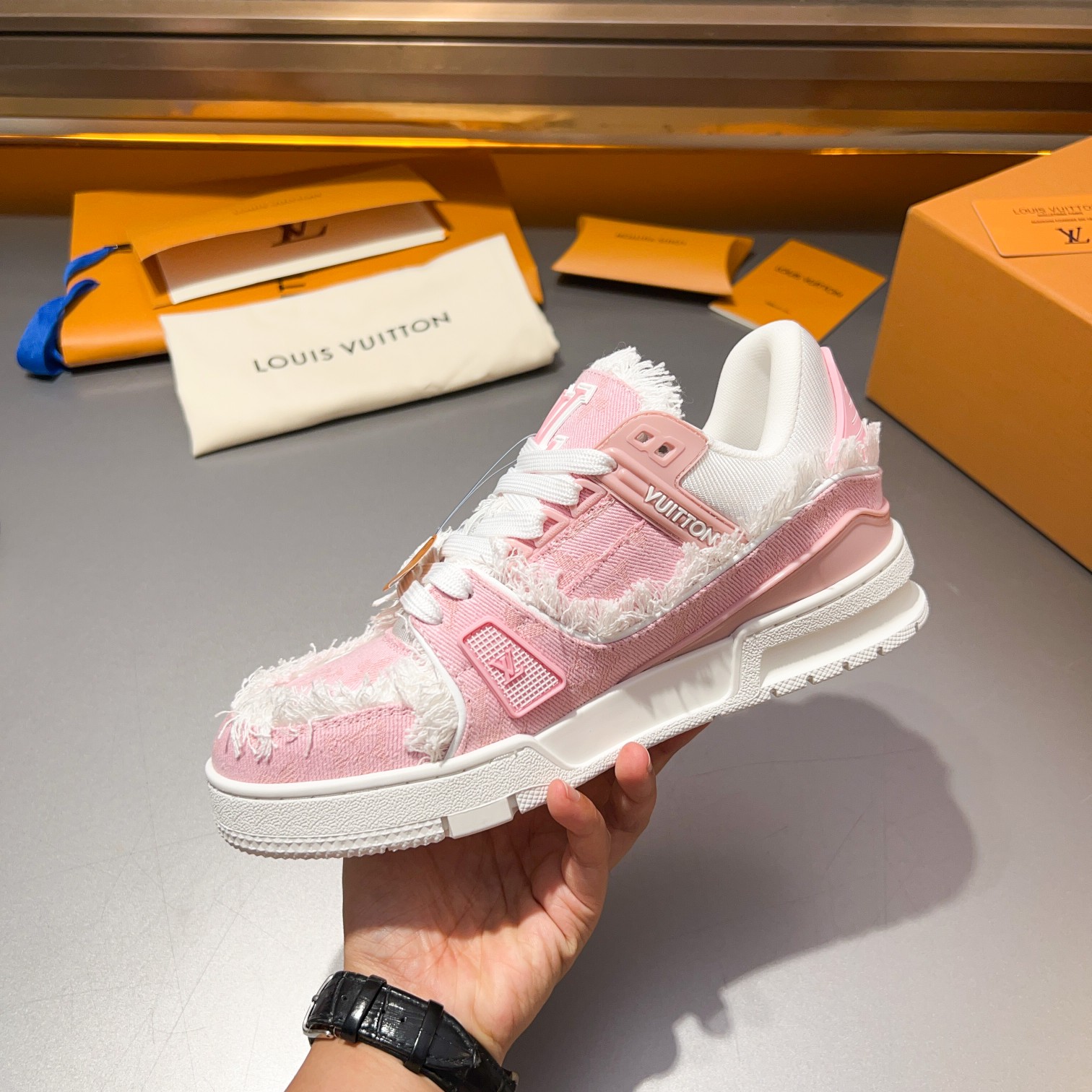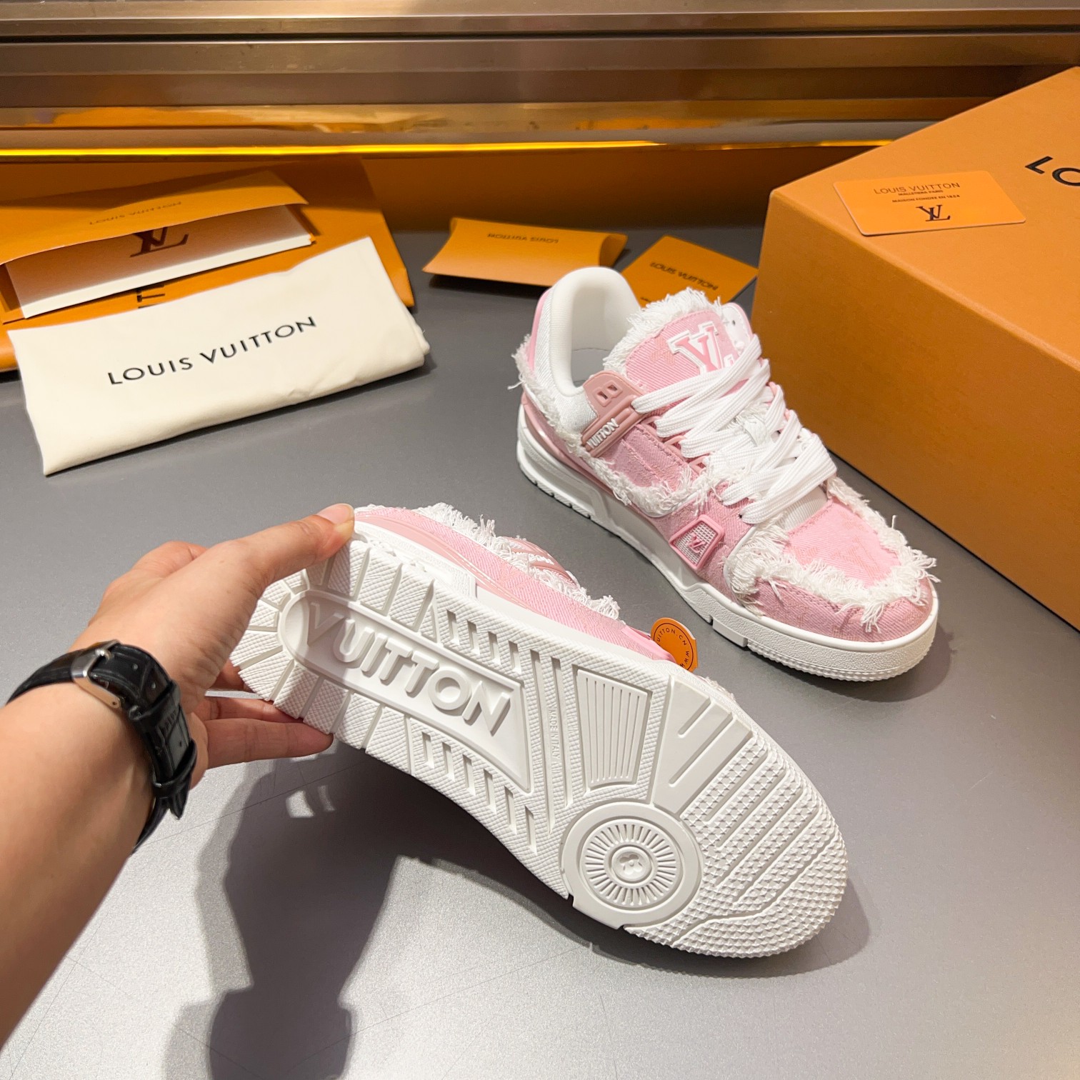 这款鞋子是AAAAA 1:1 质量 (非常棒). 使用了和原版一模一样的材料. 商标部分也保持了和路易威登/Louis Vuitton一样. 图片拍摄是实物鞋子拍摄, 您所收到的实物保证和我们图片一模一样.