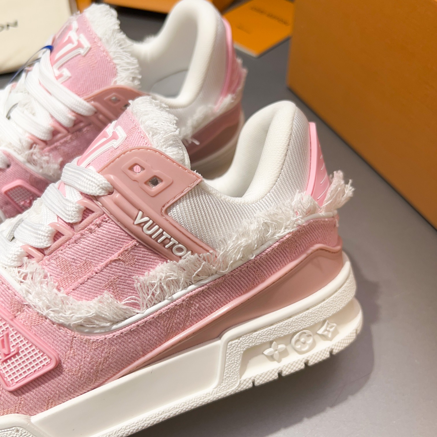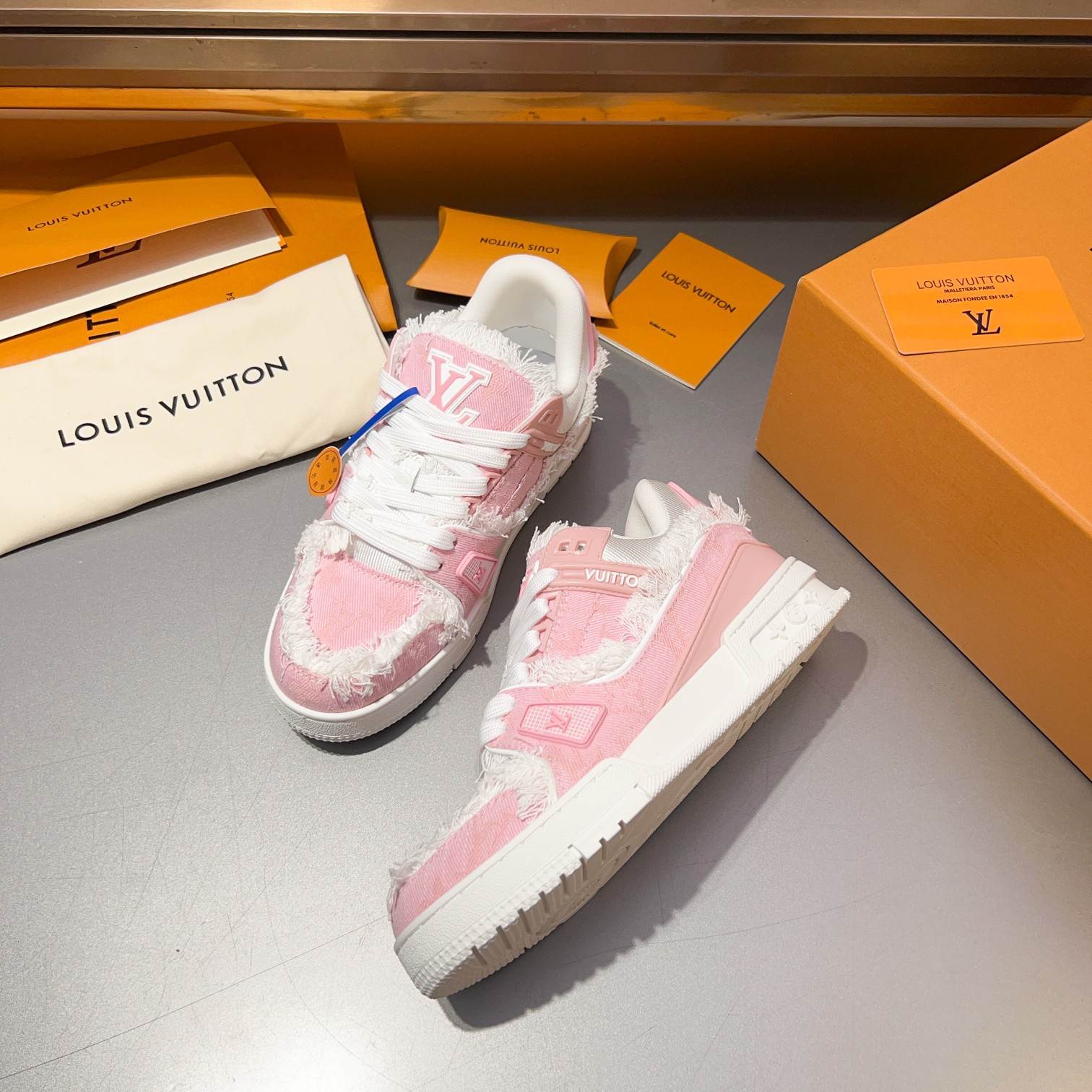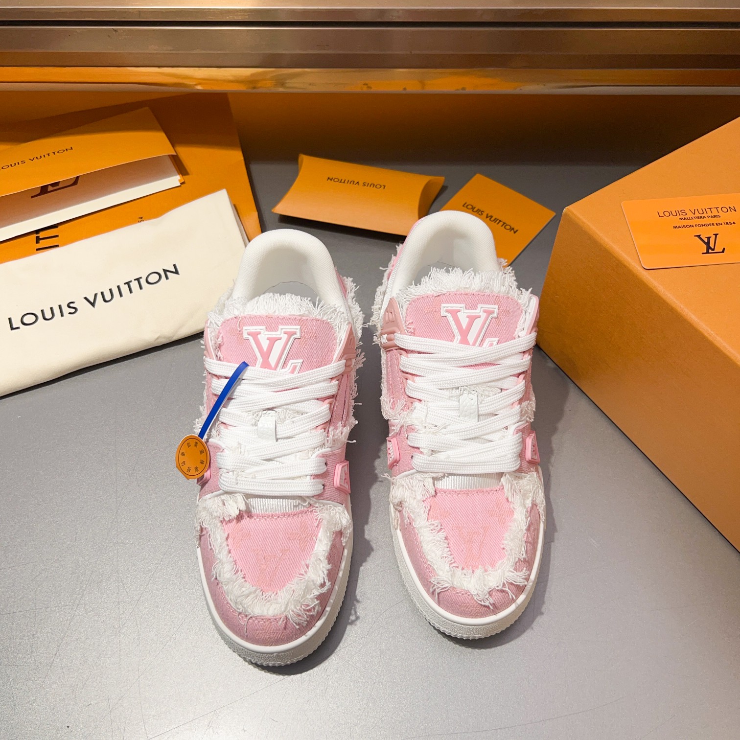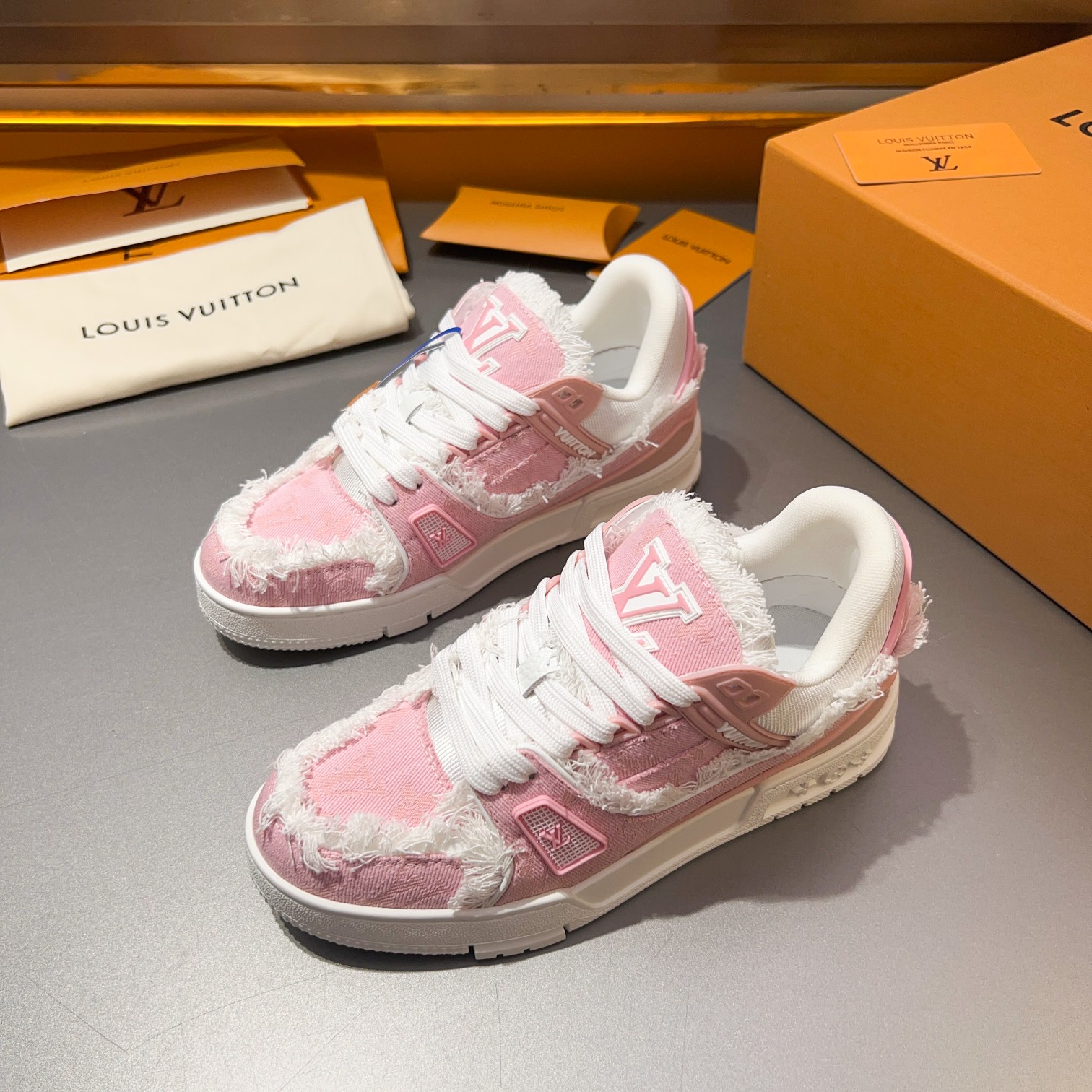 这款鞋子是AAAAA 1:1 质量 (非常棒). 使用了和原版一模一样的材料. 商标部分也保持了和路易威登/Louis Vuitton一样. 图片拍摄是实物鞋子拍摄, 您所收到的实物保证和我们图片一模一样.