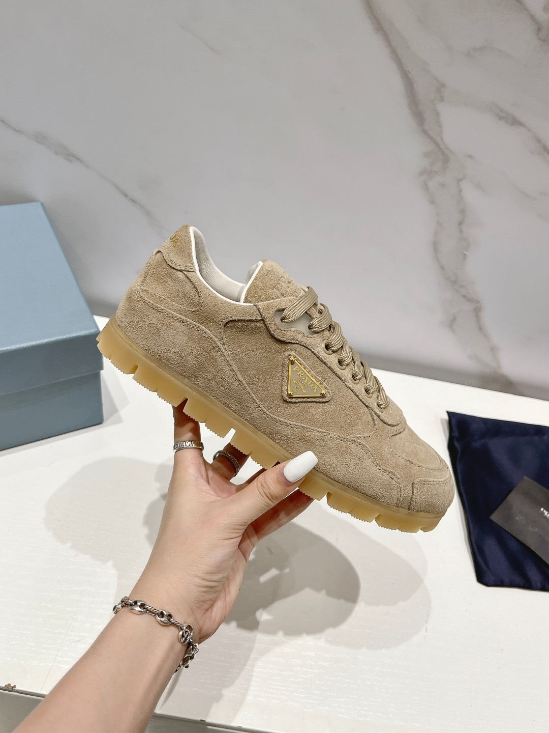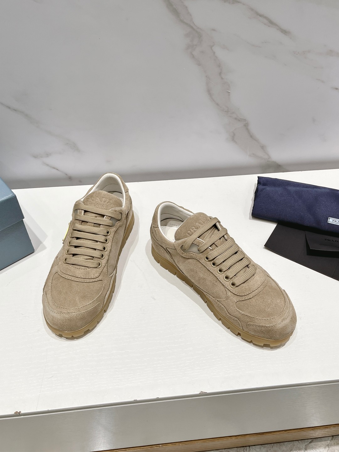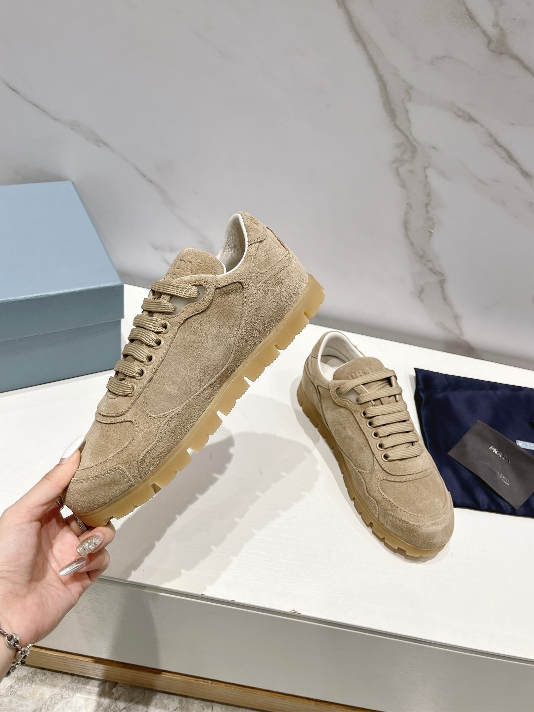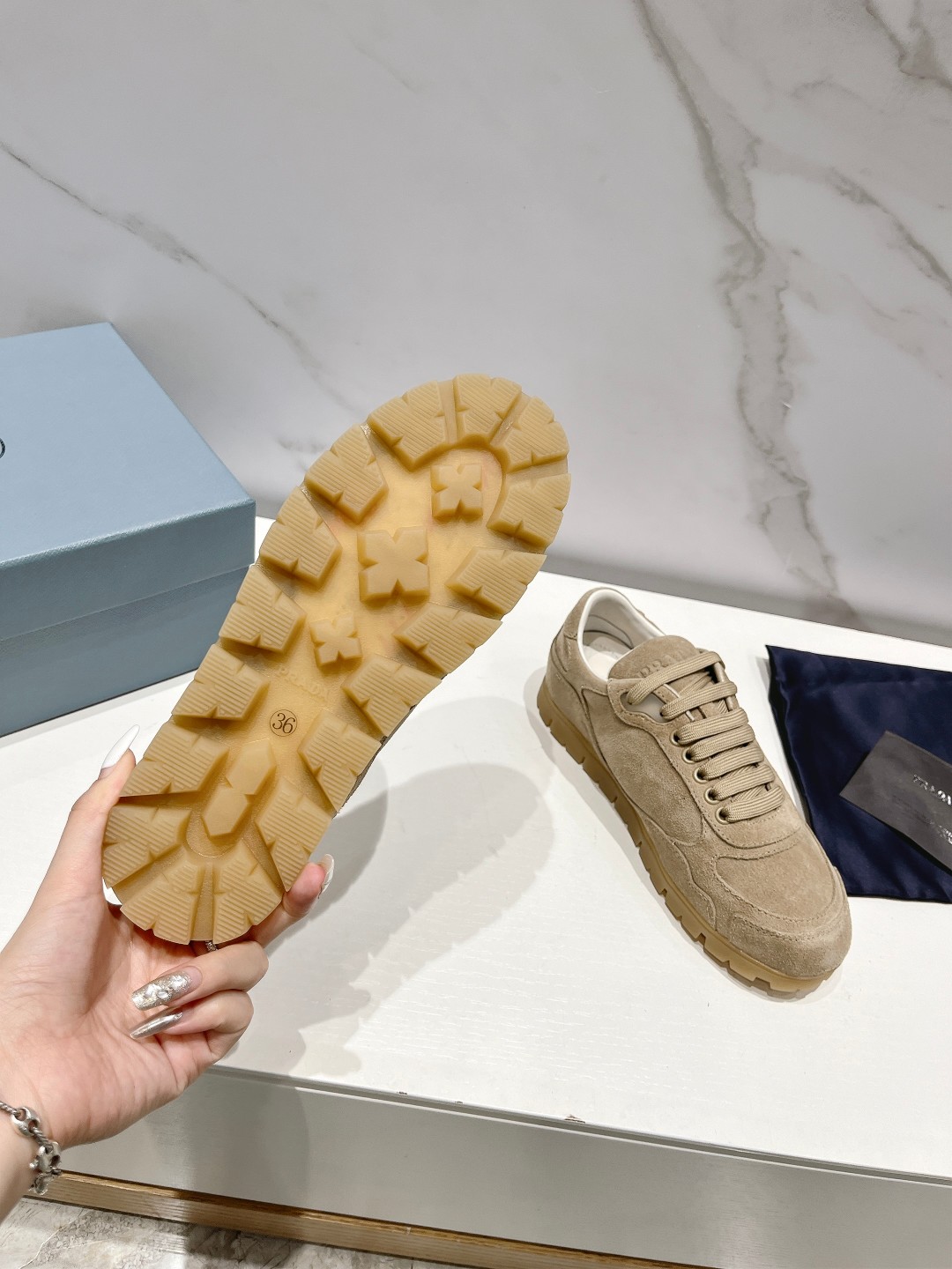 这款鞋子是AAAAA 1:1 质量 (非常棒). 使用了和原版一模一样的材料. 商标部分也保持了和普拉达/Prada一样. 图片拍摄是实物鞋子拍摄, 您所收到的实物保证和我们图片一模一样.