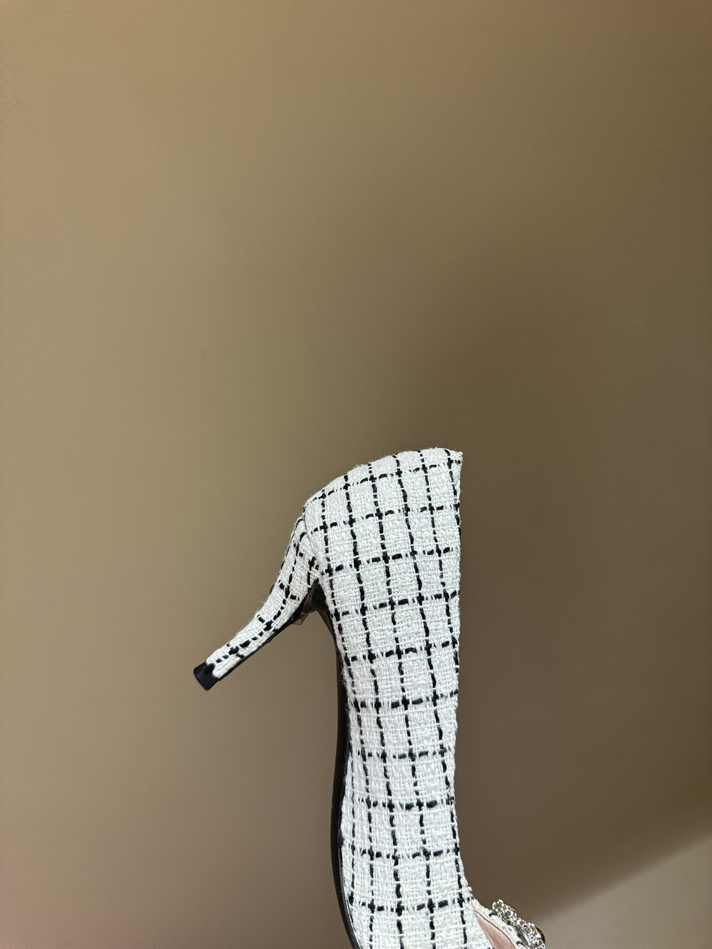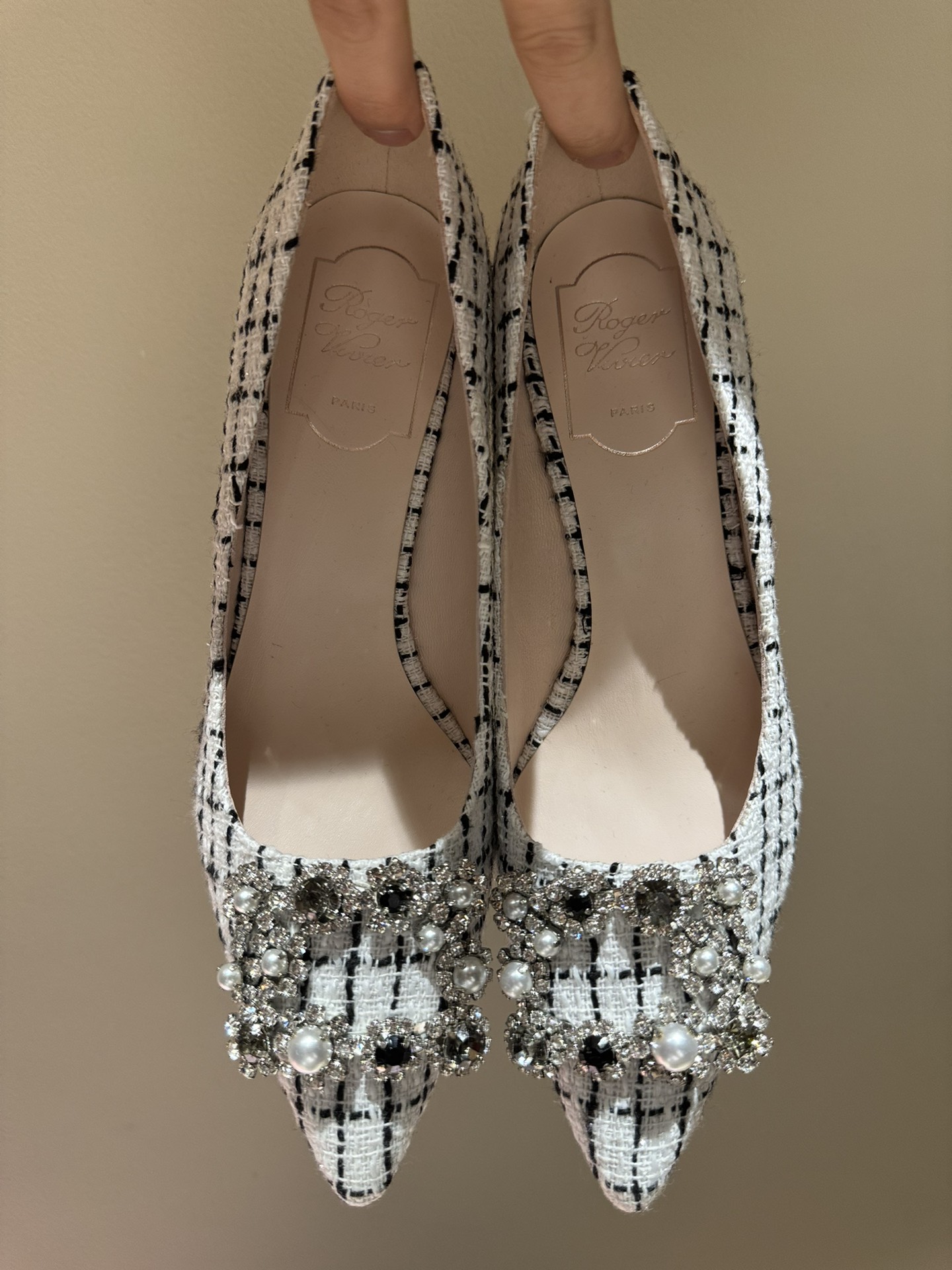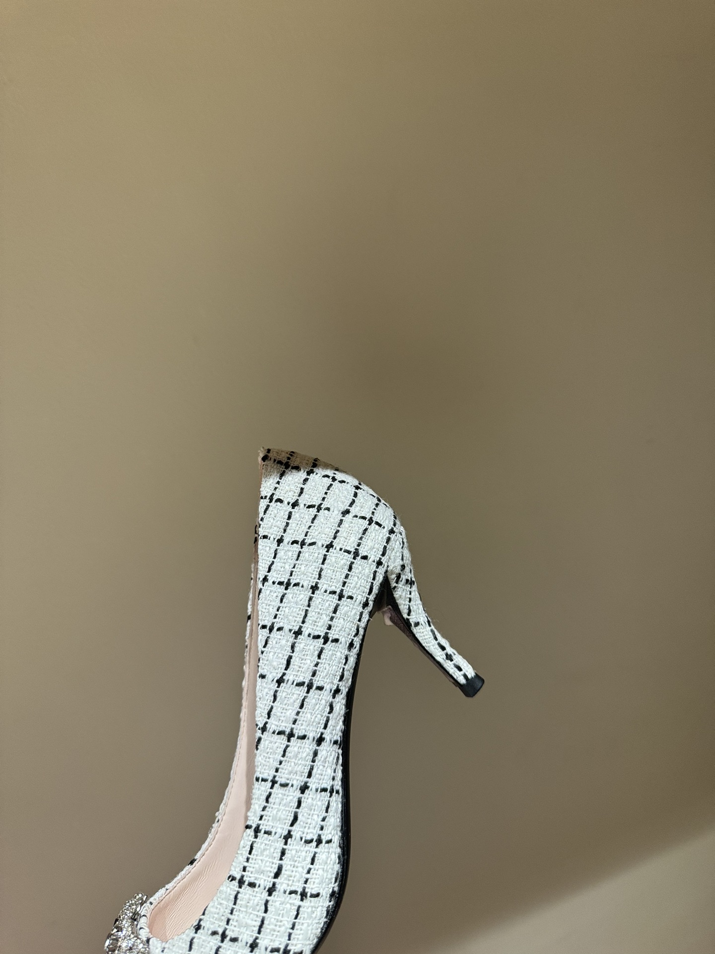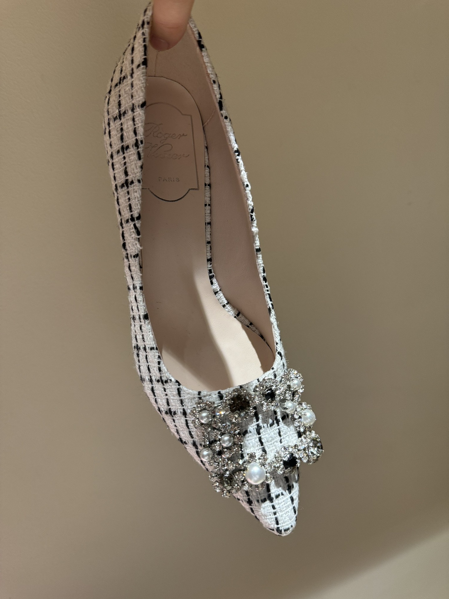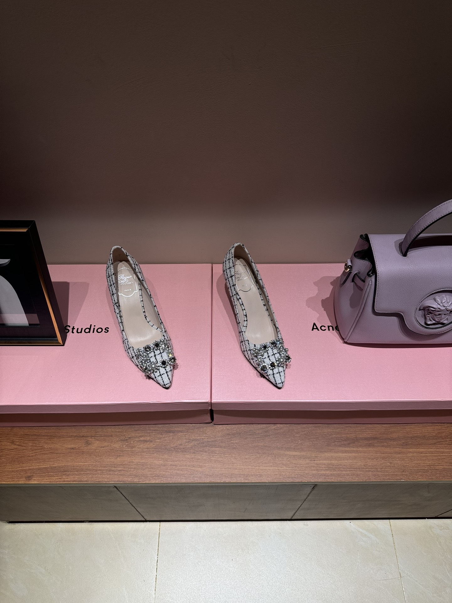 这款鞋子是AAAAA 1:1 质量 (非常棒). 使用了和原版一模一样的材料. 商标部分也保持了和罗杰维维耶/Roger Vivier一样. 图片拍摄是实物鞋子拍摄, 您所收到的实物保证和我们图片一模一样.