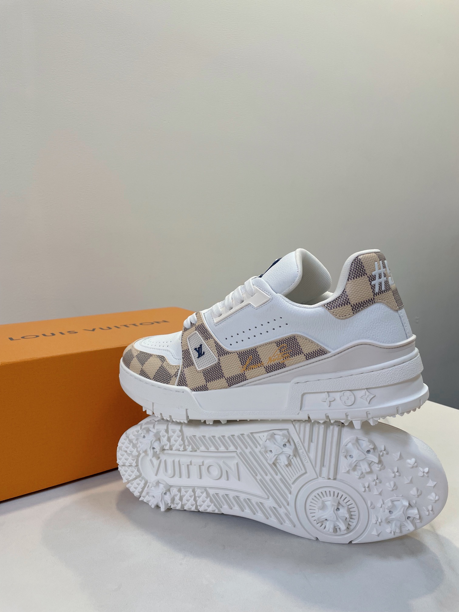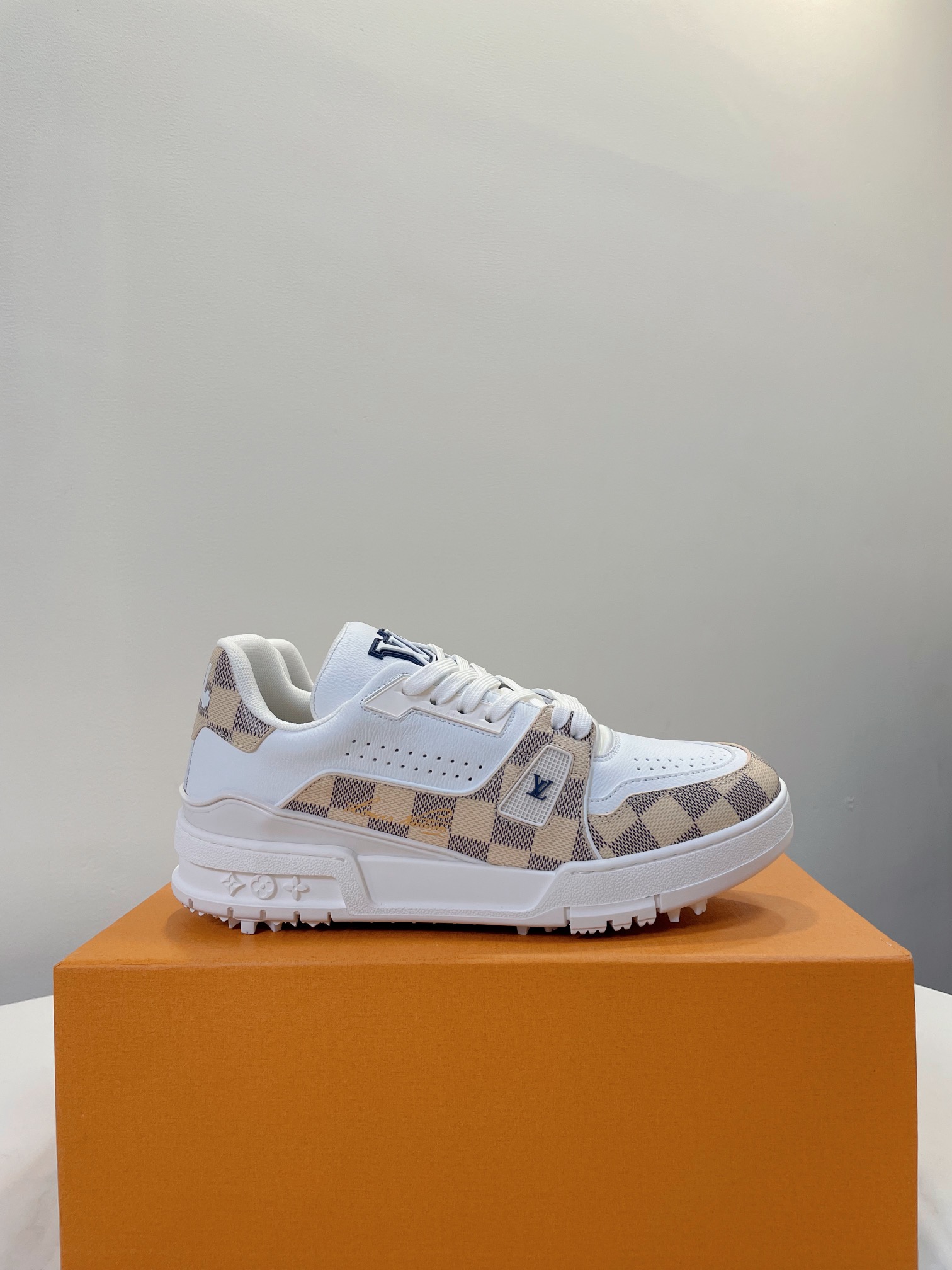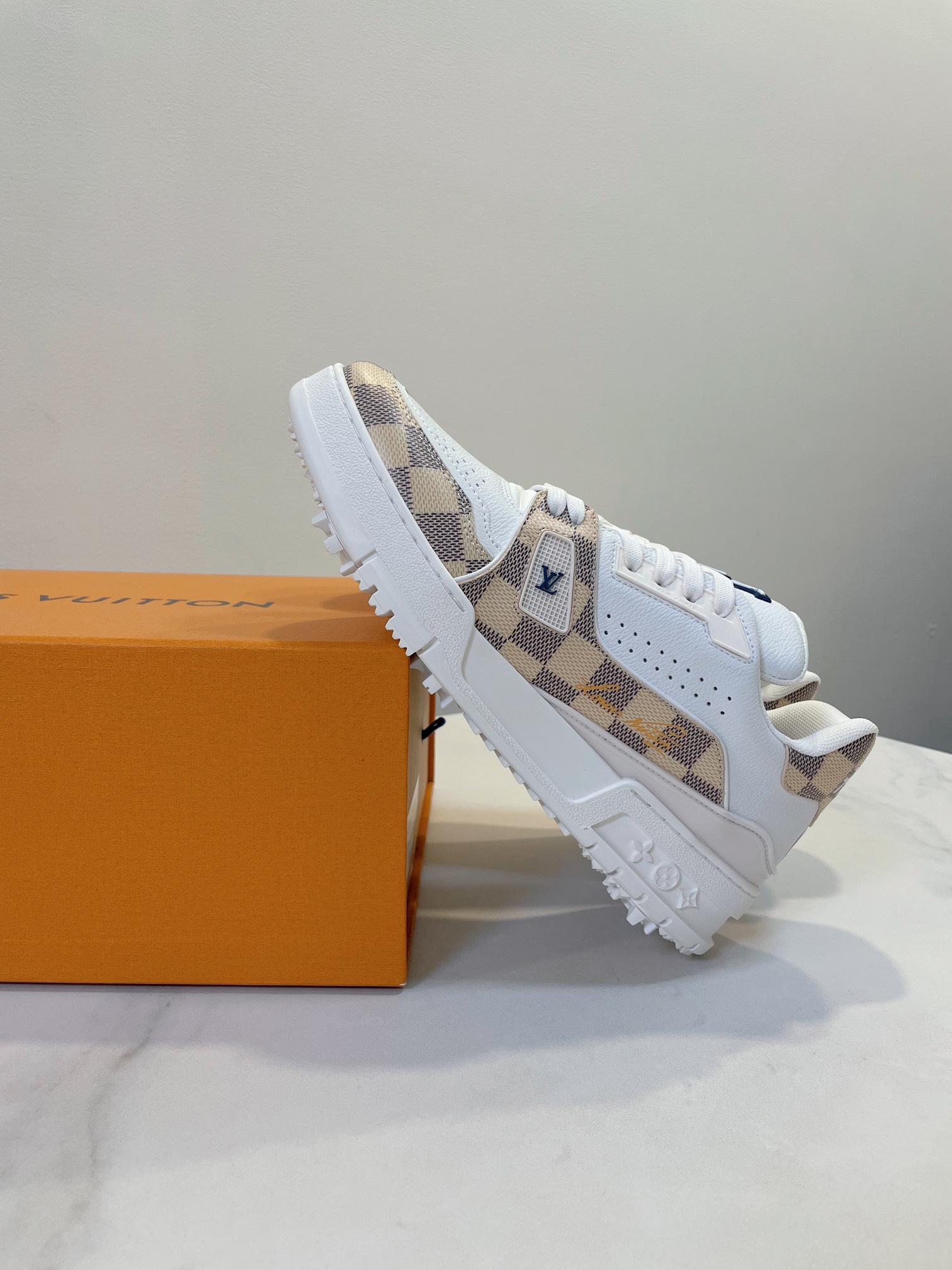 这款鞋子是AAAAA 1:1 质量 (非常棒). 使用了和原版一模一样的材料. 商标部分也保持了和路易威登/Louis Vuitton一样. 图片拍摄是实物鞋子拍摄, 您所收到的实物保证和我们图片一模一样.