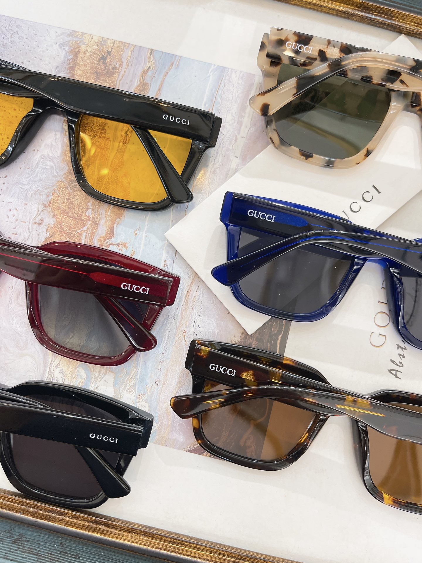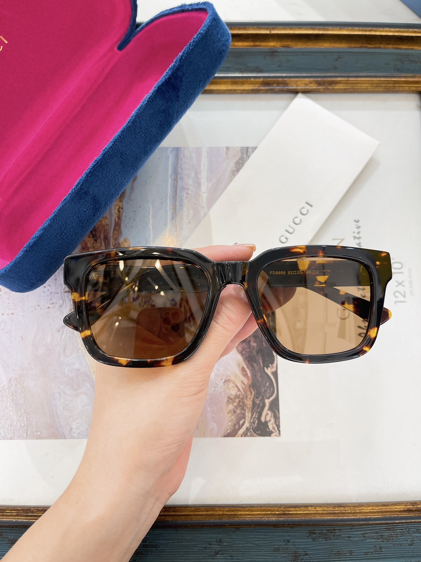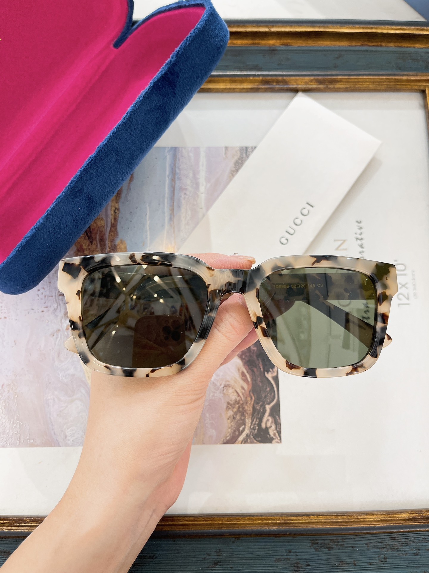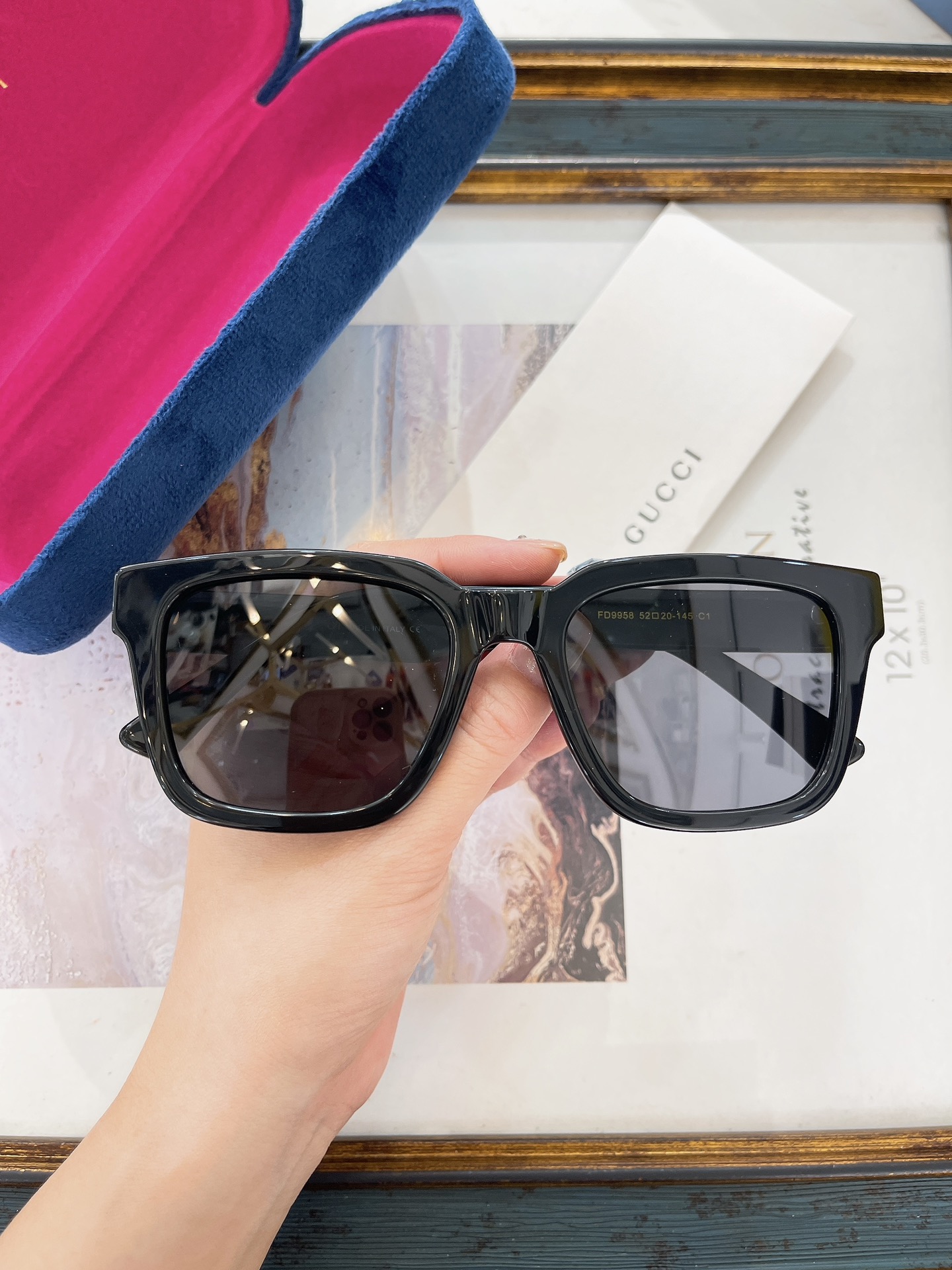 这款太阳眼镜是AAAAA 1:1 质量 (非常棒). 使用了和原版一模一样的材料. 商标部分也保持了和古奇/Gucci一样. 图片拍摄是实物太阳眼镜拍摄, 您所收到的实物保证和我们图片一模一样.