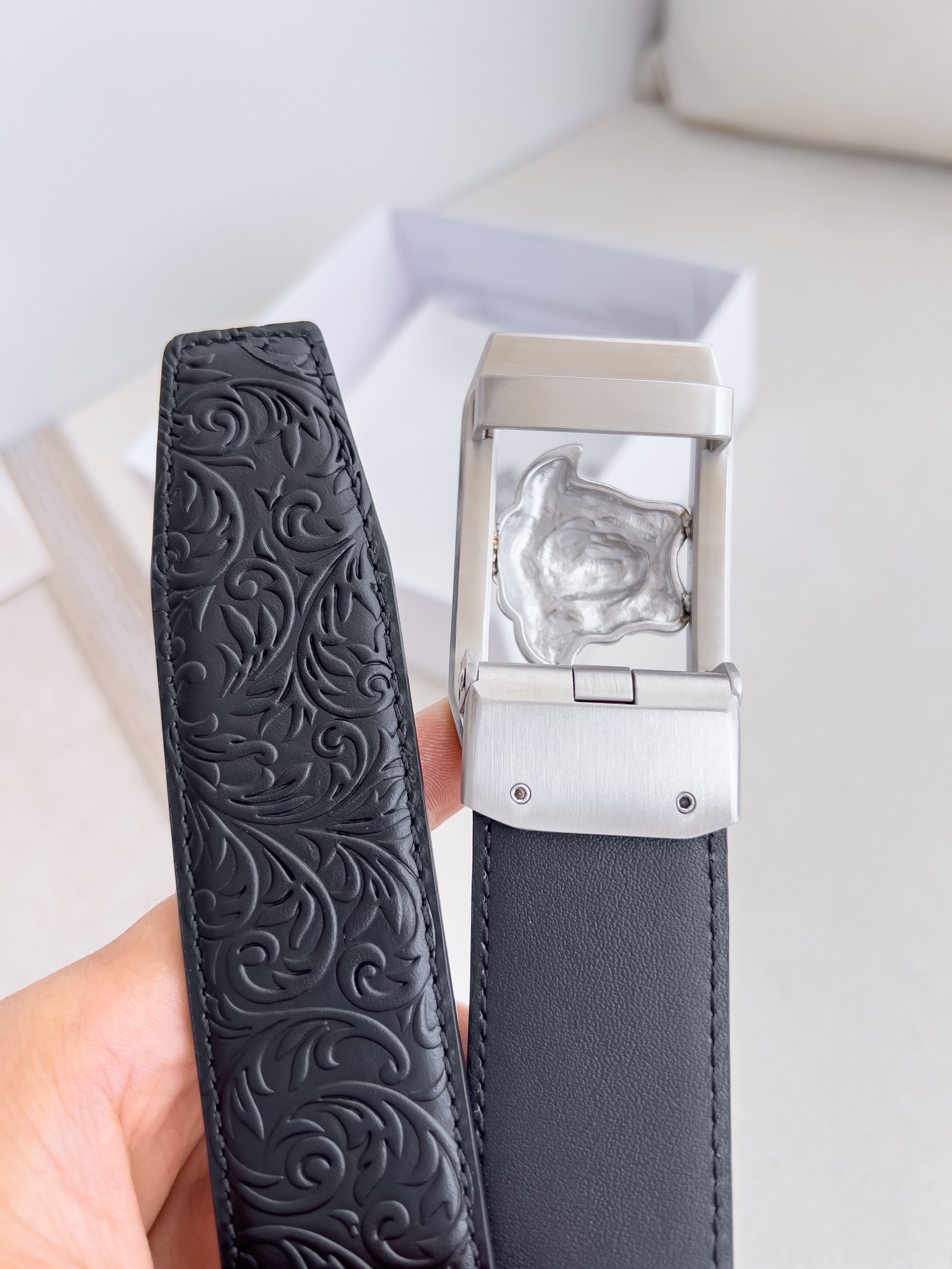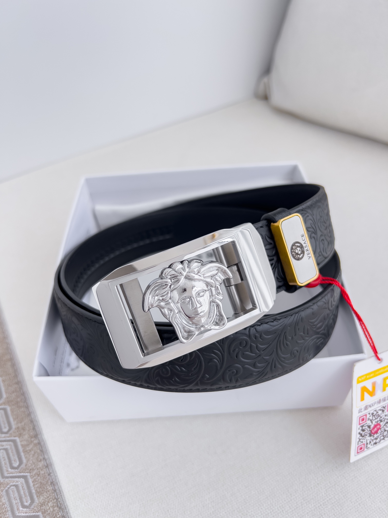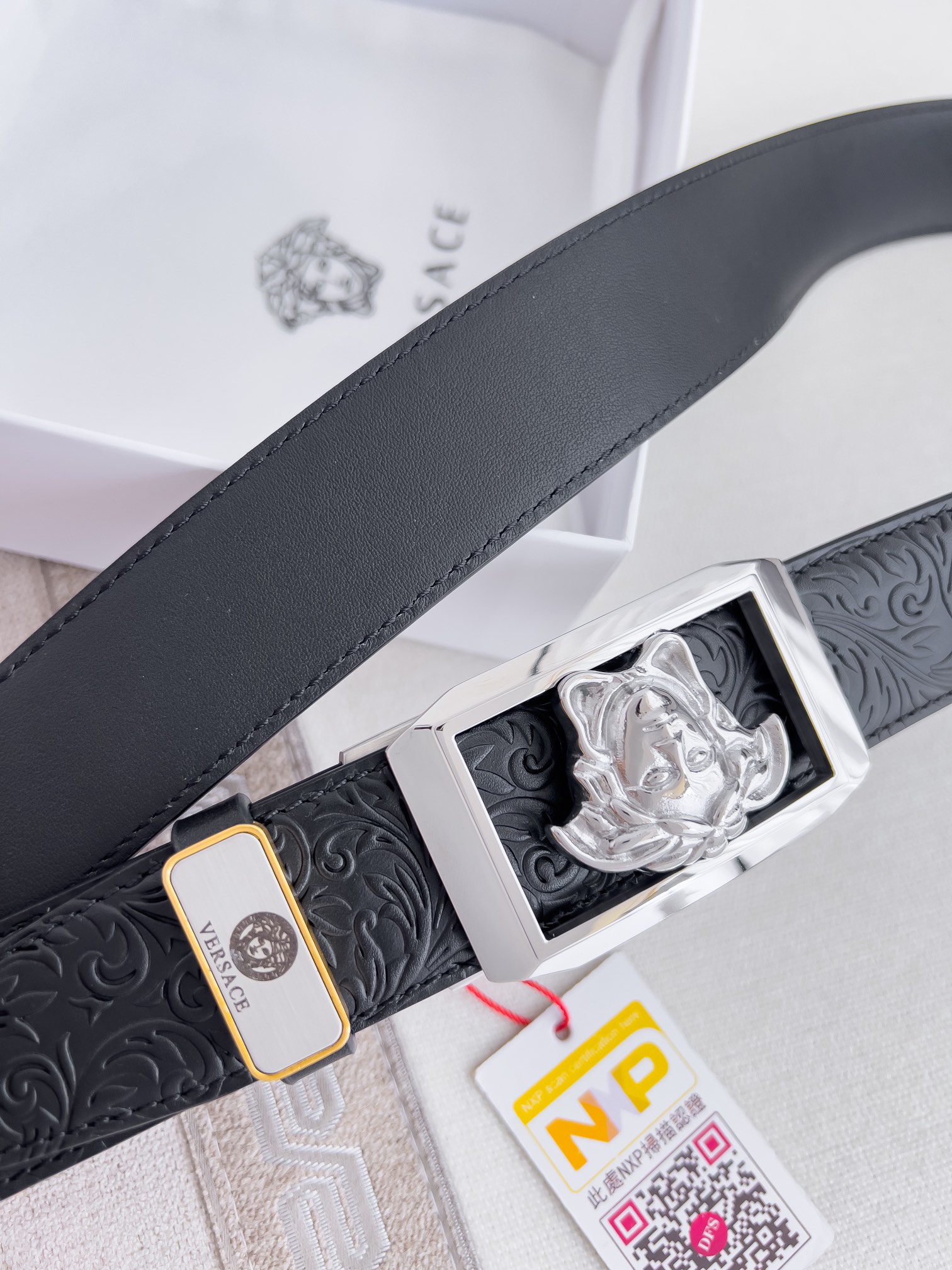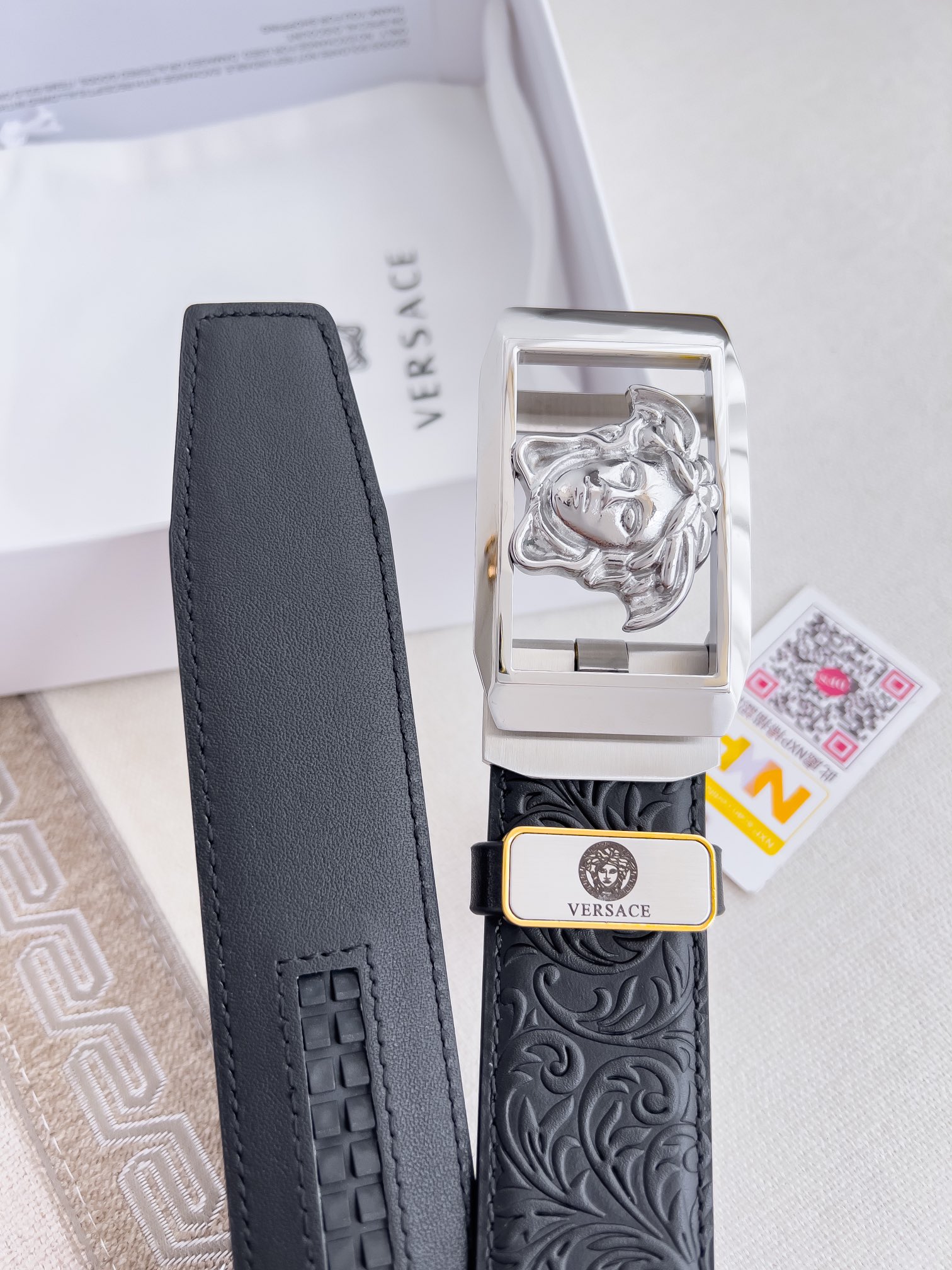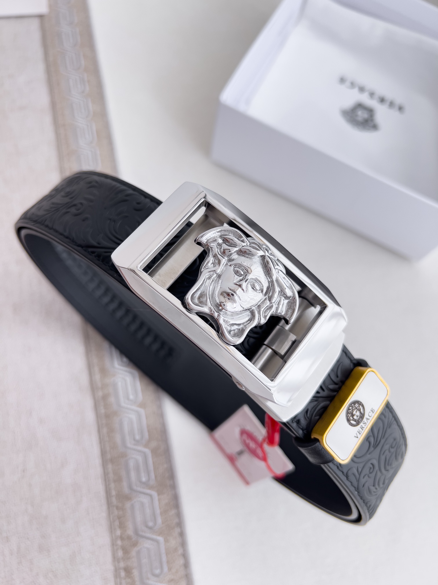 这款皮带是AAAAA 1:1 质量 (非常棒). 使用了和原版一模一样的材料. 商标部分也保持了和范思哲/Versace一样. 图片拍摄是实物皮带拍摄, 您所收到的实物保证和我们图片一模一样.