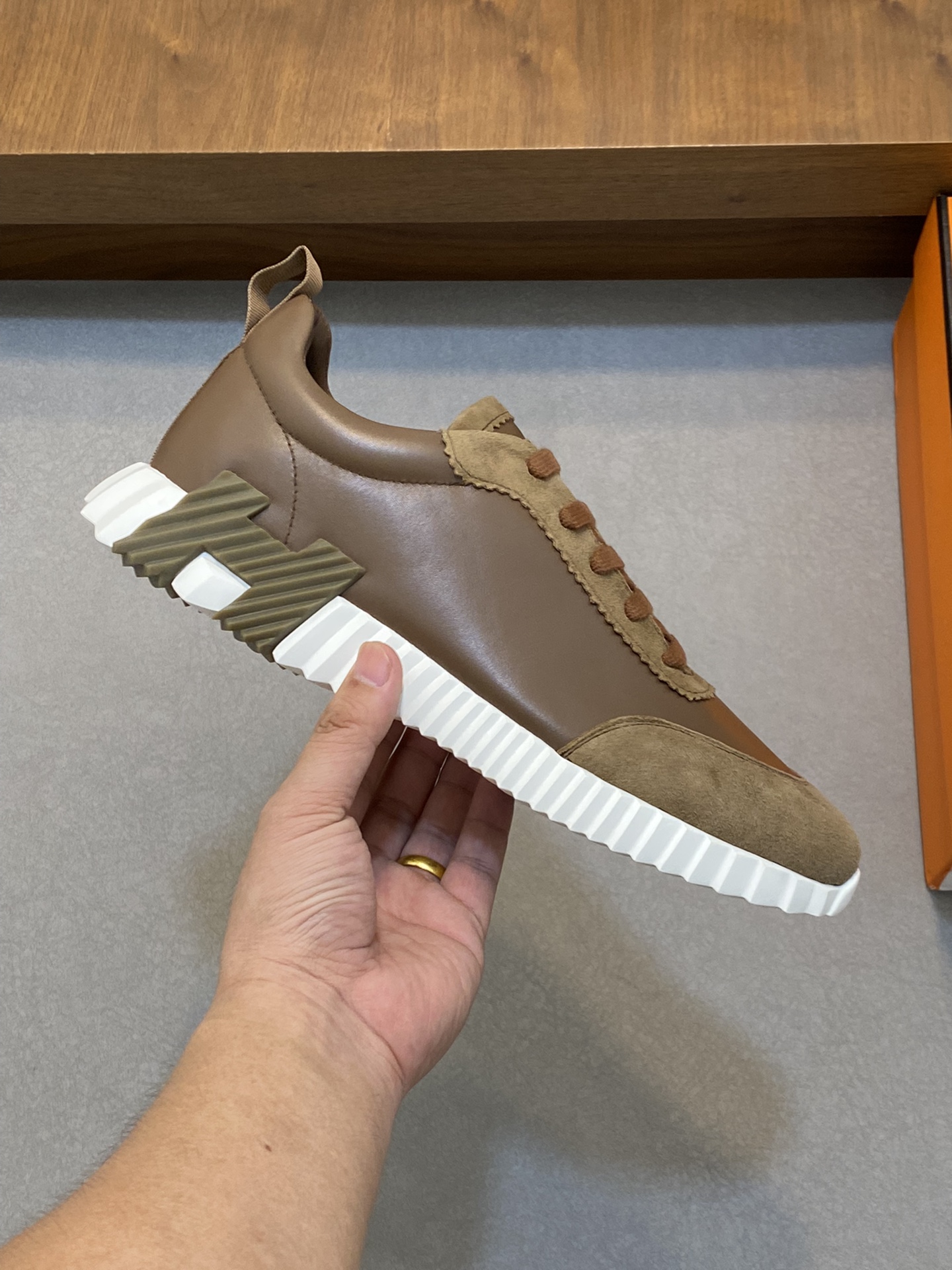 这款鞋子是AAAAA 1:1 质量 (非常棒). 使用了和原版一模一样的材料. 商标部分也保持了和爱马仕/Hermes一样. 图片拍摄是实物鞋子拍摄, 您所收到的实物保证和我们图片一模一样.