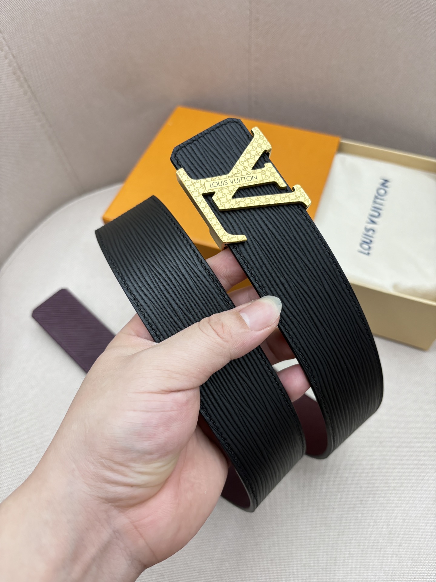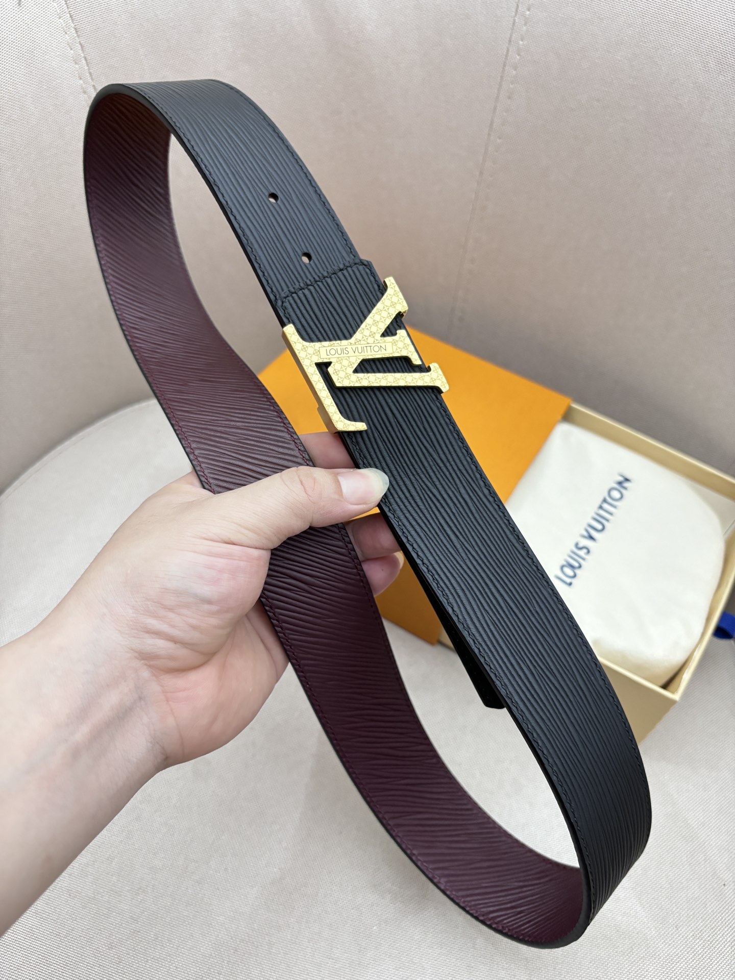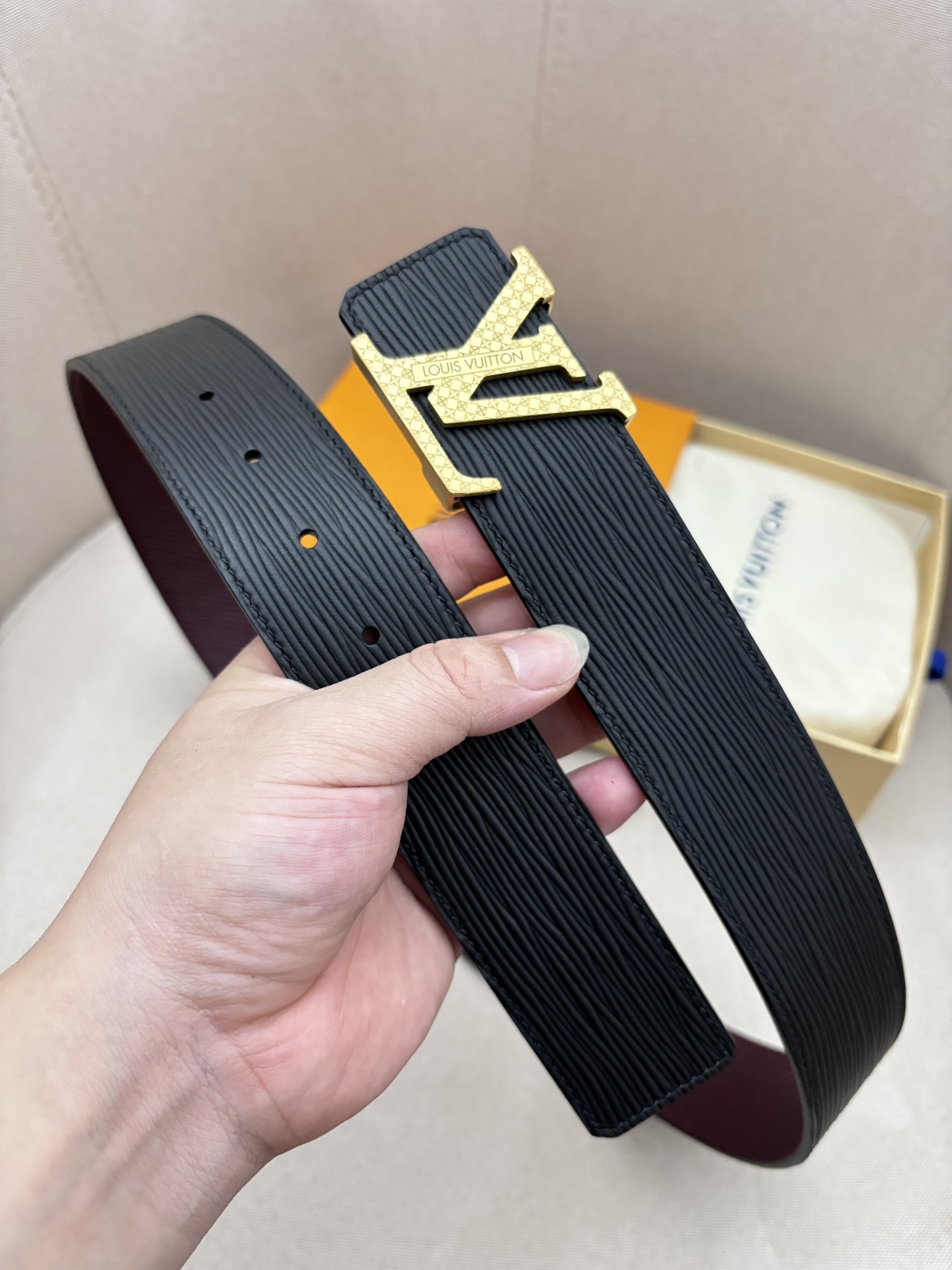 这款皮带是AAAAA 1:1 质量 (非常棒). 使用了和原版一模一样的材料. 商标部分也保持了和路易威登/Louis Vuitton一样. 图片拍摄是实物皮带拍摄, 您所收到的实物保证和我们图片一模一样.