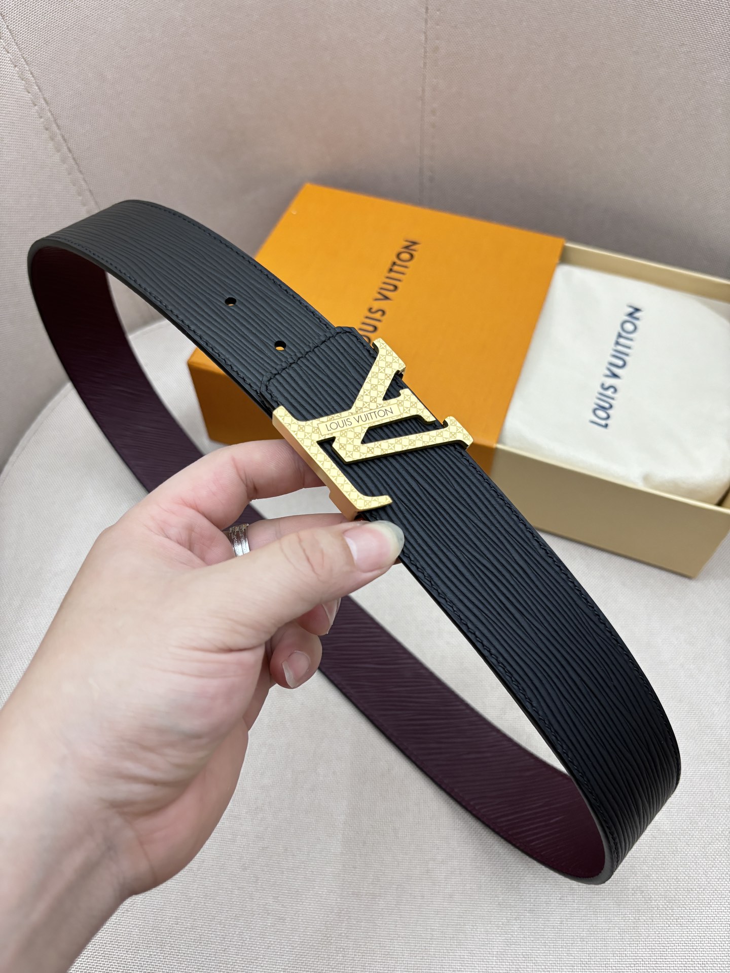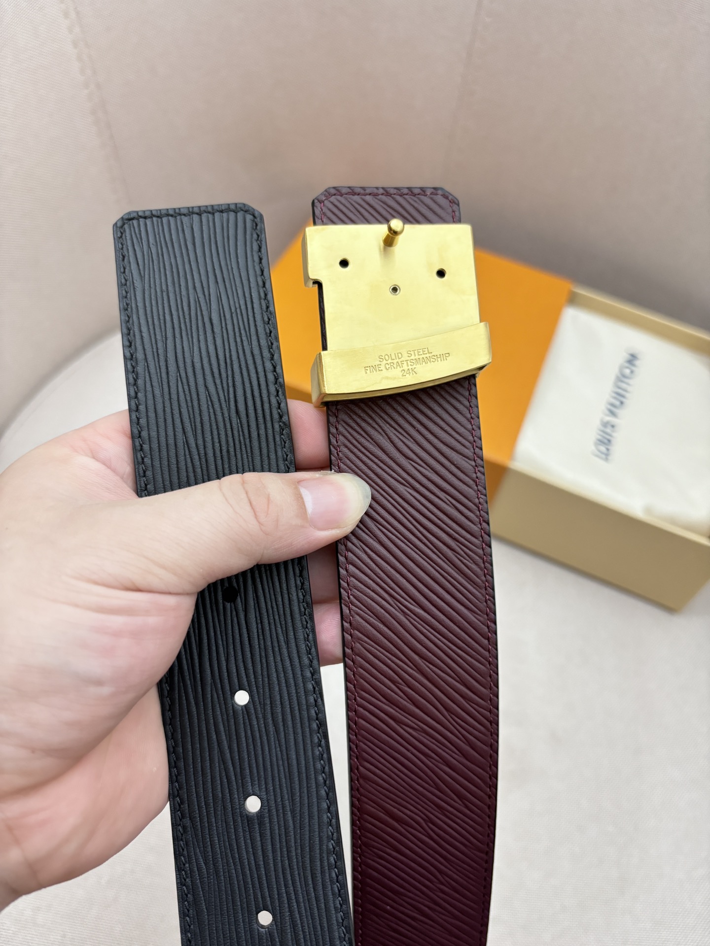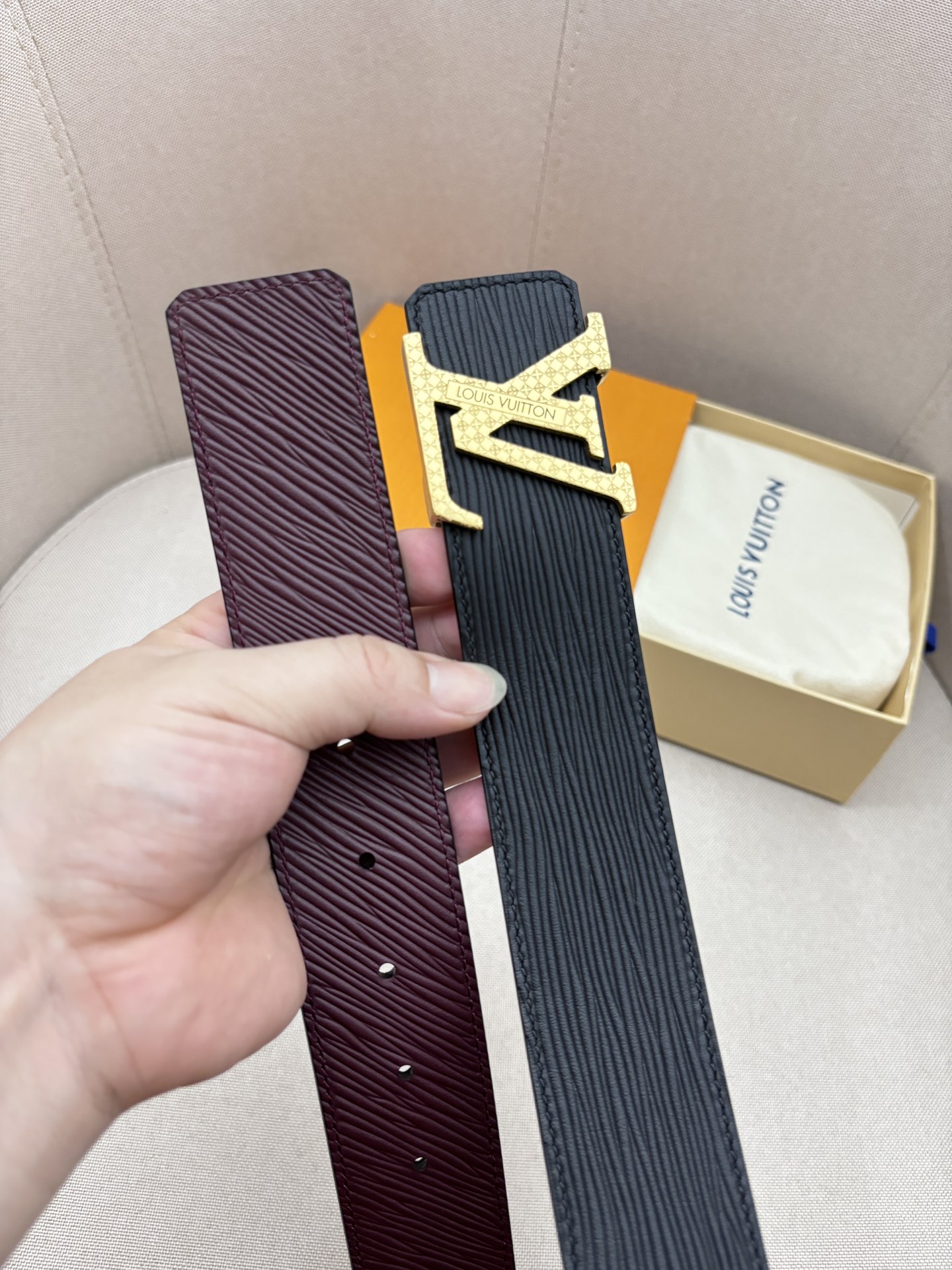 这款皮带是AAAAA 1:1 质量 (非常棒). 使用了和原版一模一样的材料. 商标部分也保持了和路易威登/Louis Vuitton一样. 图片拍摄是实物皮带拍摄, 您所收到的实物保证和我们图片一模一样.