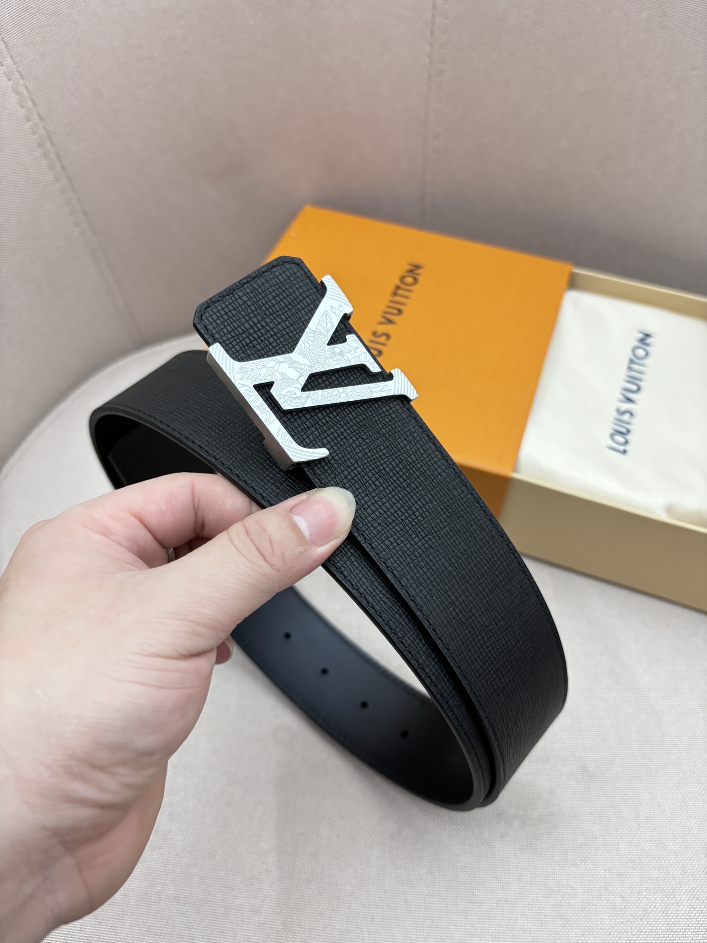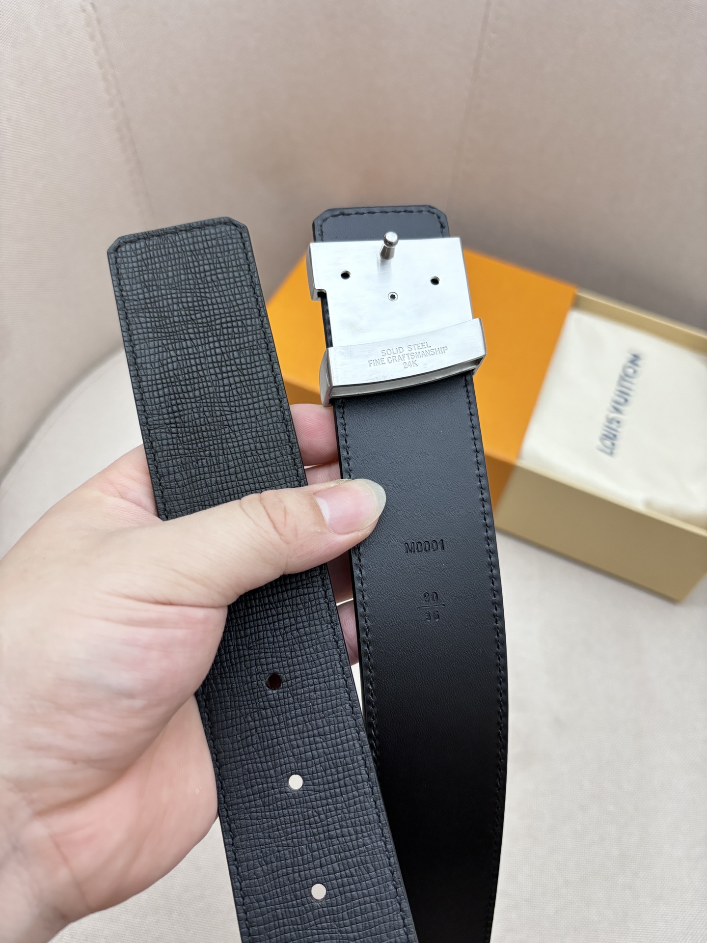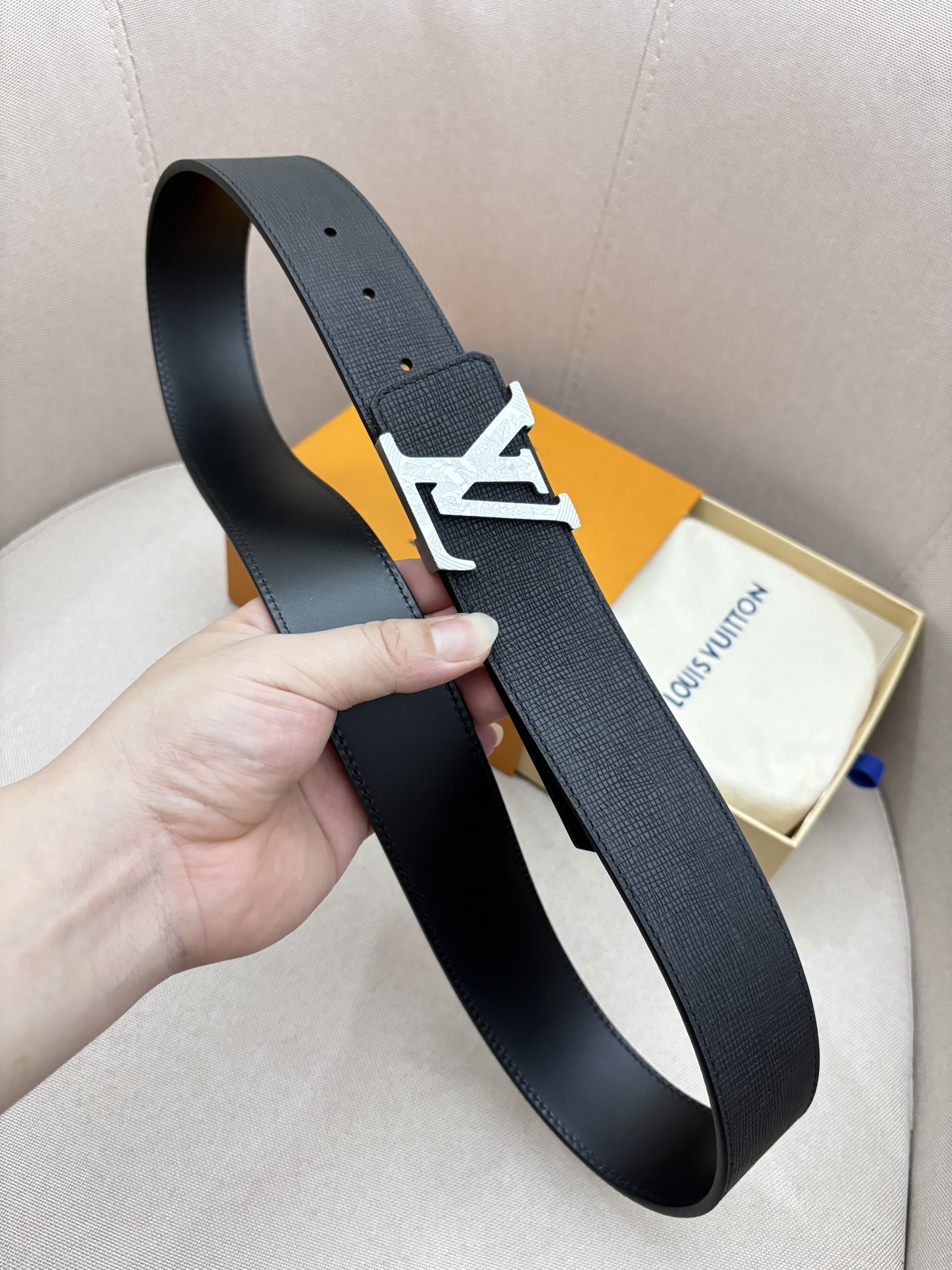 这款皮带是AAAAA 1:1 质量 (非常棒). 使用了和原版一模一样的材料. 商标部分也保持了和路易威登/Louis Vuitton一样. 图片拍摄是实物皮带拍摄, 您所收到的实物保证和我们图片一模一样.