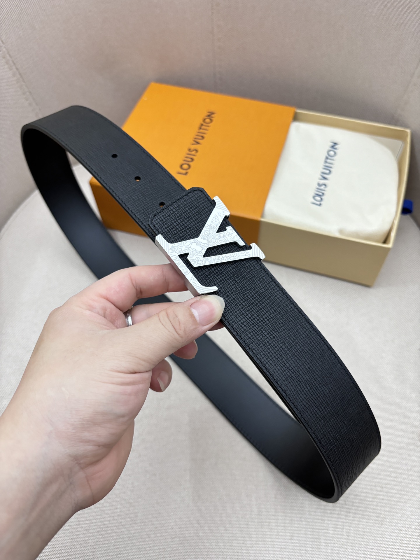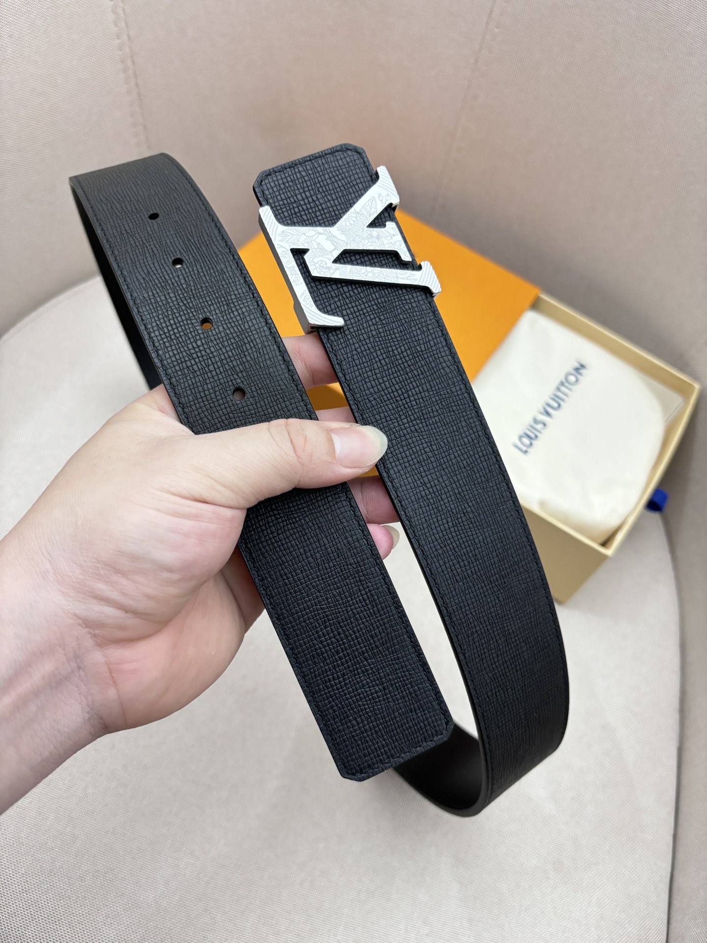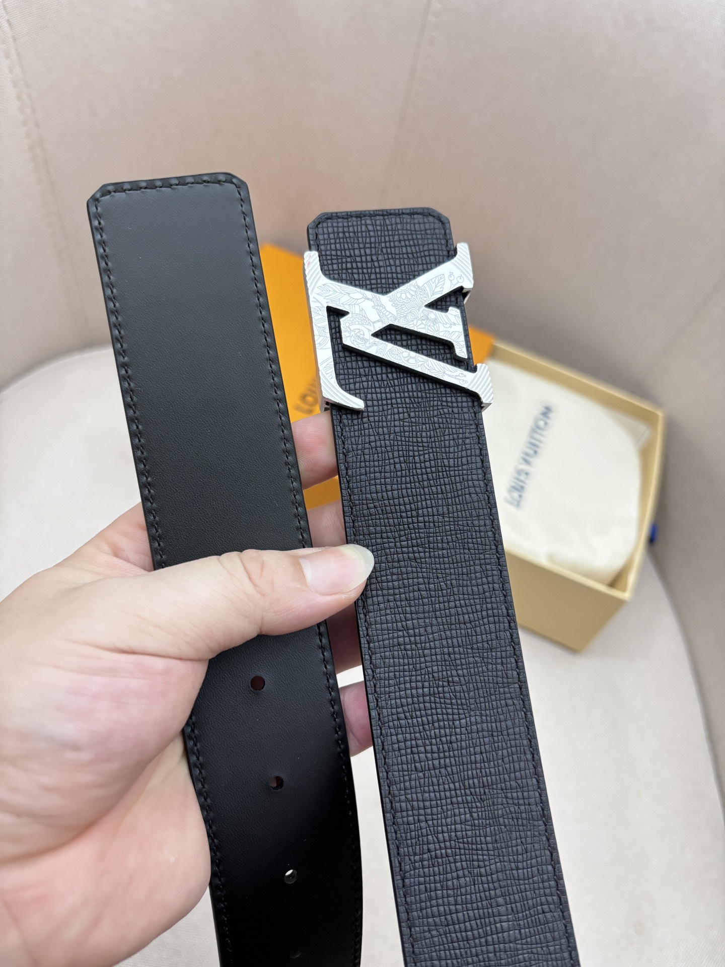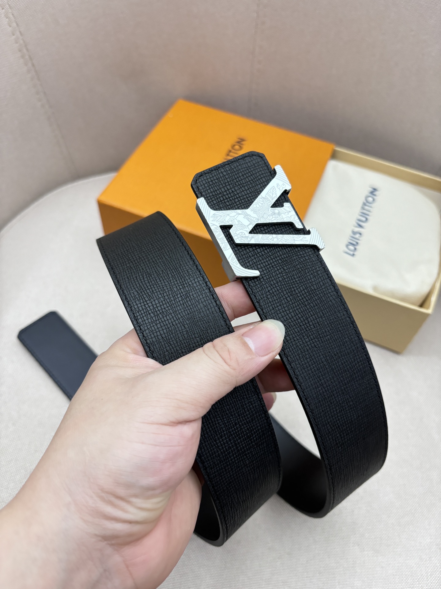 这款皮带是AAAAA 1:1 质量 (非常棒). 使用了和原版一模一样的材料. 商标部分也保持了和路易威登/Louis Vuitton一样. 图片拍摄是实物皮带拍摄, 您所收到的实物保证和我们图片一模一样.