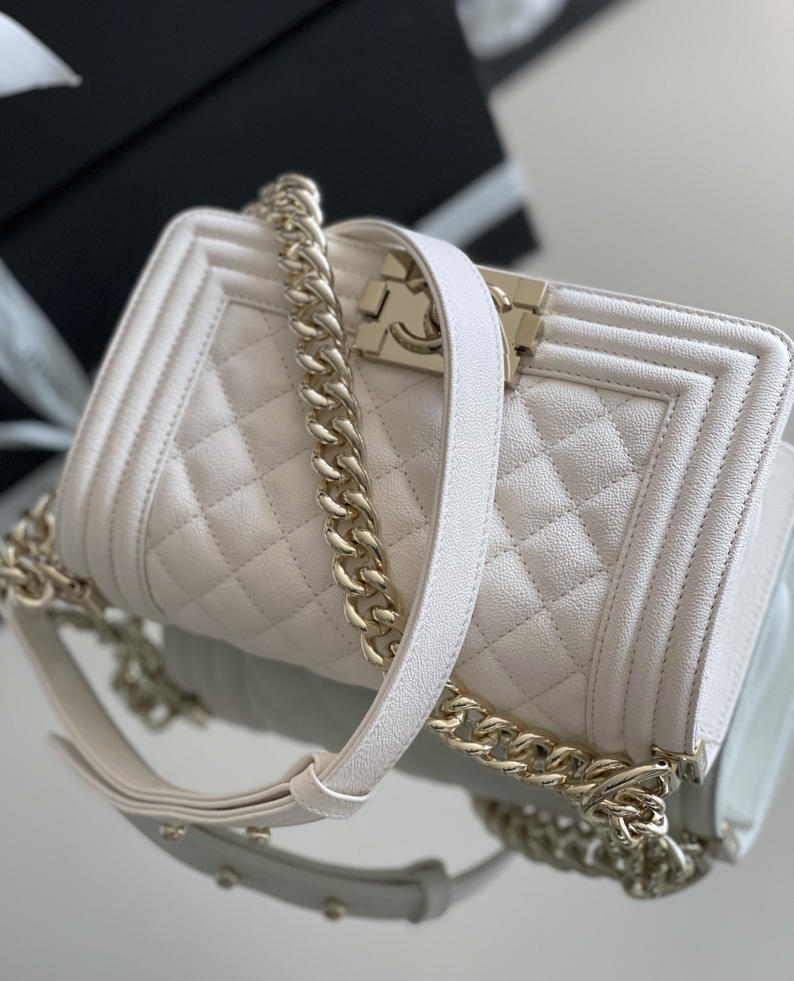 这款包包是AAAAA 1:1 质量 (非常棒). 使用了和原版一模一样的材料. 商标部分也保持了和香奈儿/Chanel一样. 图片拍摄是实物包包拍摄, 您所收到的实物保证和我们图片一模一样.