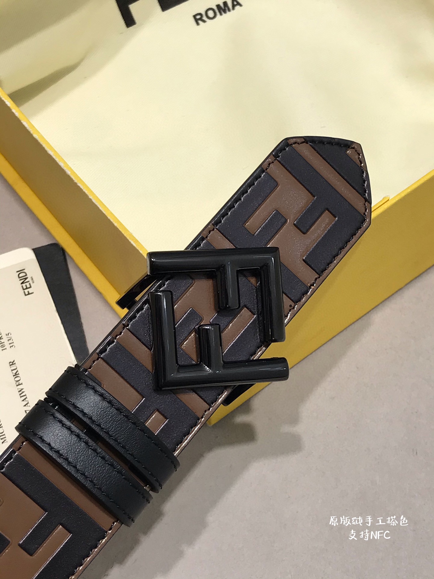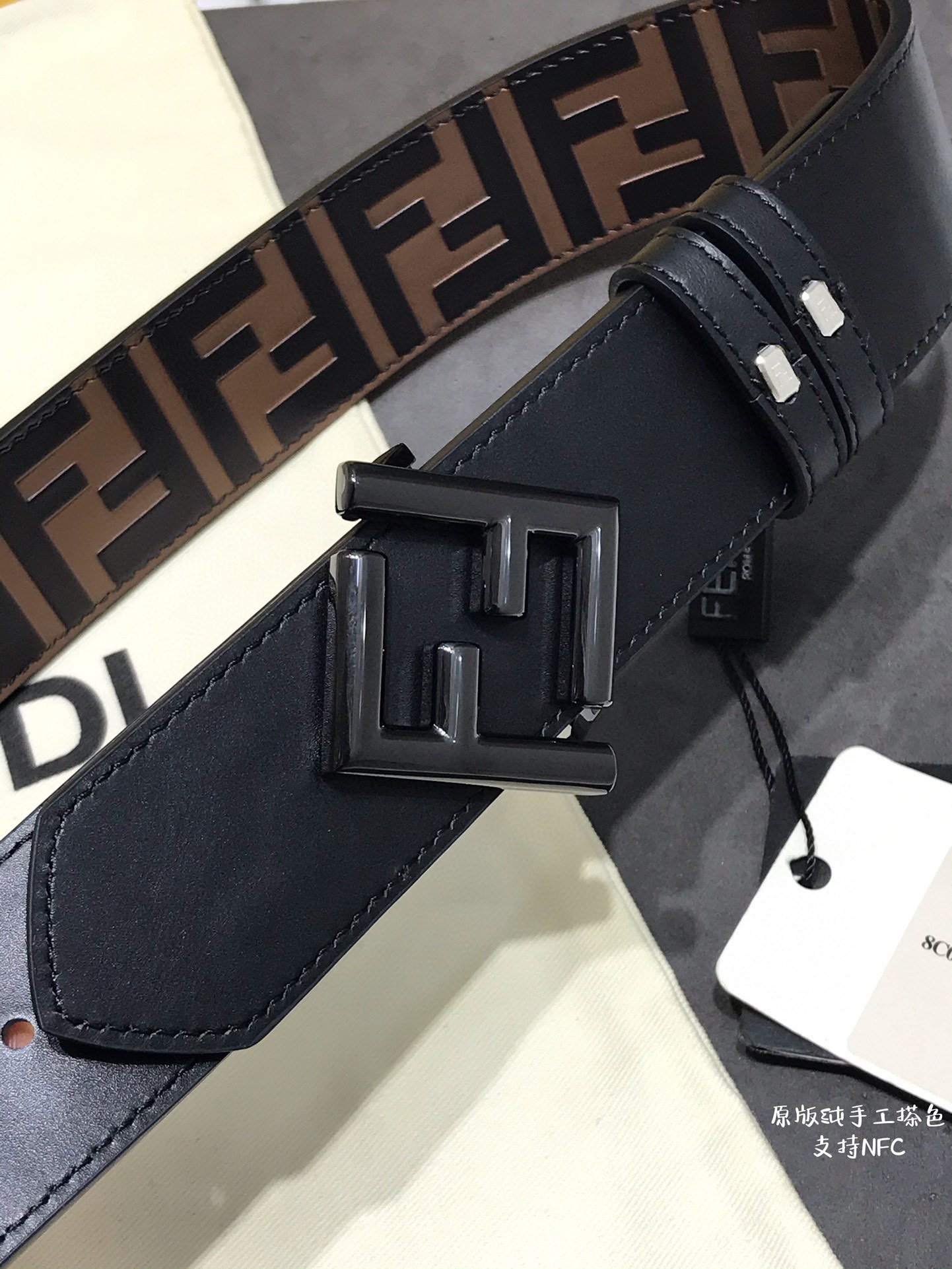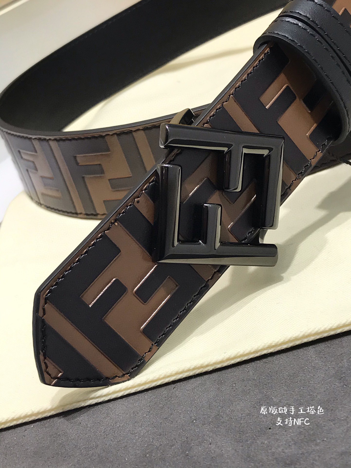 这款皮带是AAAAA 1:1 质量 (非常棒). 使用了和原版一模一样的材料. 商标部分也保持了和芬迪/Fendi一样. 图片拍摄是实物皮带拍摄, 您所收到的实物保证和我们图片一模一样.