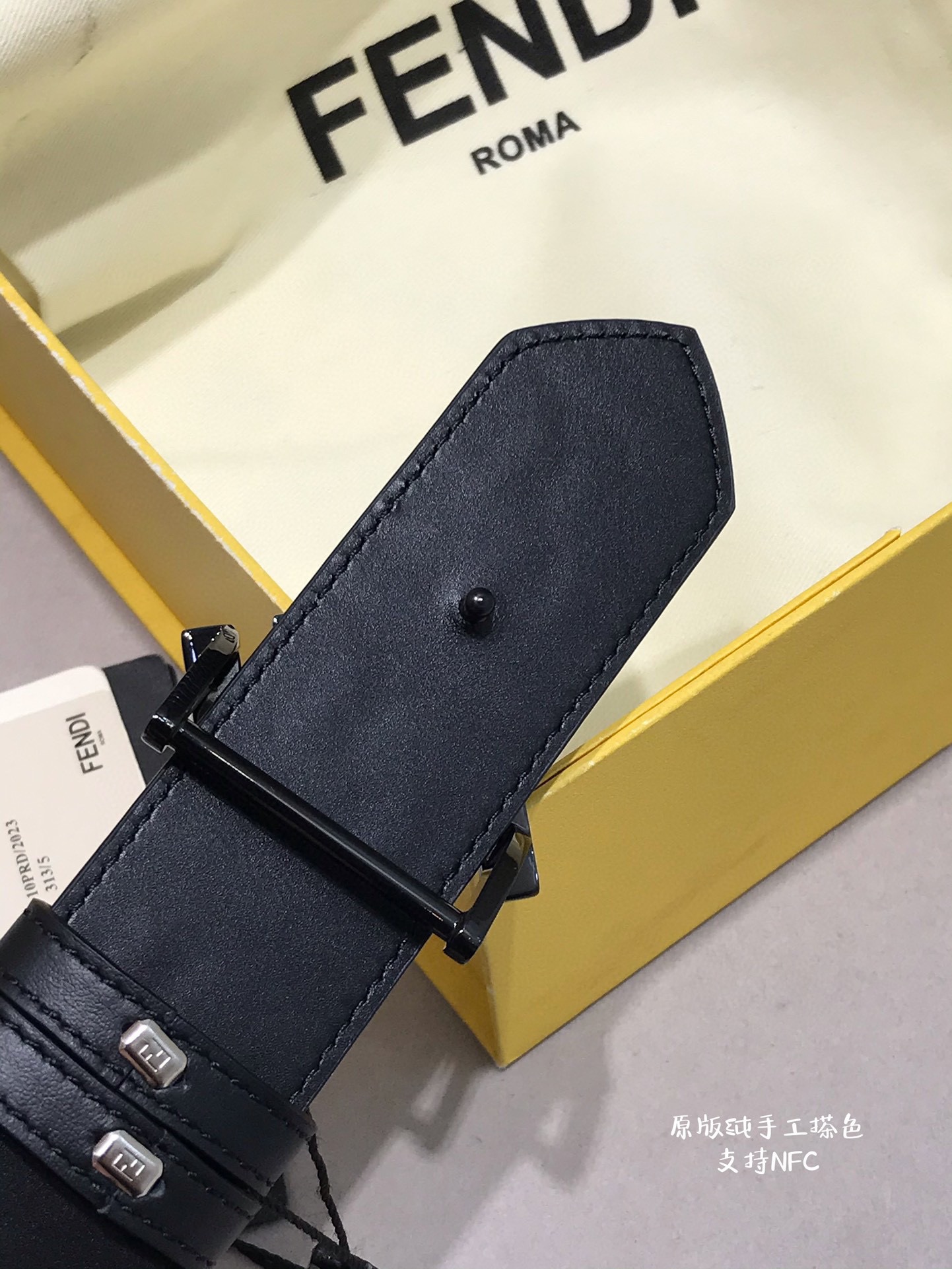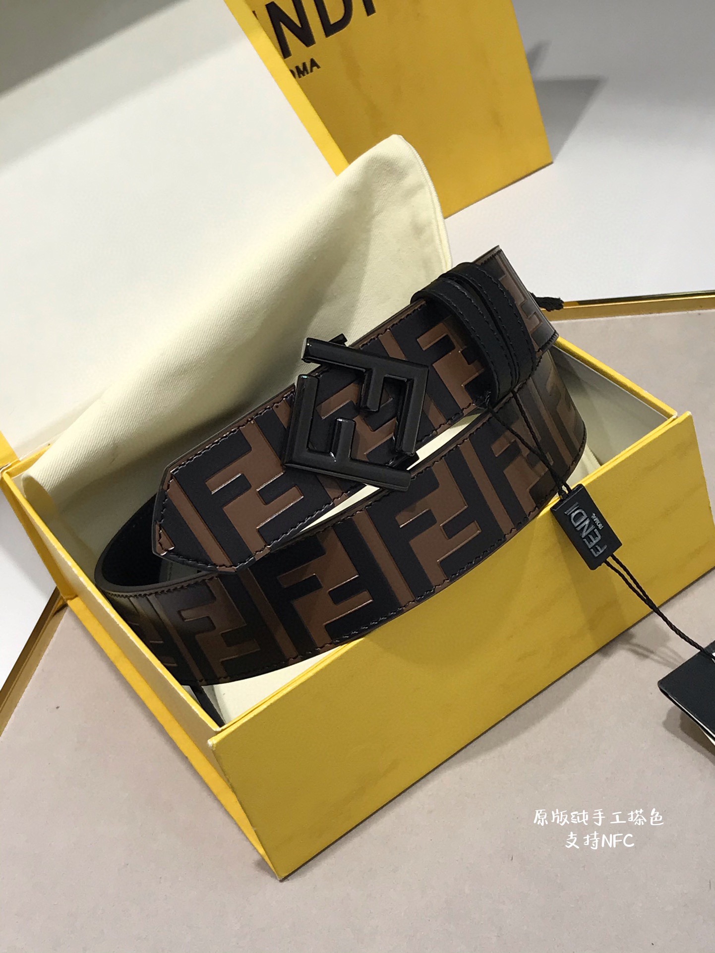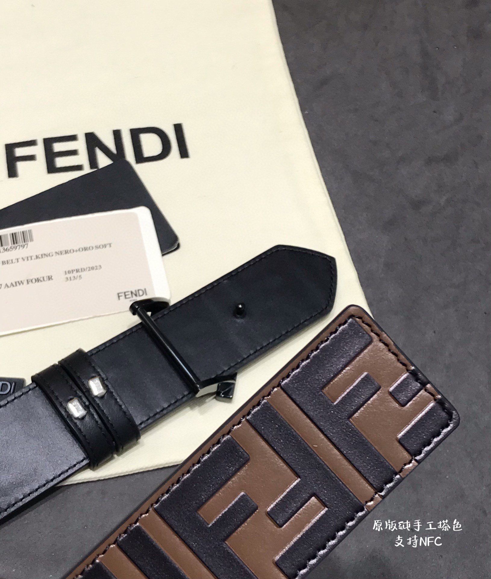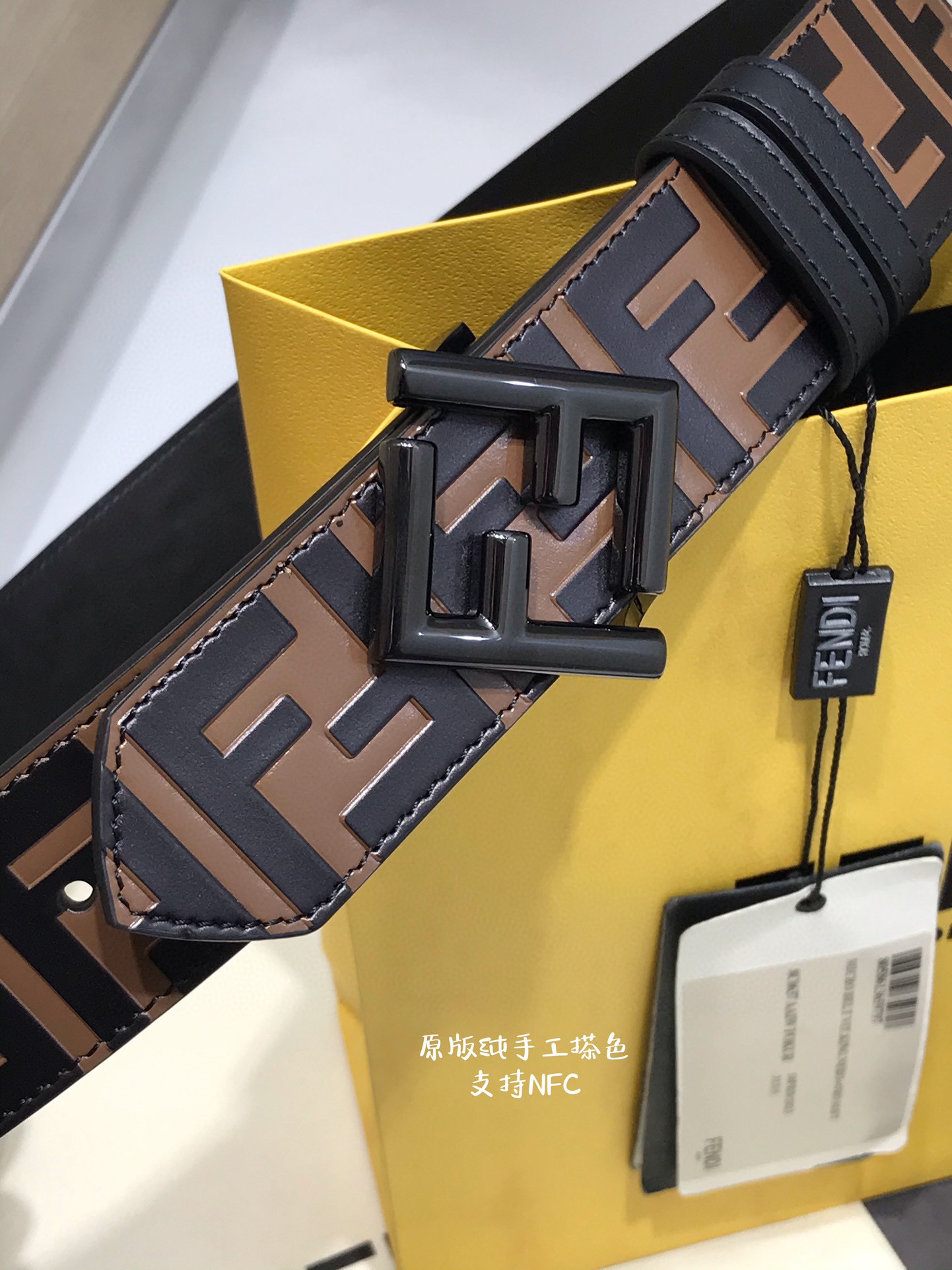 这款皮带是AAAAA 1:1 质量 (非常棒). 使用了和原版一模一样的材料. 商标部分也保持了和芬迪/Fendi一样. 图片拍摄是实物皮带拍摄, 您所收到的实物保证和我们图片一模一样.