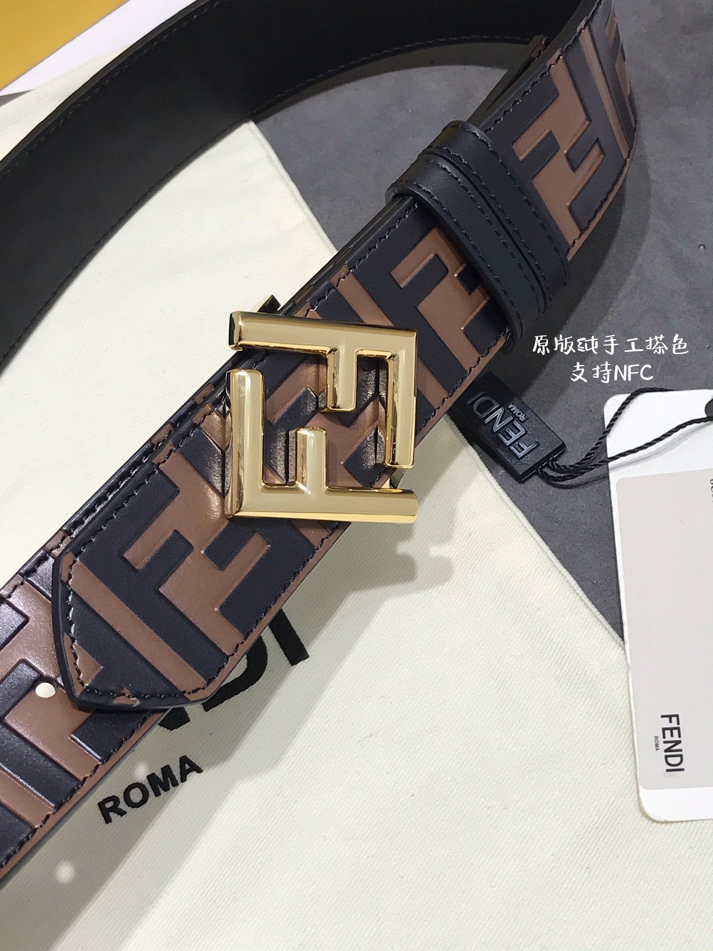 这款皮带是AAAAA 1:1 质量 (非常棒). 使用了和原版一模一样的材料. 商标部分也保持了和芬迪/Fendi一样. 图片拍摄是实物皮带拍摄, 您所收到的实物保证和我们图片一模一样.