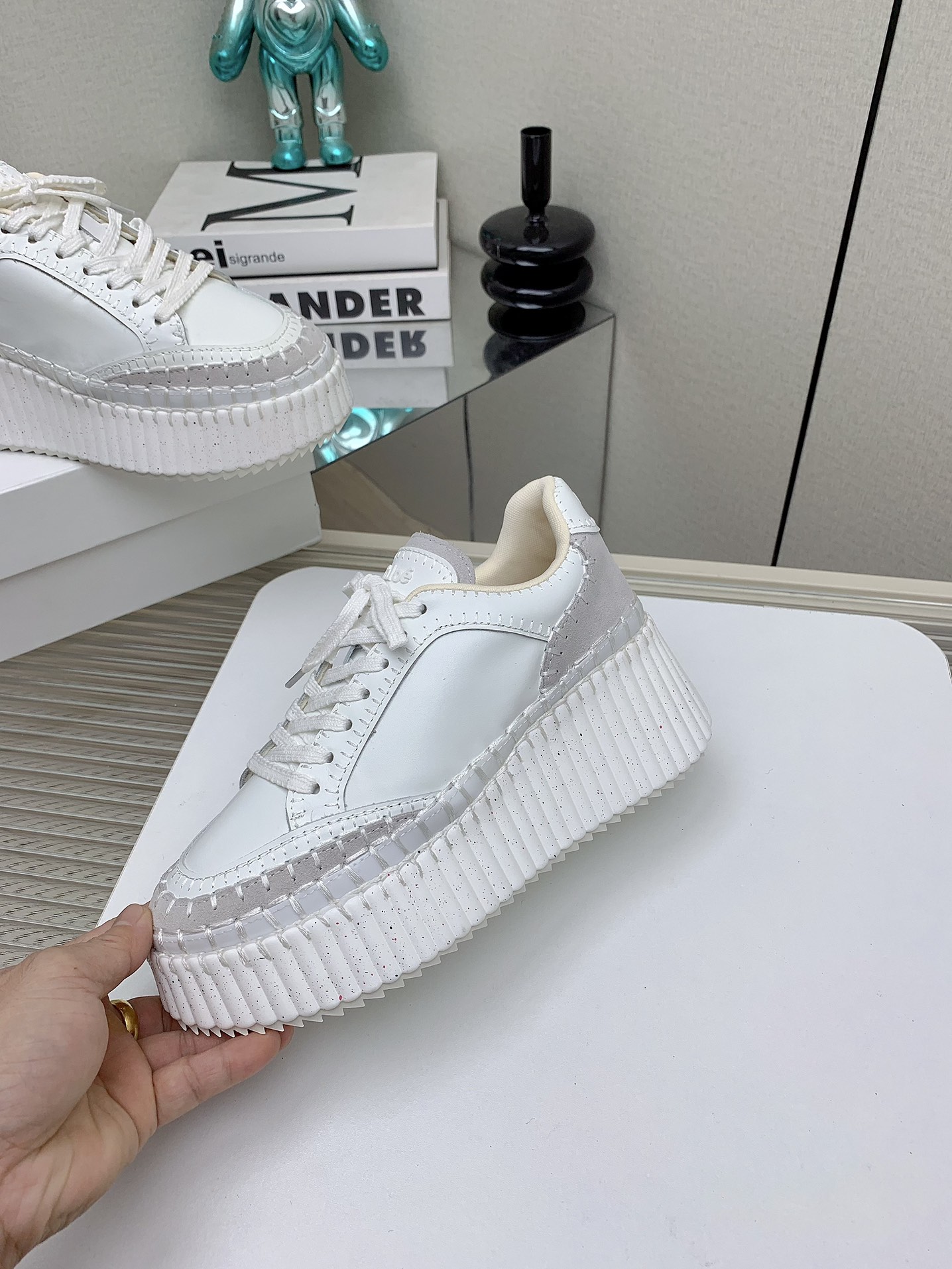 这款鞋子是AAAAA 1:1 质量 (非常棒). 使用了和原版一模一样的材料. 商标部分也保持了和克洛伊/Chloe一样. 图片拍摄是实物鞋子拍摄, 您所收到的实物保证和我们图片一模一样.