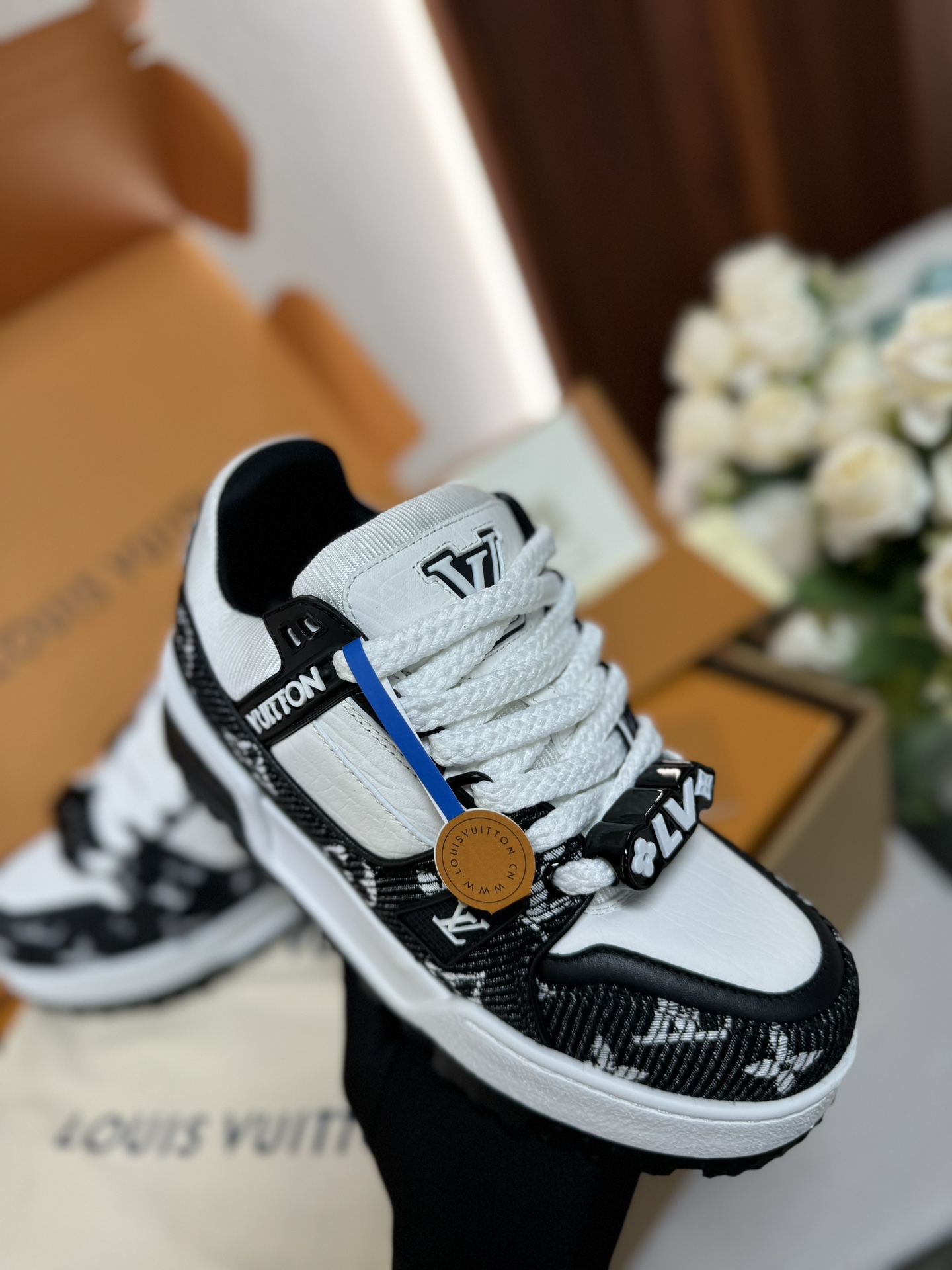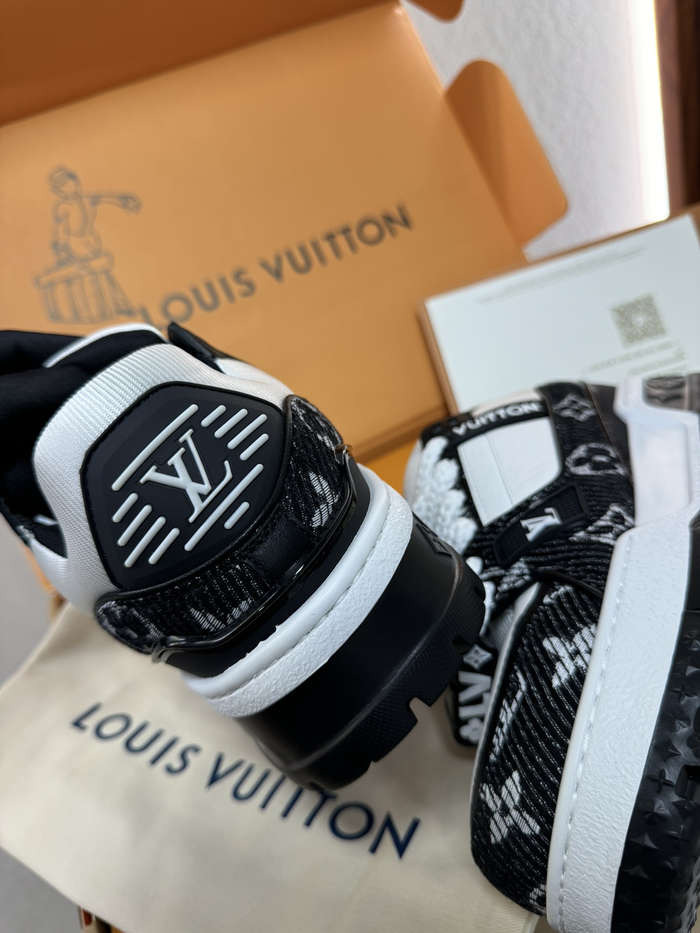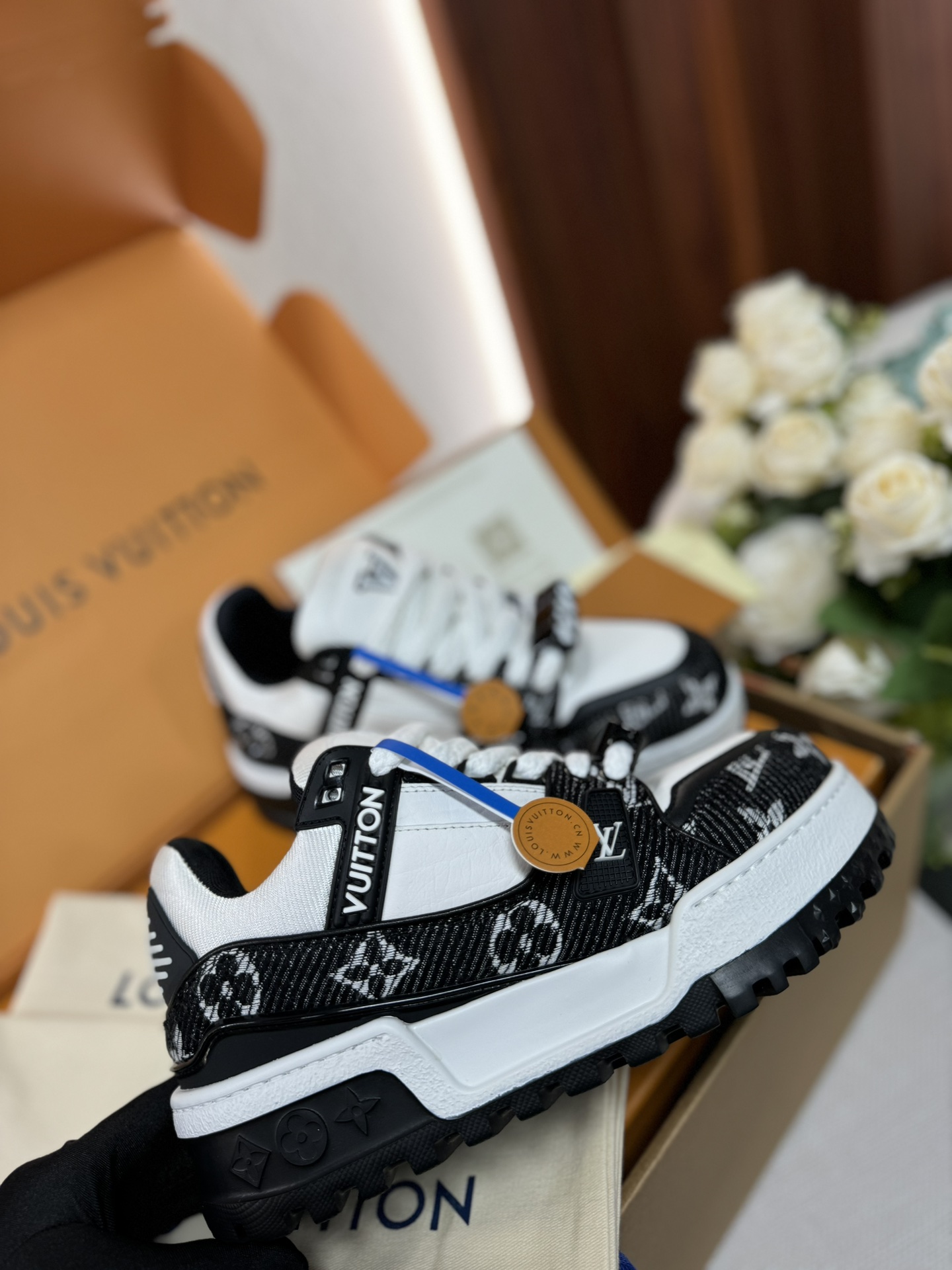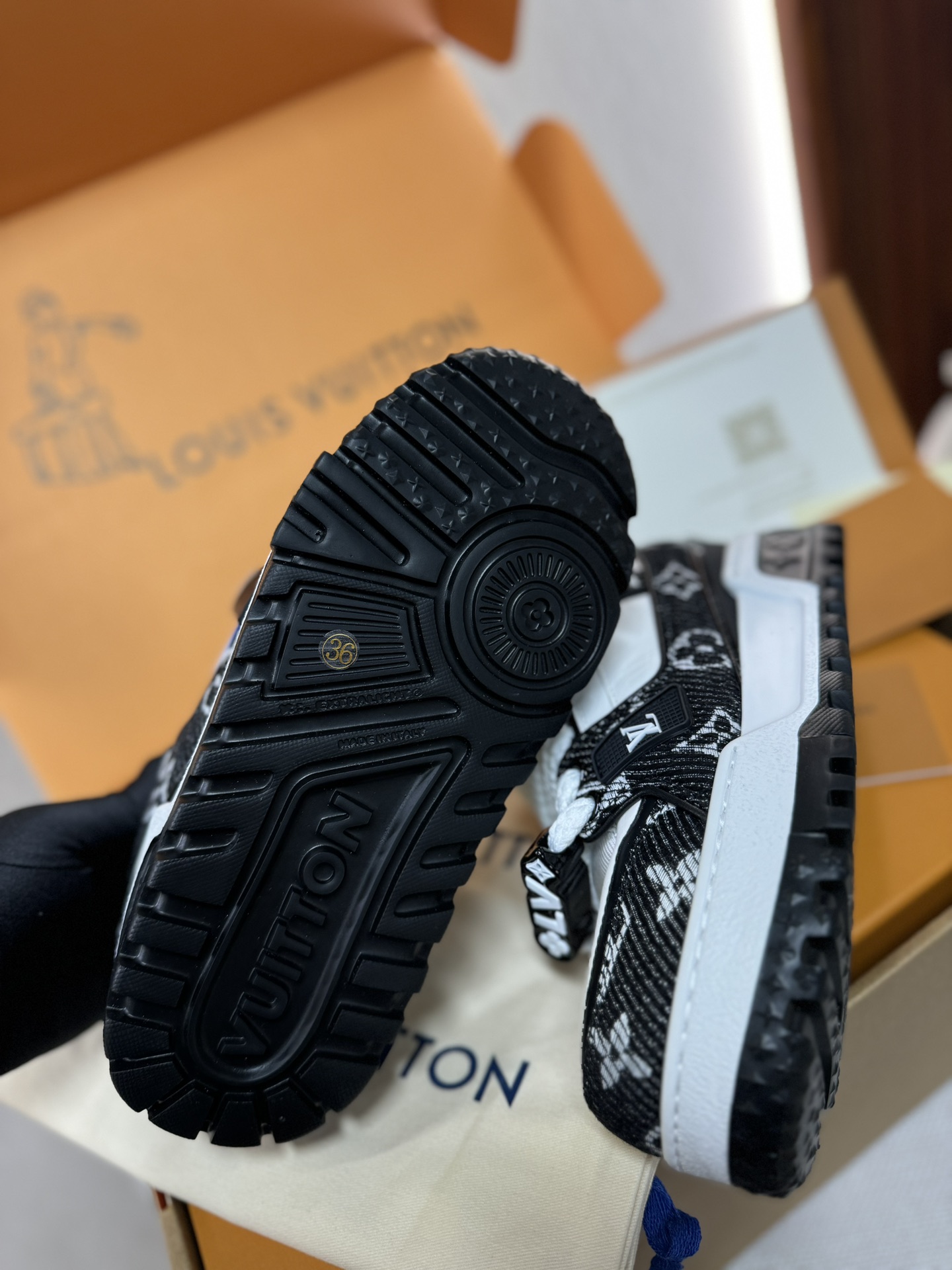 这款鞋子是AAAAA 1:1 质量 (非常棒). 使用了和原版一模一样的材料. 商标部分也保持了和路易威登/Louis Vuitton一样. 图片拍摄是实物鞋子拍摄, 您所收到的实物保证和我们图片一模一样.