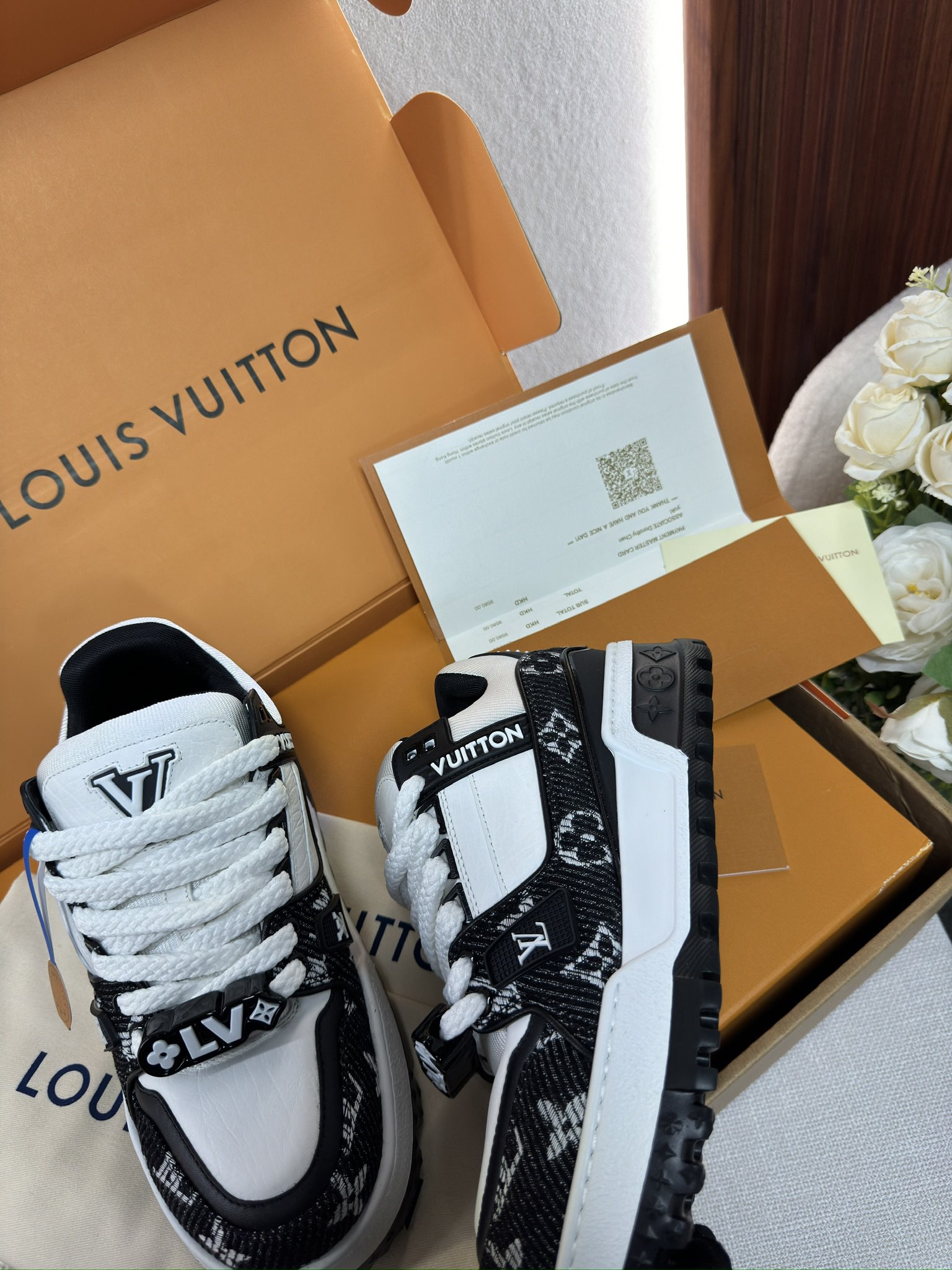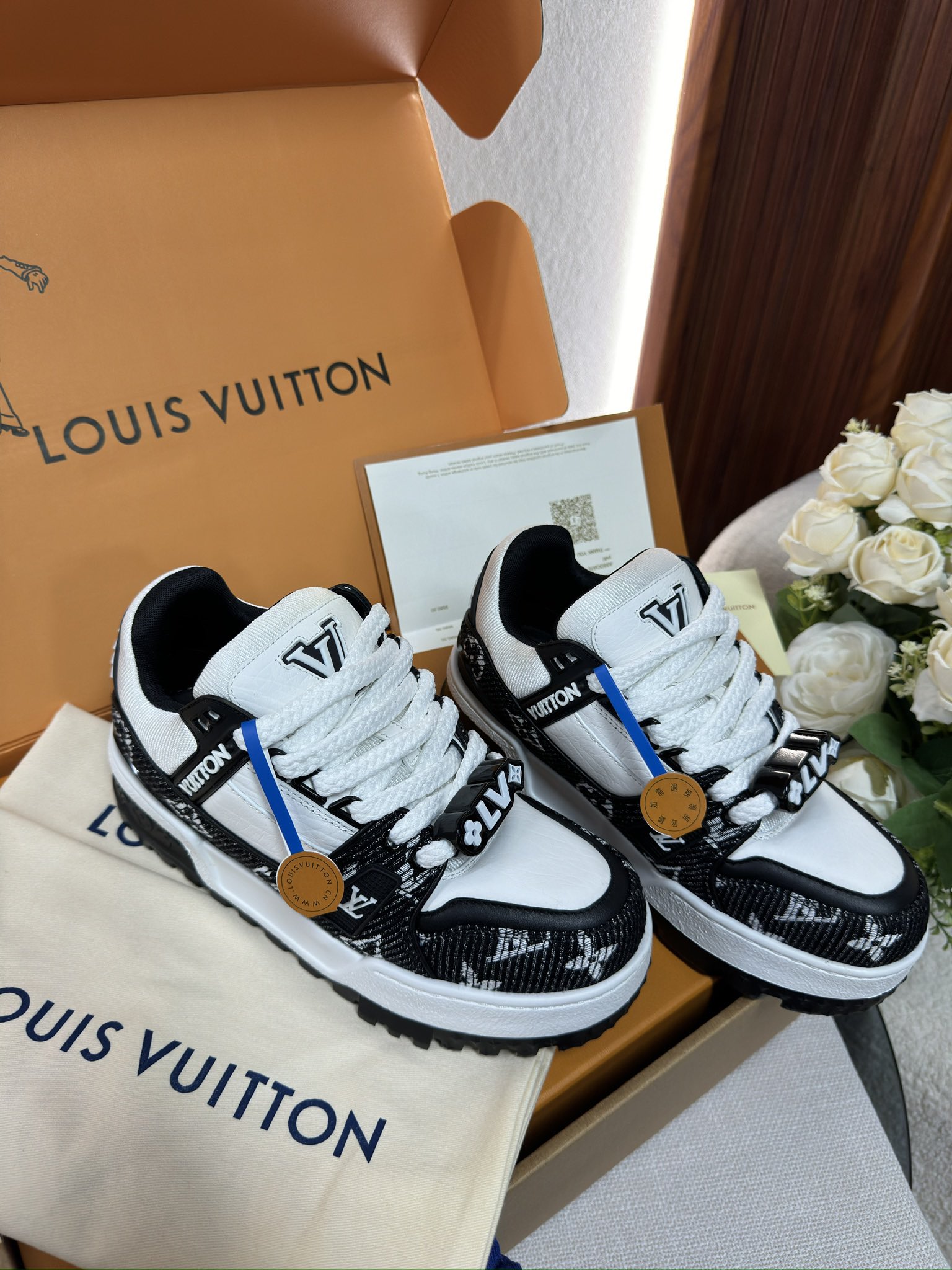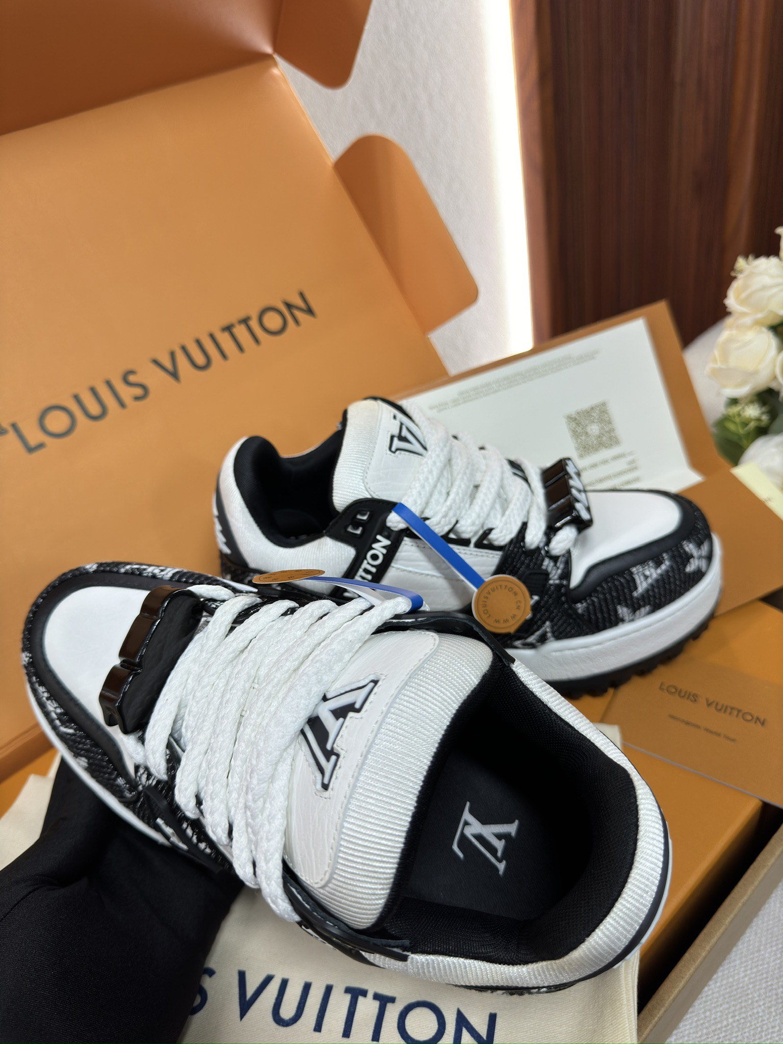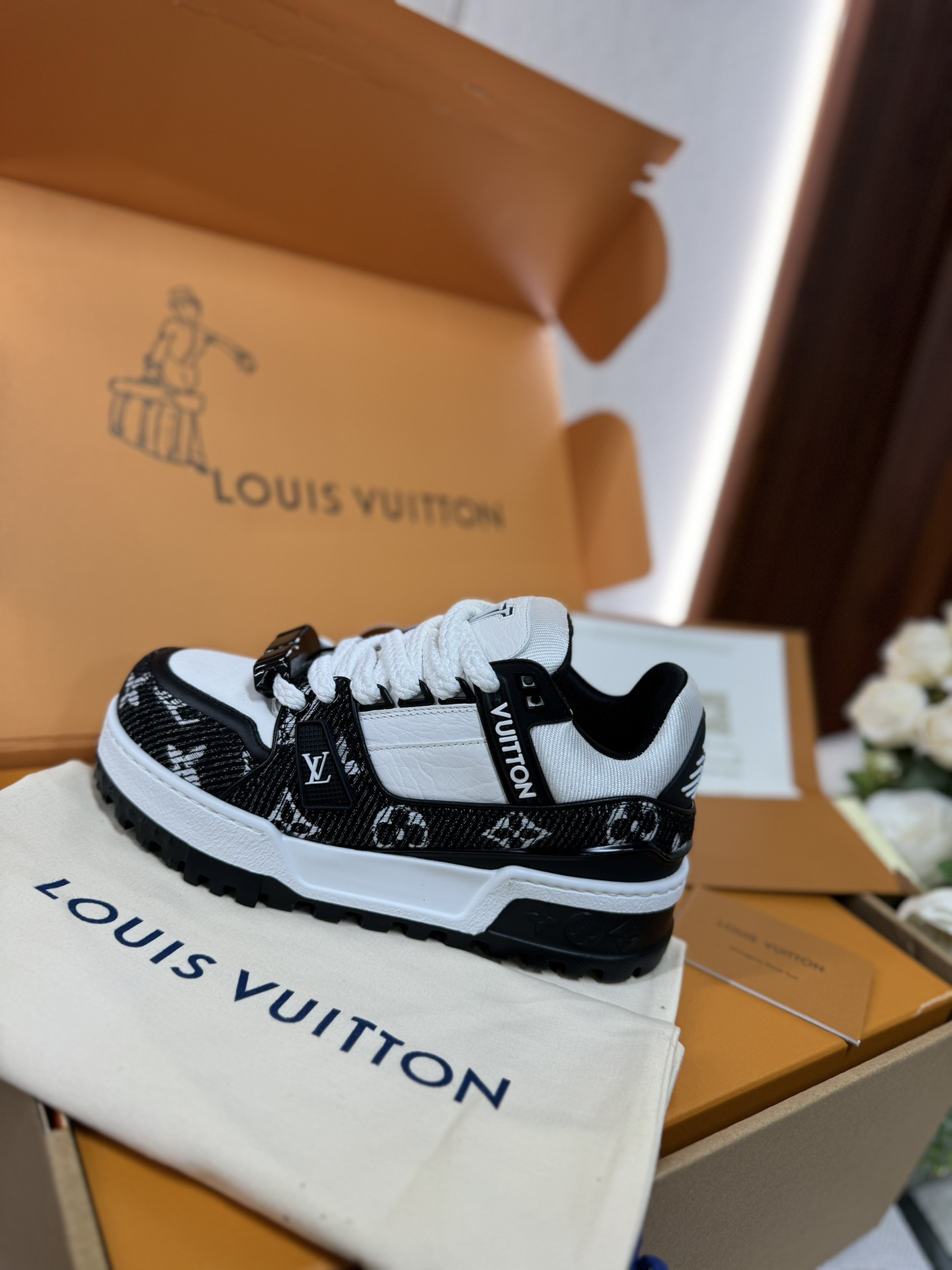 这款鞋子是AAAAA 1:1 质量 (非常棒). 使用了和原版一模一样的材料. 商标部分也保持了和路易威登/Louis Vuitton一样. 图片拍摄是实物鞋子拍摄, 您所收到的实物保证和我们图片一模一样.