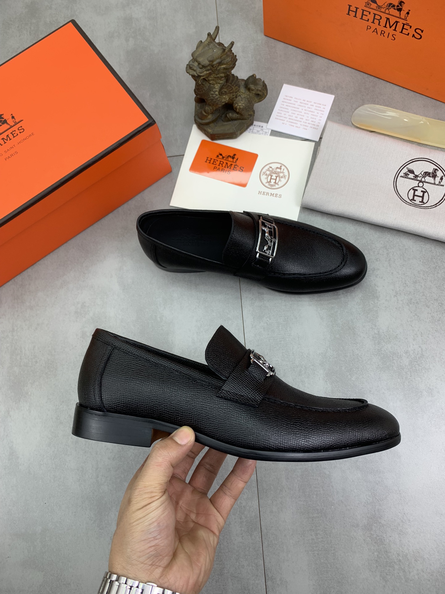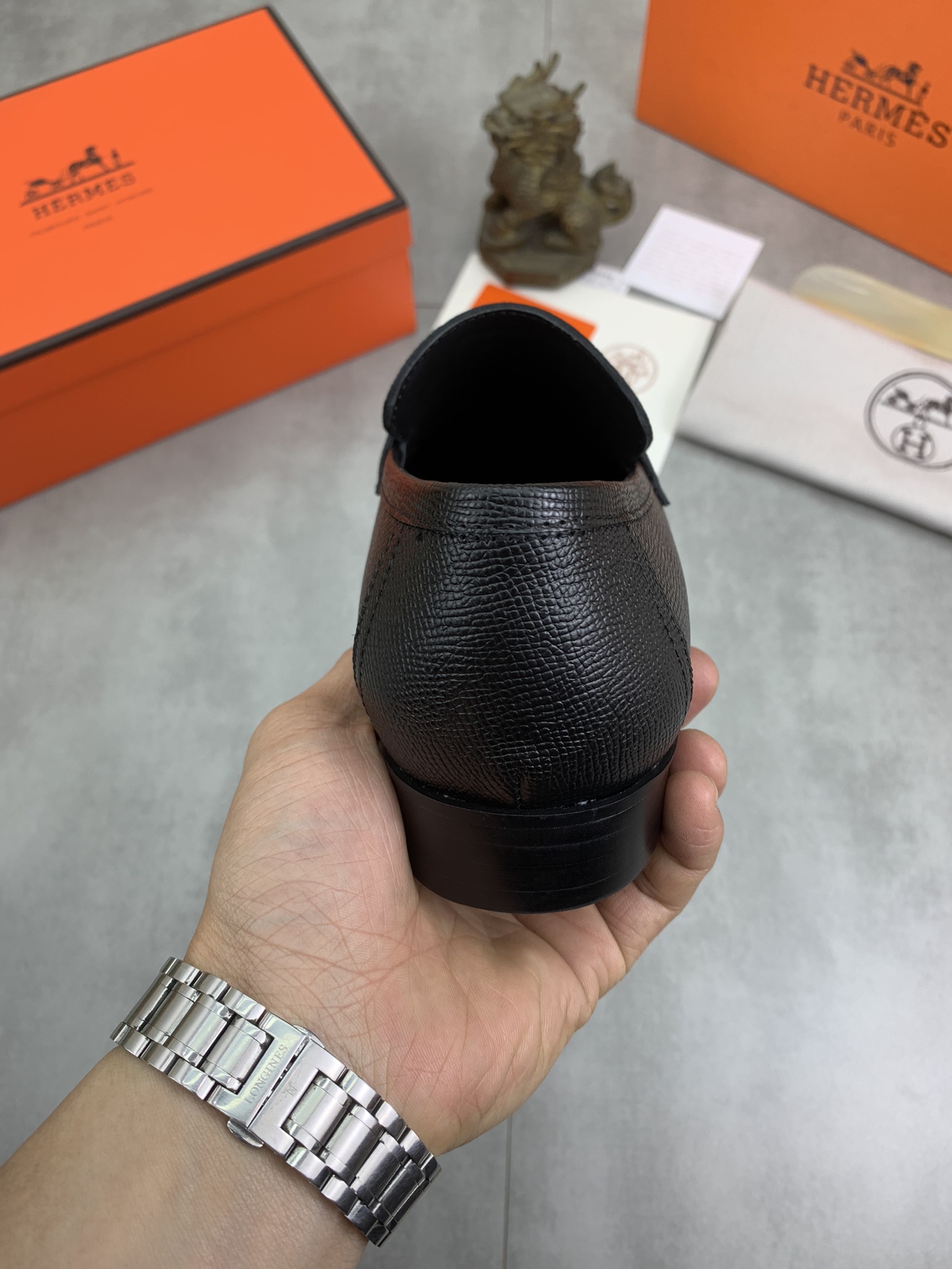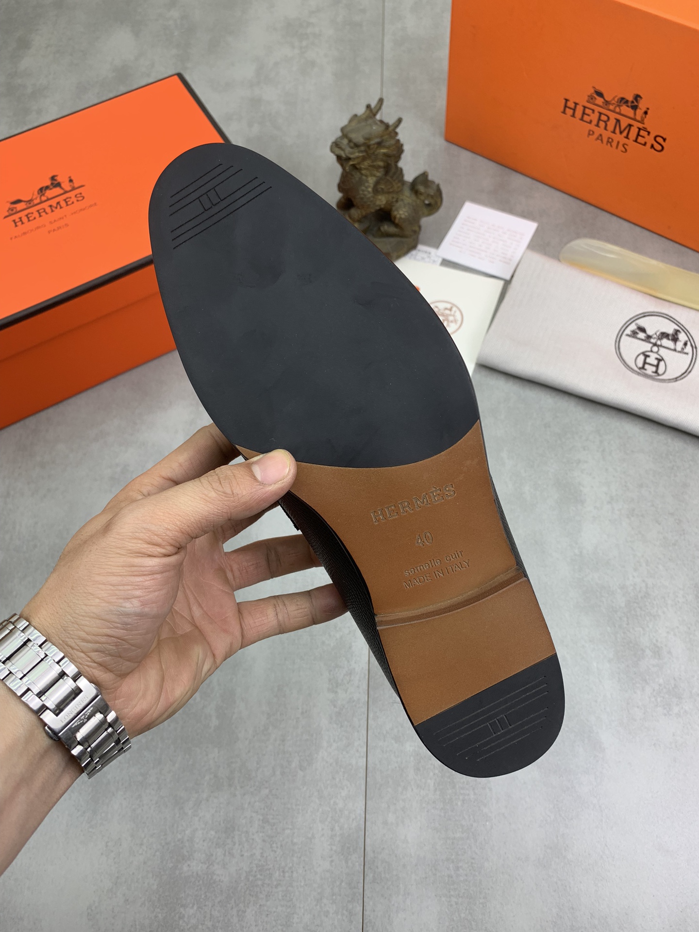 这款鞋子是AAAAA 1:1 质量 (非常棒). 使用了和原版一模一样的材料. 商标部分也保持了和爱马仕/Hermes一样. 图片拍摄是实物鞋子拍摄, 您所收到的实物保证和我们图片一模一样.