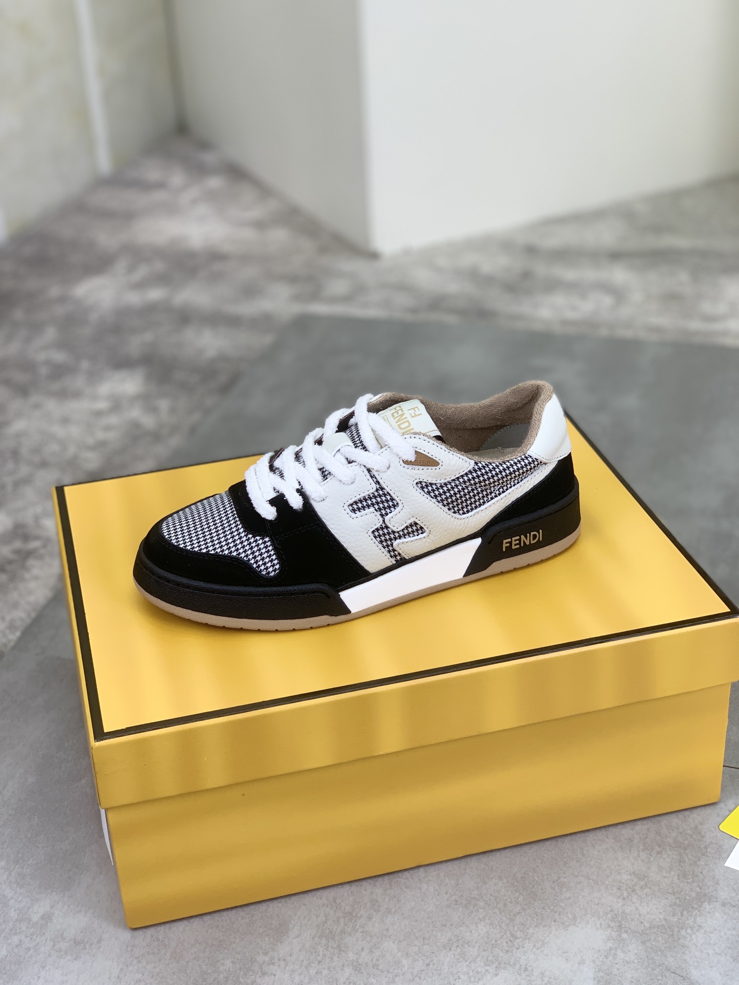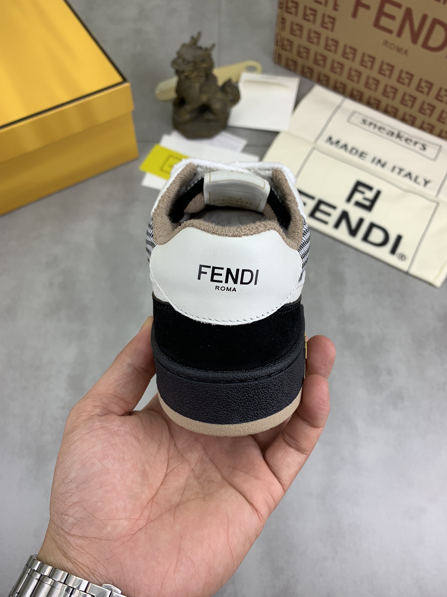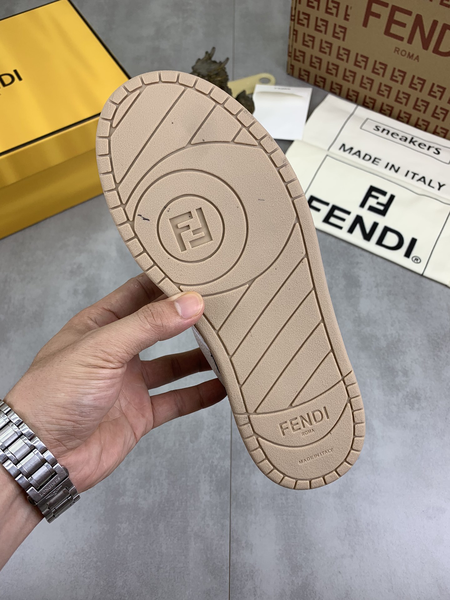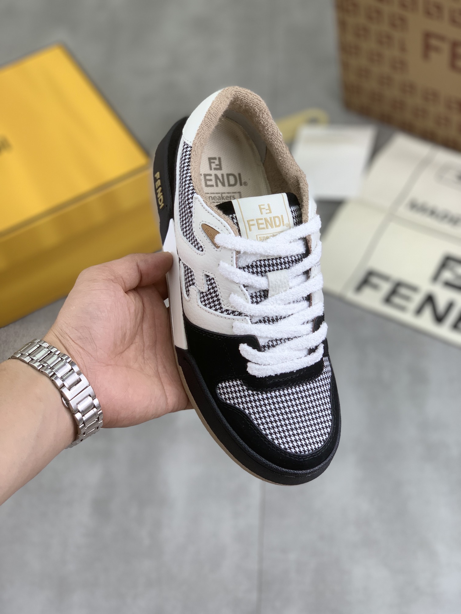 这款鞋子是AAAAA 1:1 质量 (非常棒). 使用了和原版一模一样的材料. 商标部分也保持了和芬迪/Fendi一样. 图片拍摄是实物鞋子拍摄, 您所收到的实物保证和我们图片一模一样.