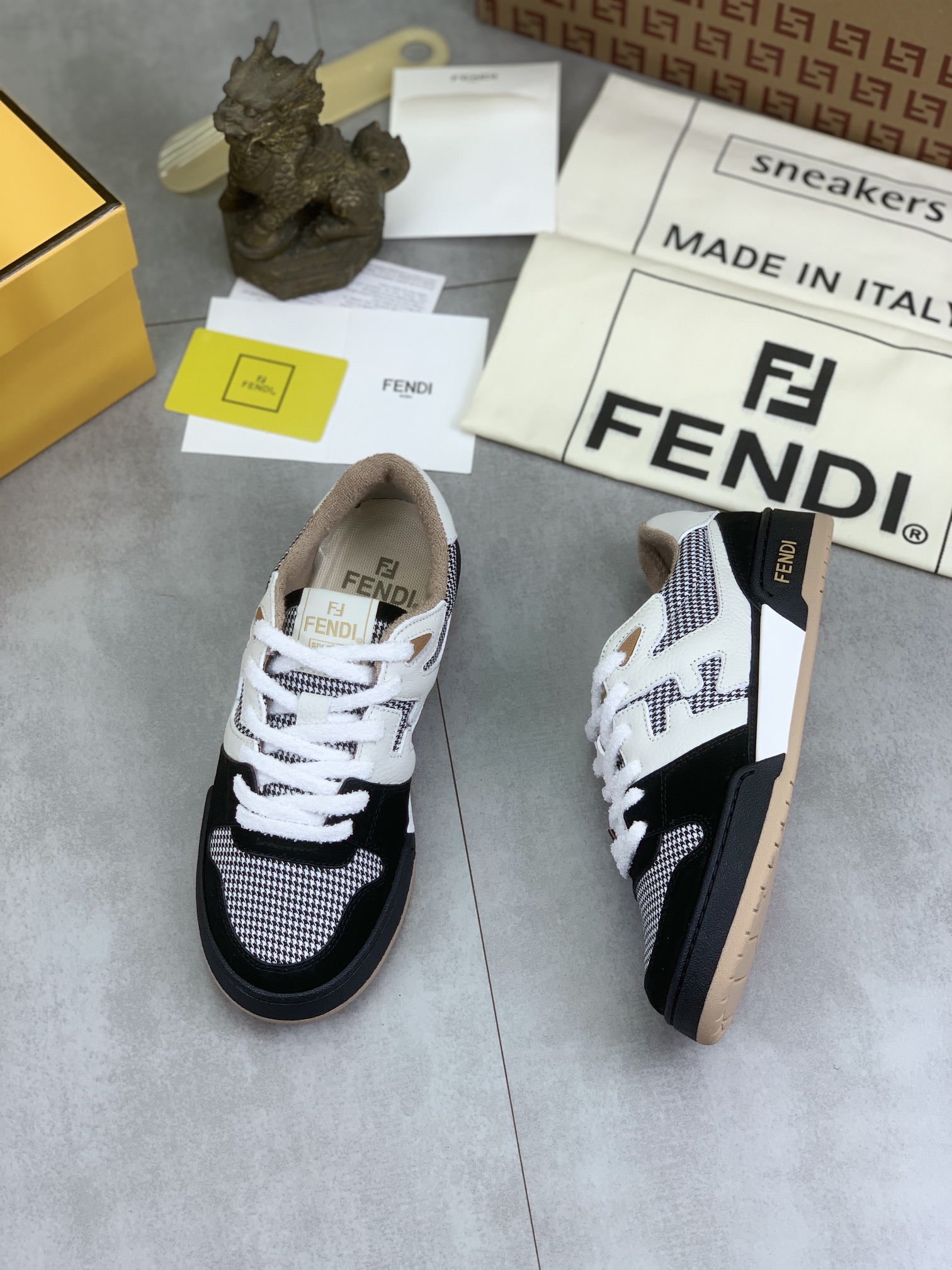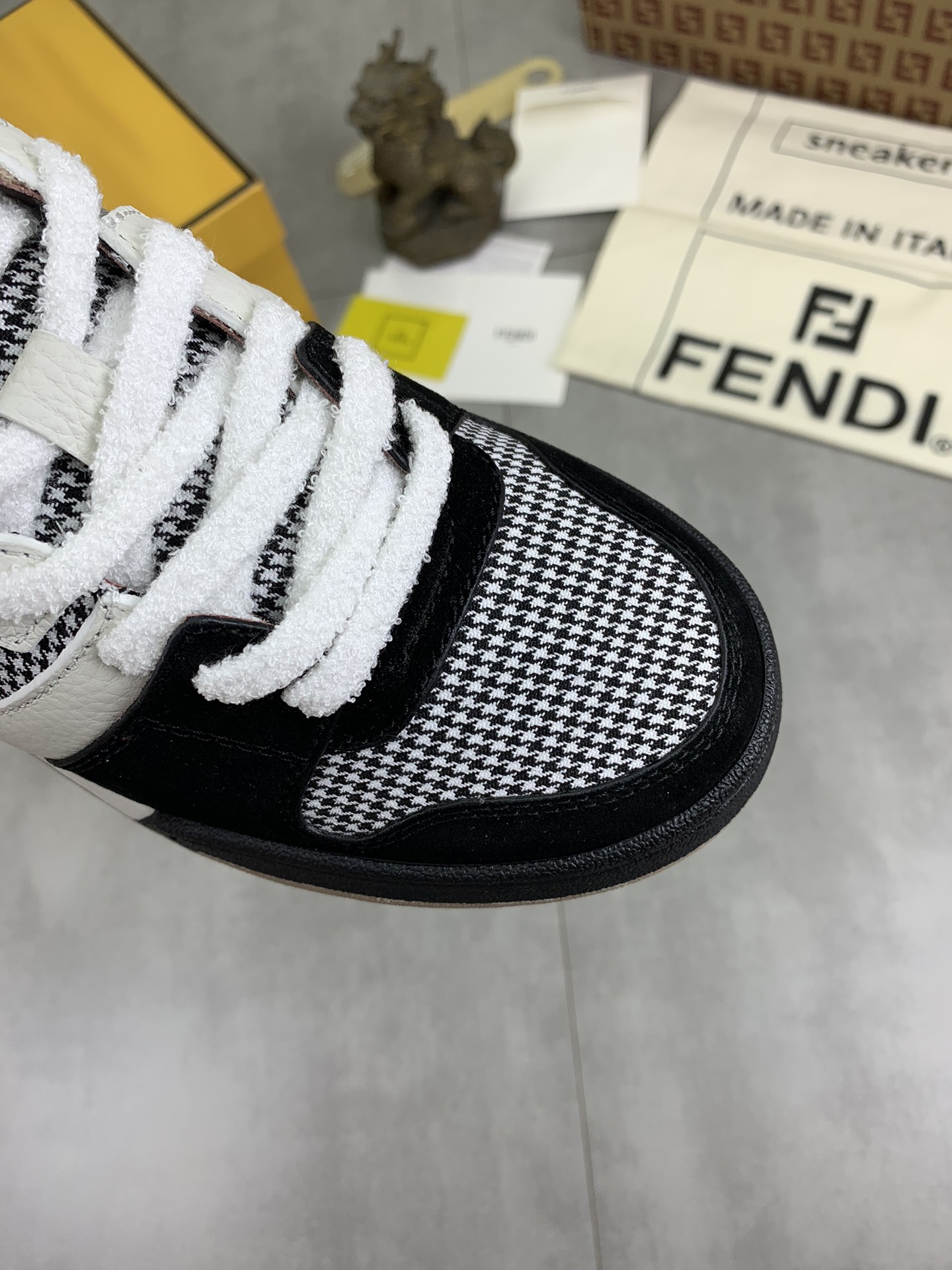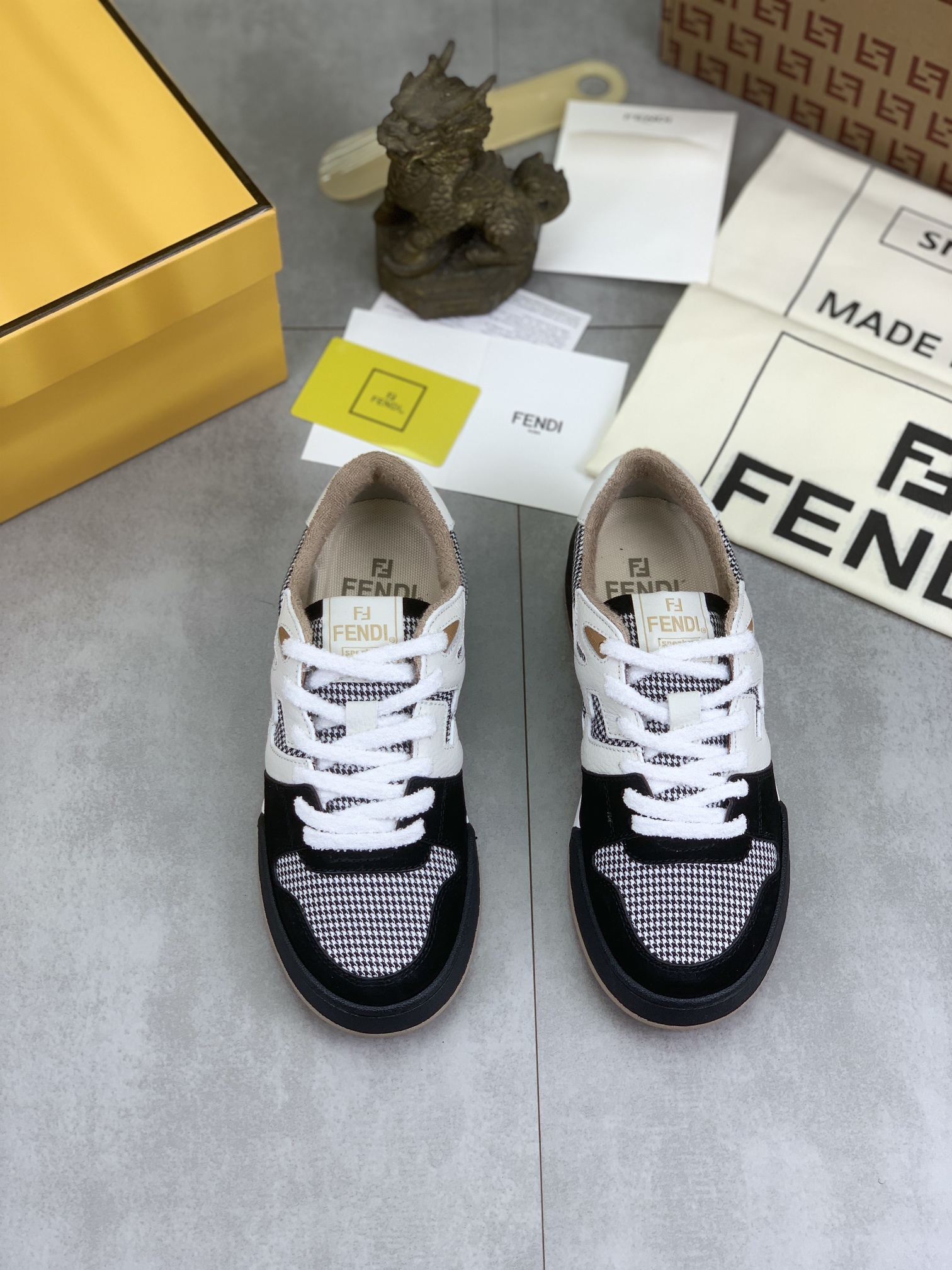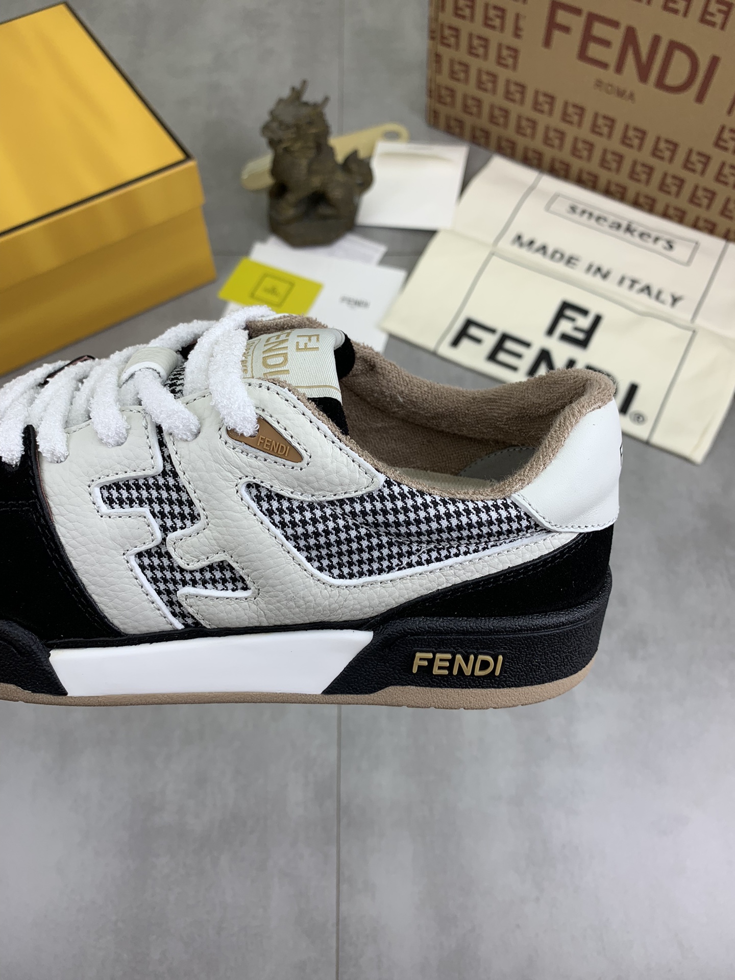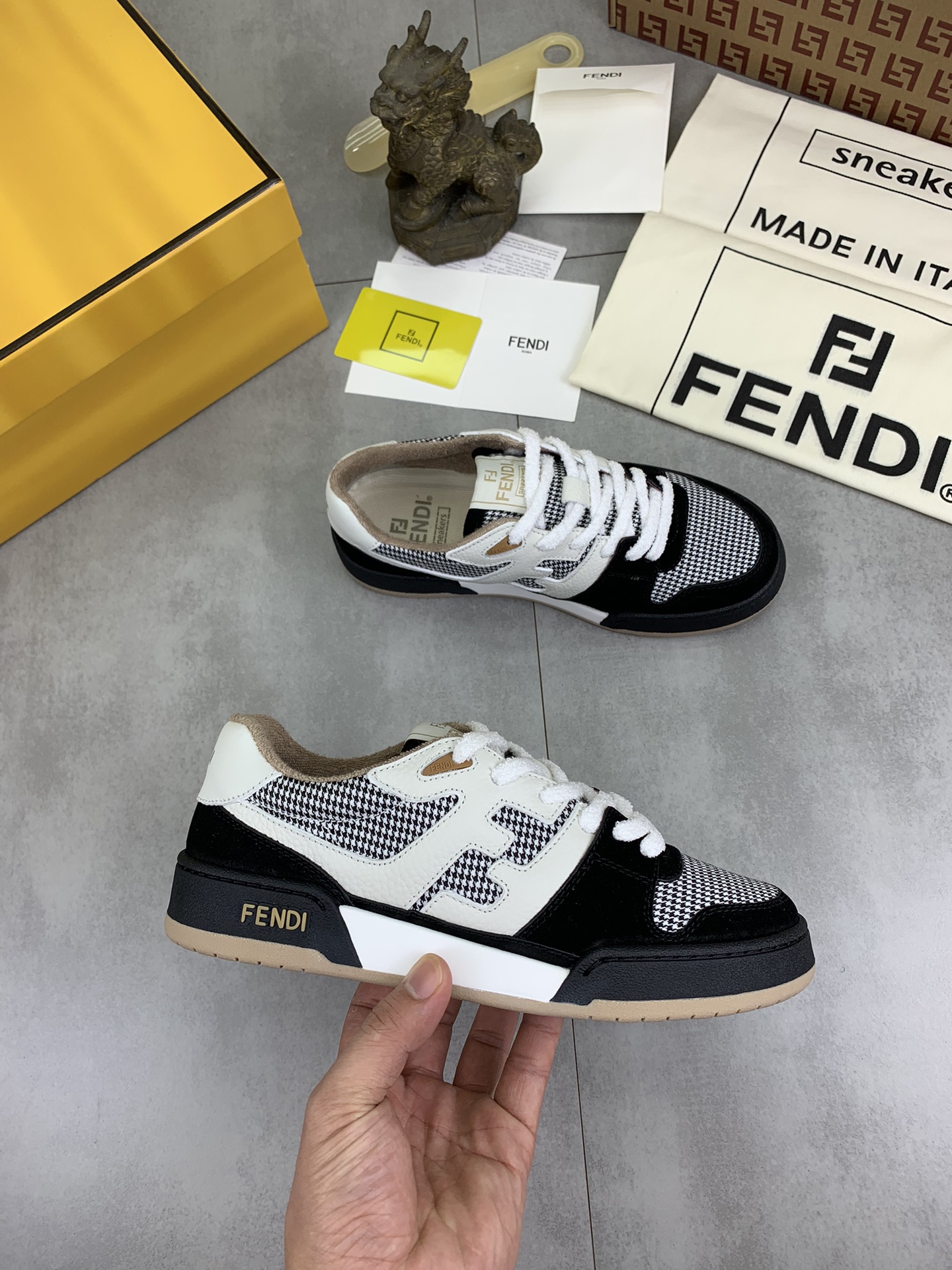 这款鞋子是AAAAA 1:1 质量 (非常棒). 使用了和原版一模一样的材料. 商标部分也保持了和芬迪/Fendi一样. 图片拍摄是实物鞋子拍摄, 您所收到的实物保证和我们图片一模一样.