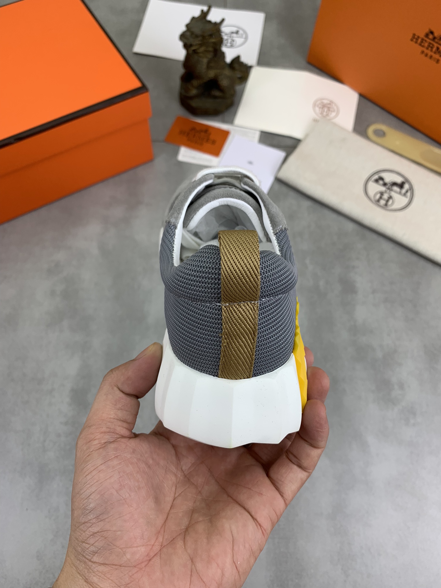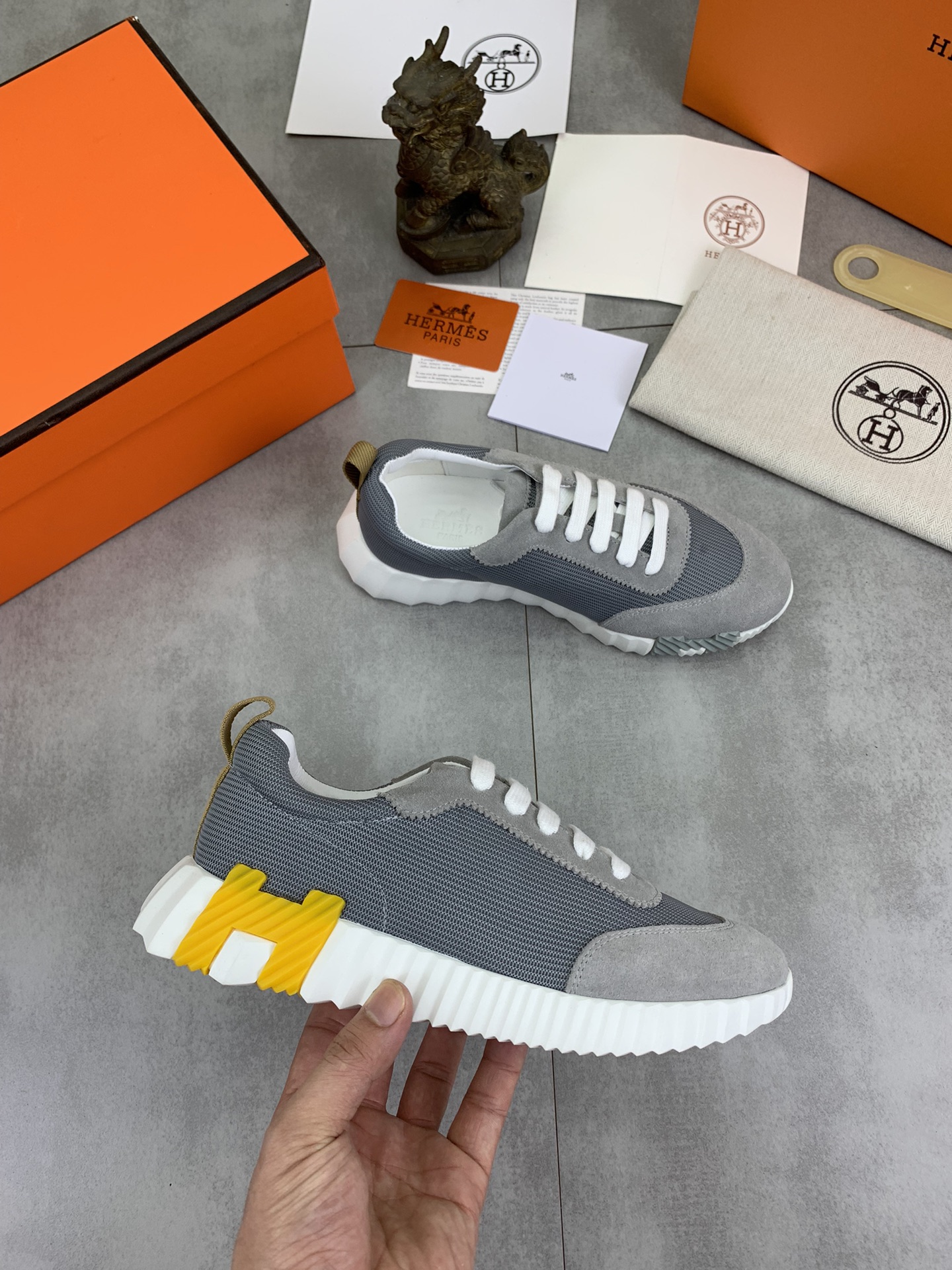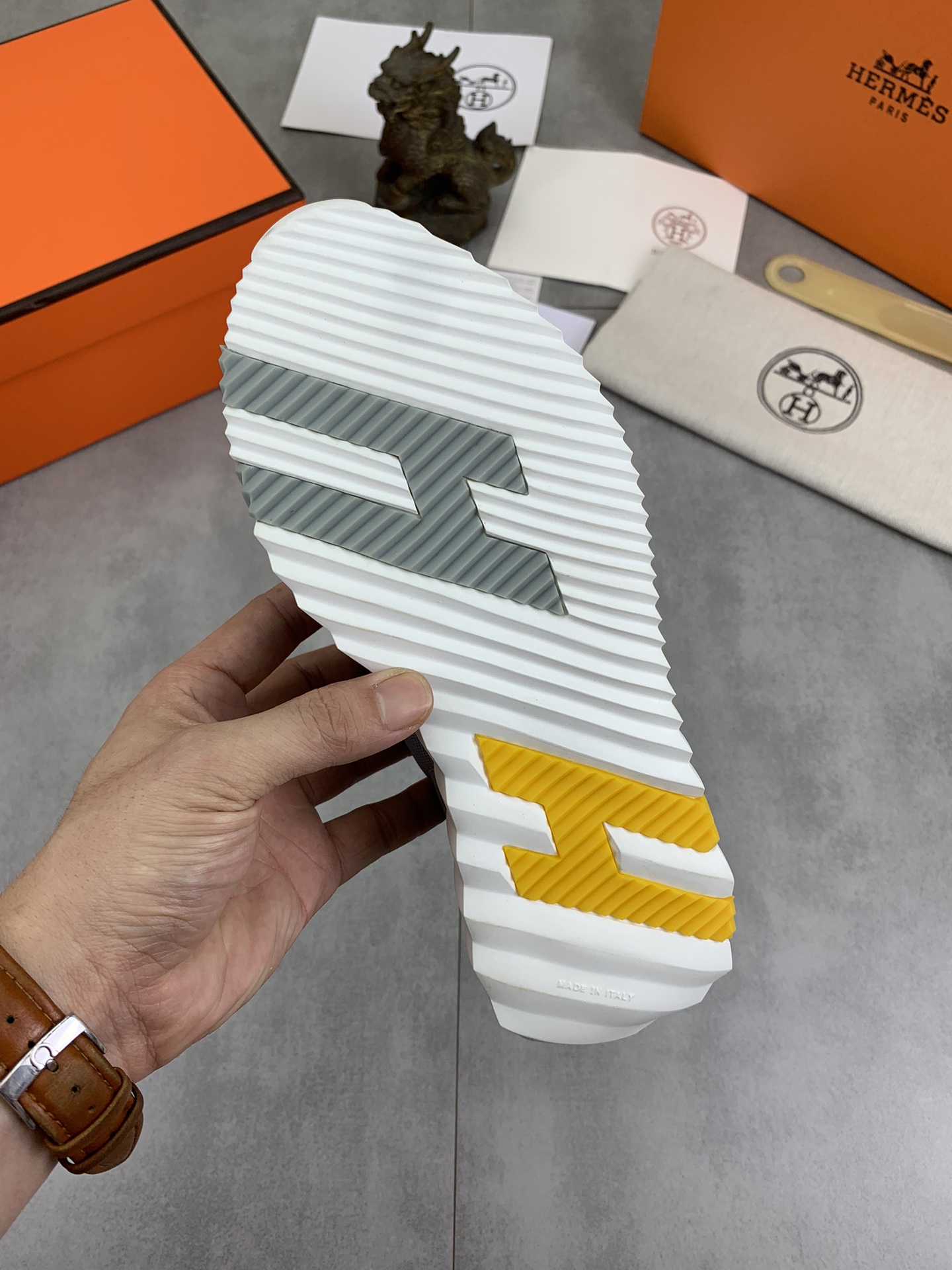 这款鞋子是AAAAA 1:1 质量 (非常棒). 使用了和原版一模一样的材料. 商标部分也保持了和爱马仕/Hermes一样. 图片拍摄是实物鞋子拍摄, 您所收到的实物保证和我们图片一模一样.