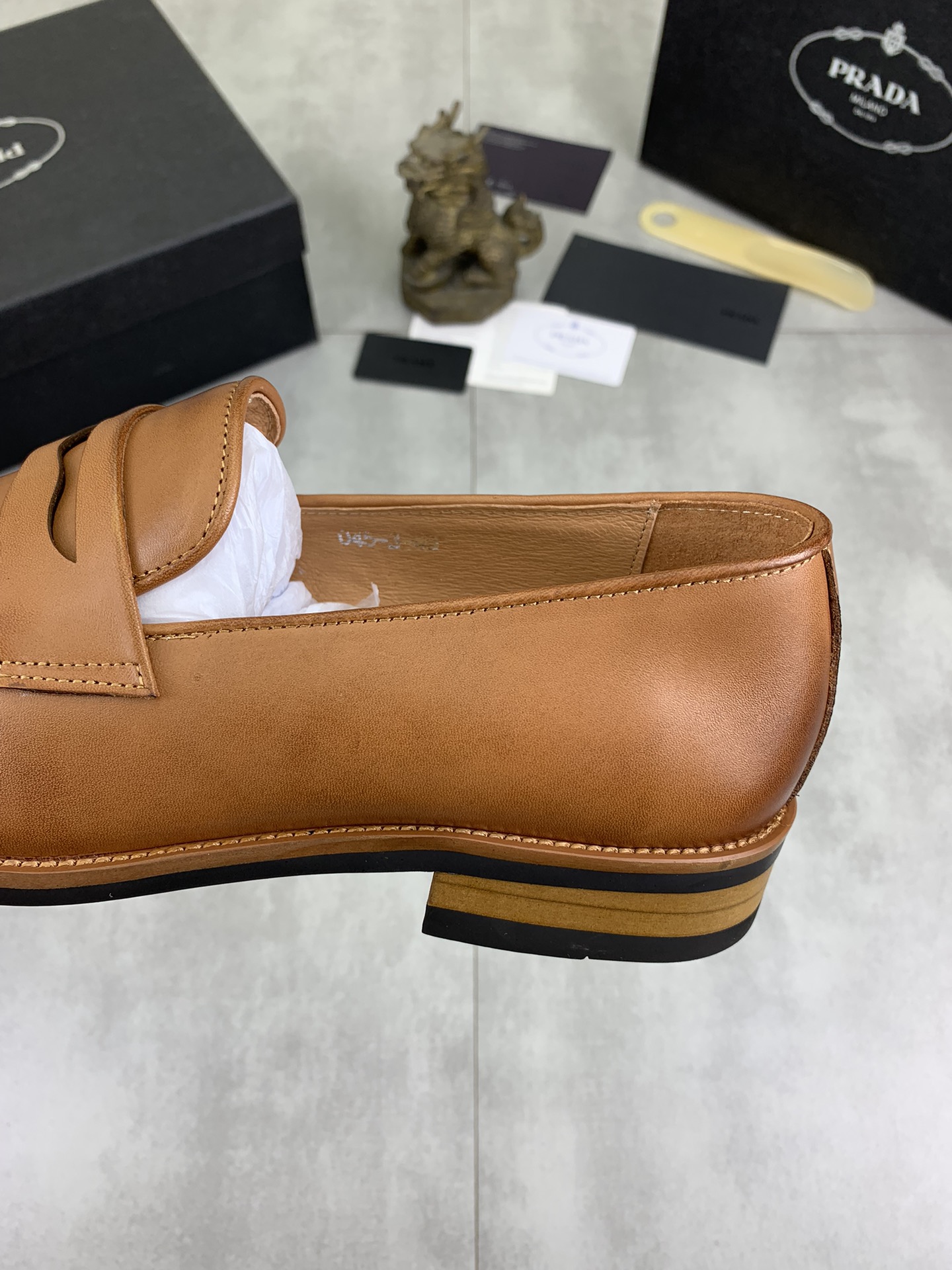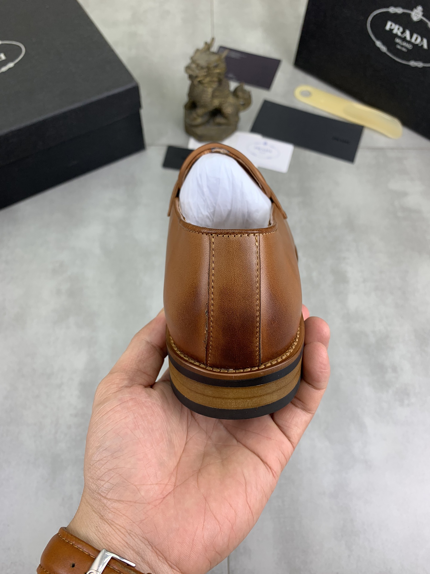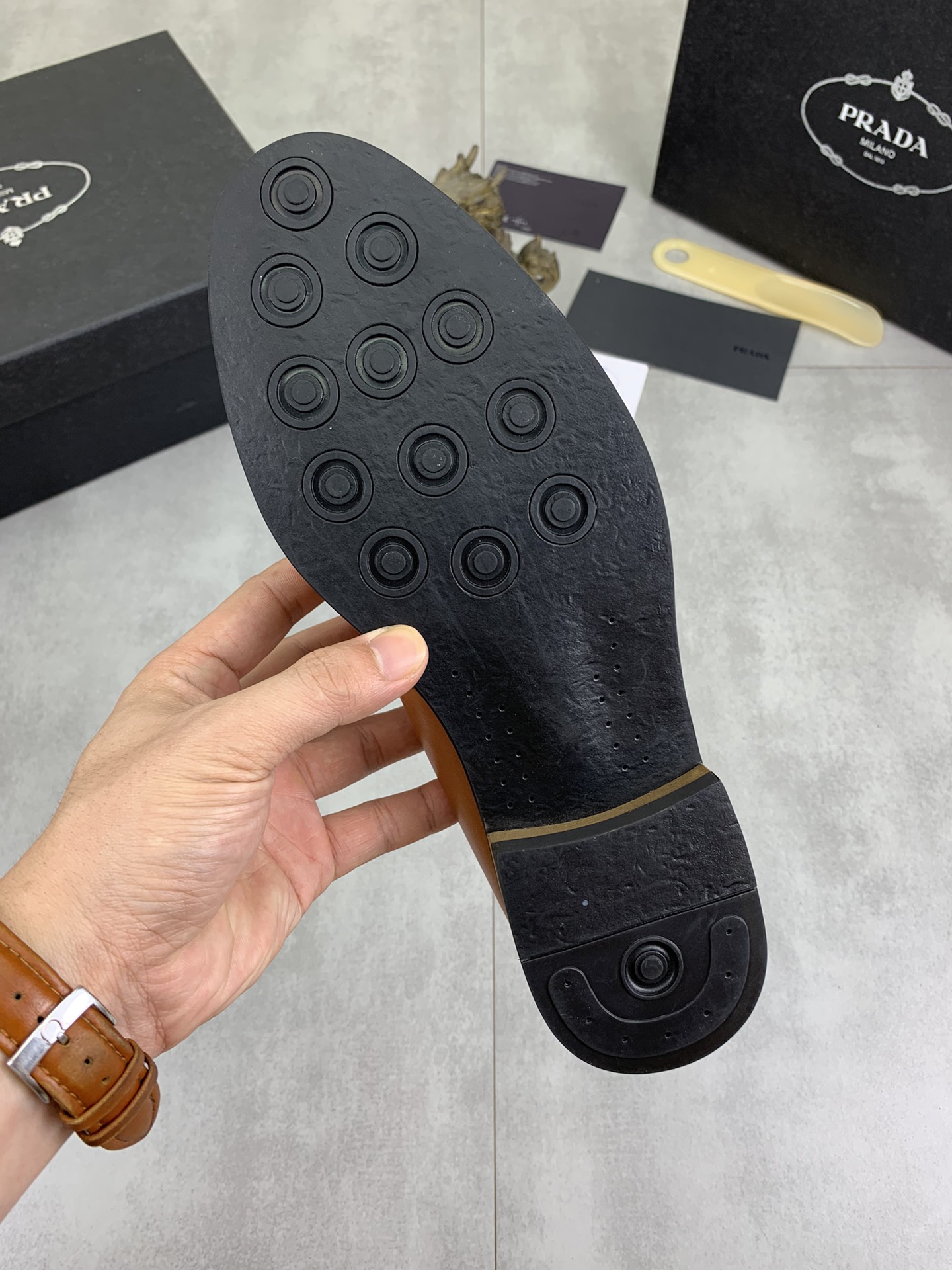 这款鞋子是AAAAA 1:1 质量 (非常棒). 使用了和原版一模一样的材料. 商标部分也保持了和普拉达/Prada一样. 图片拍摄是实物鞋子拍摄, 您所收到的实物保证和我们图片一模一样.