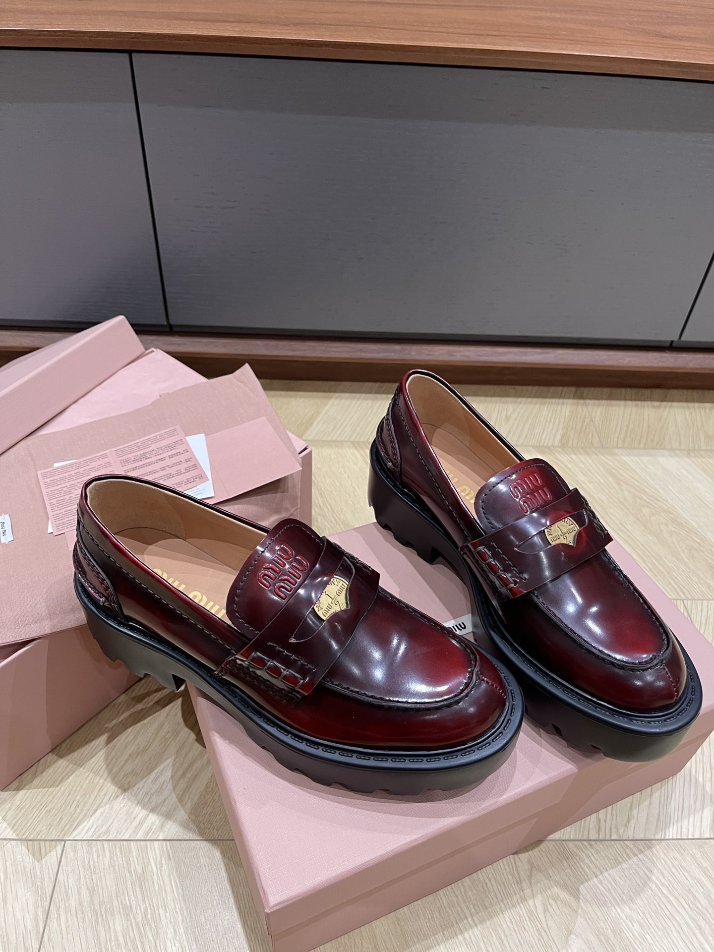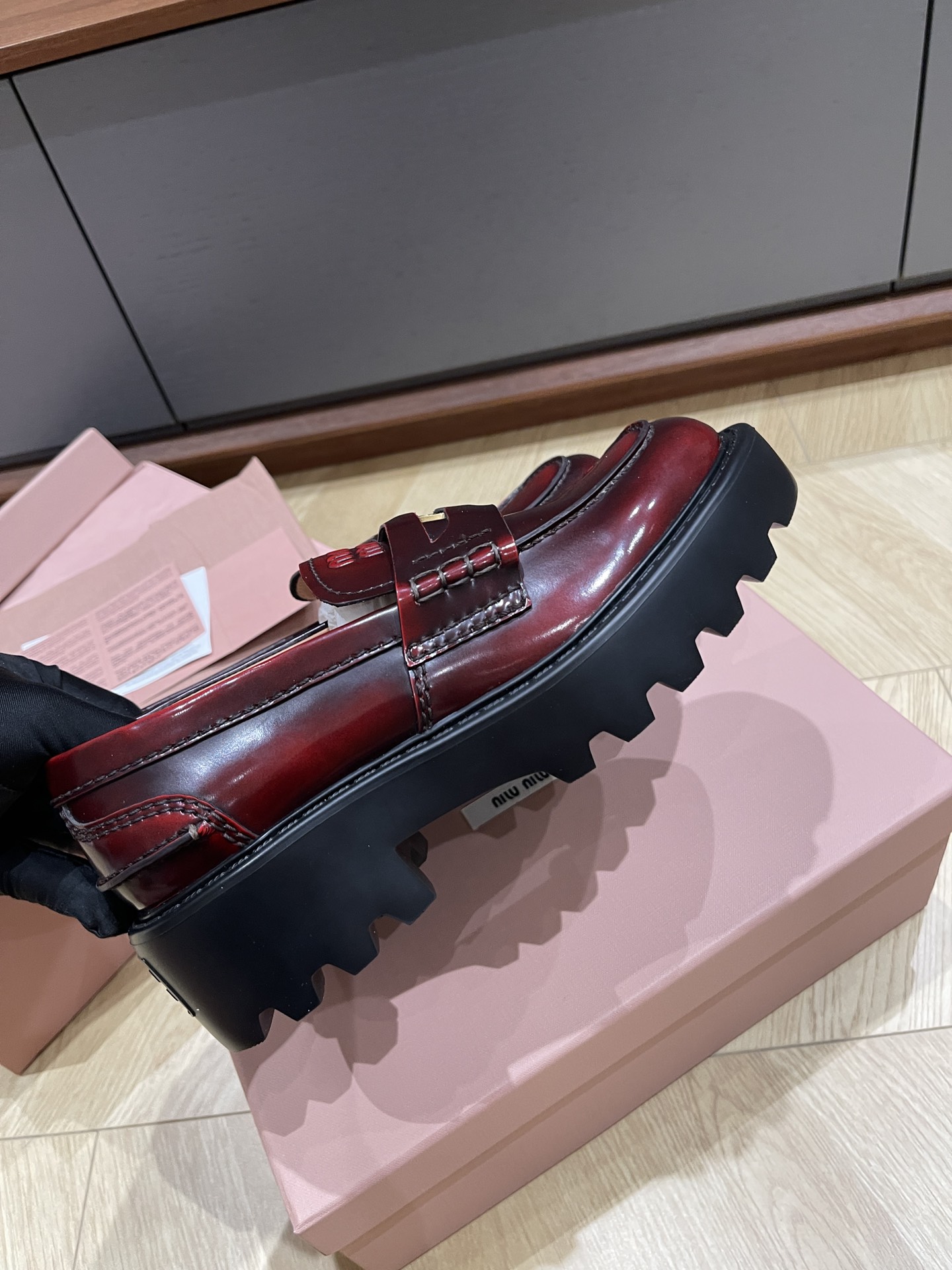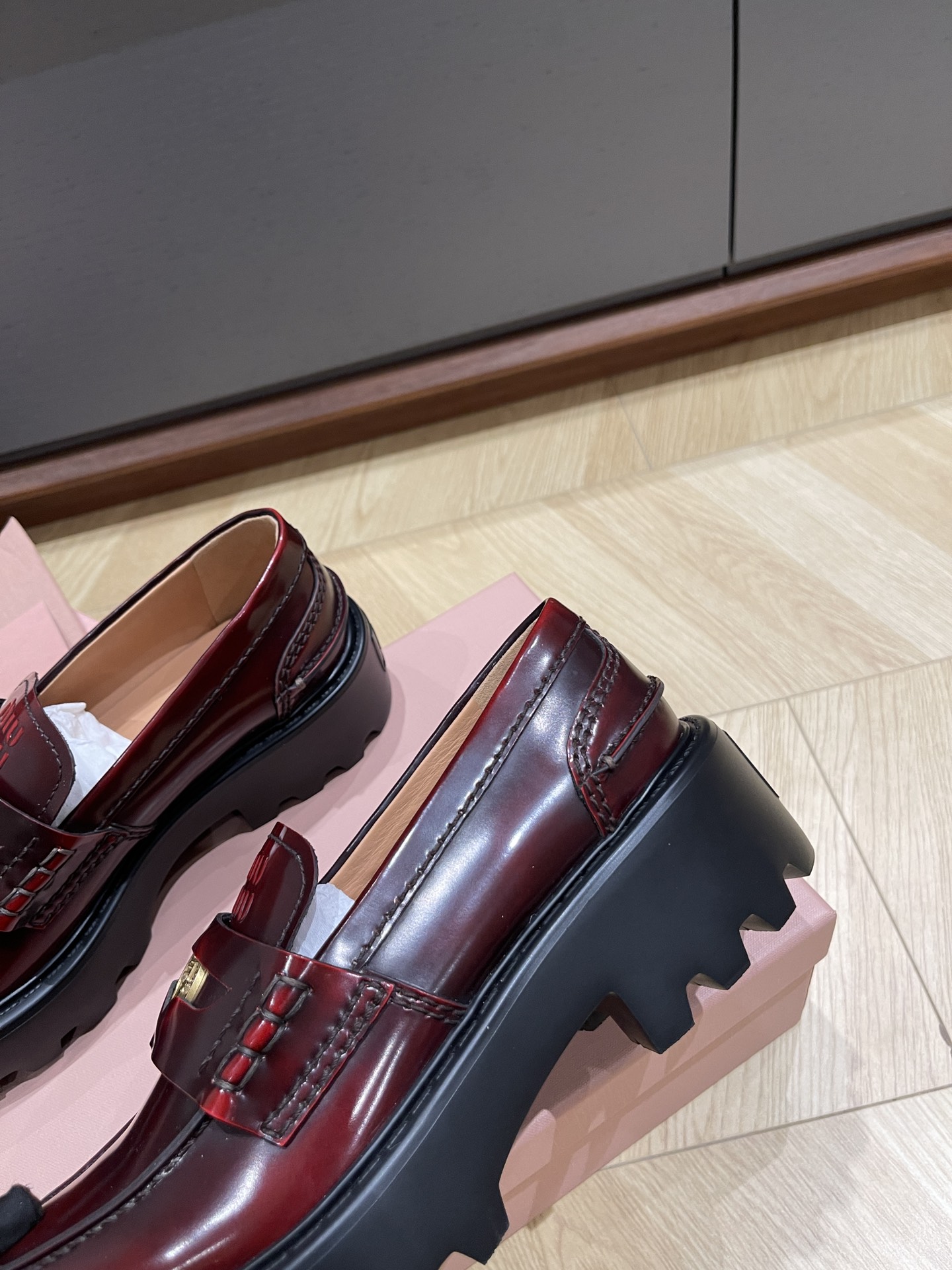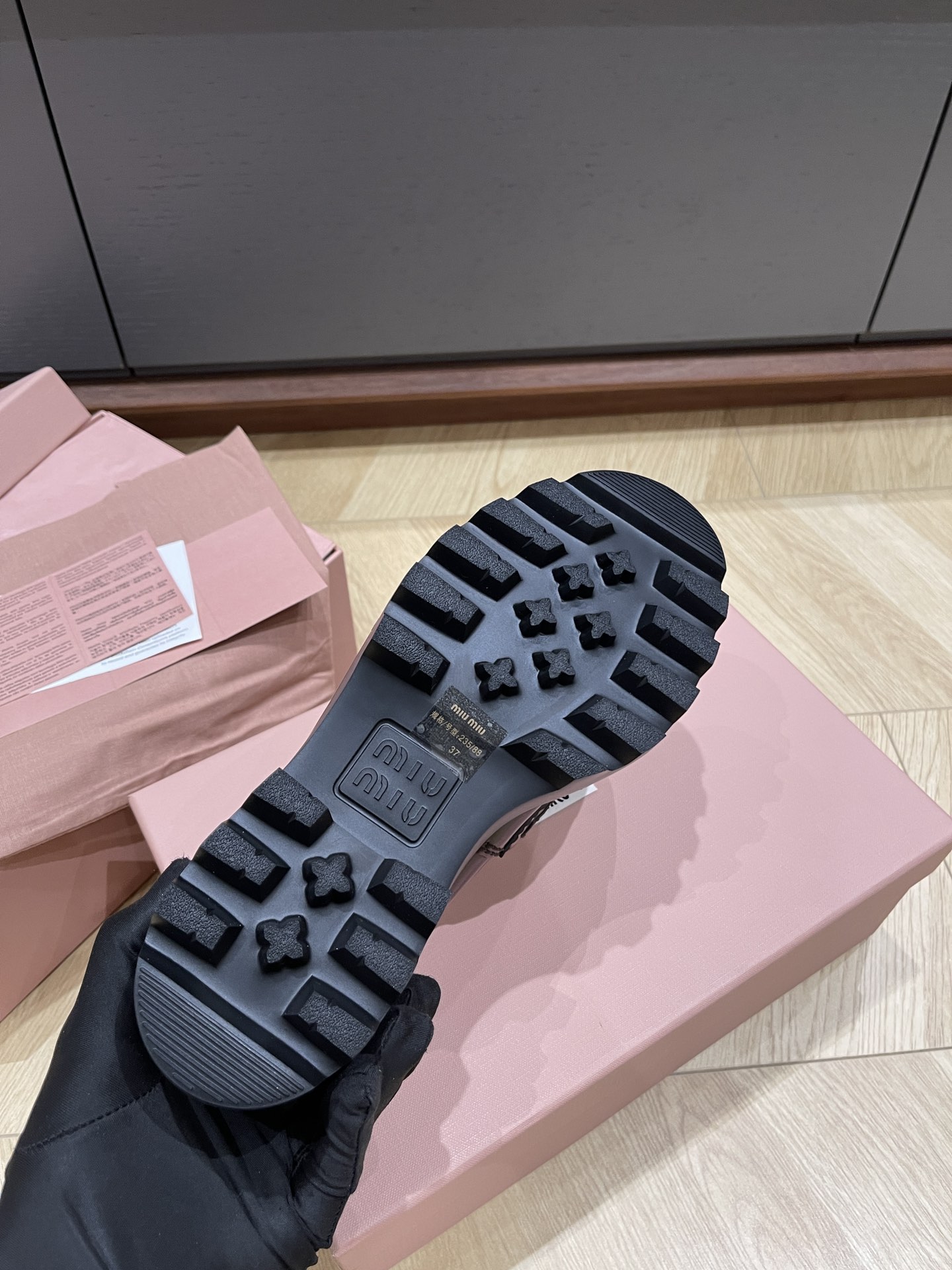 这款鞋子是AAAAA 1:1 质量 (非常棒). 使用了和原版一模一样的材料. 商标部分也保持了和缪缪/Miu Miu一样. 图片拍摄是实物鞋子拍摄, 您所收到的实物保证和我们图片一模一样.