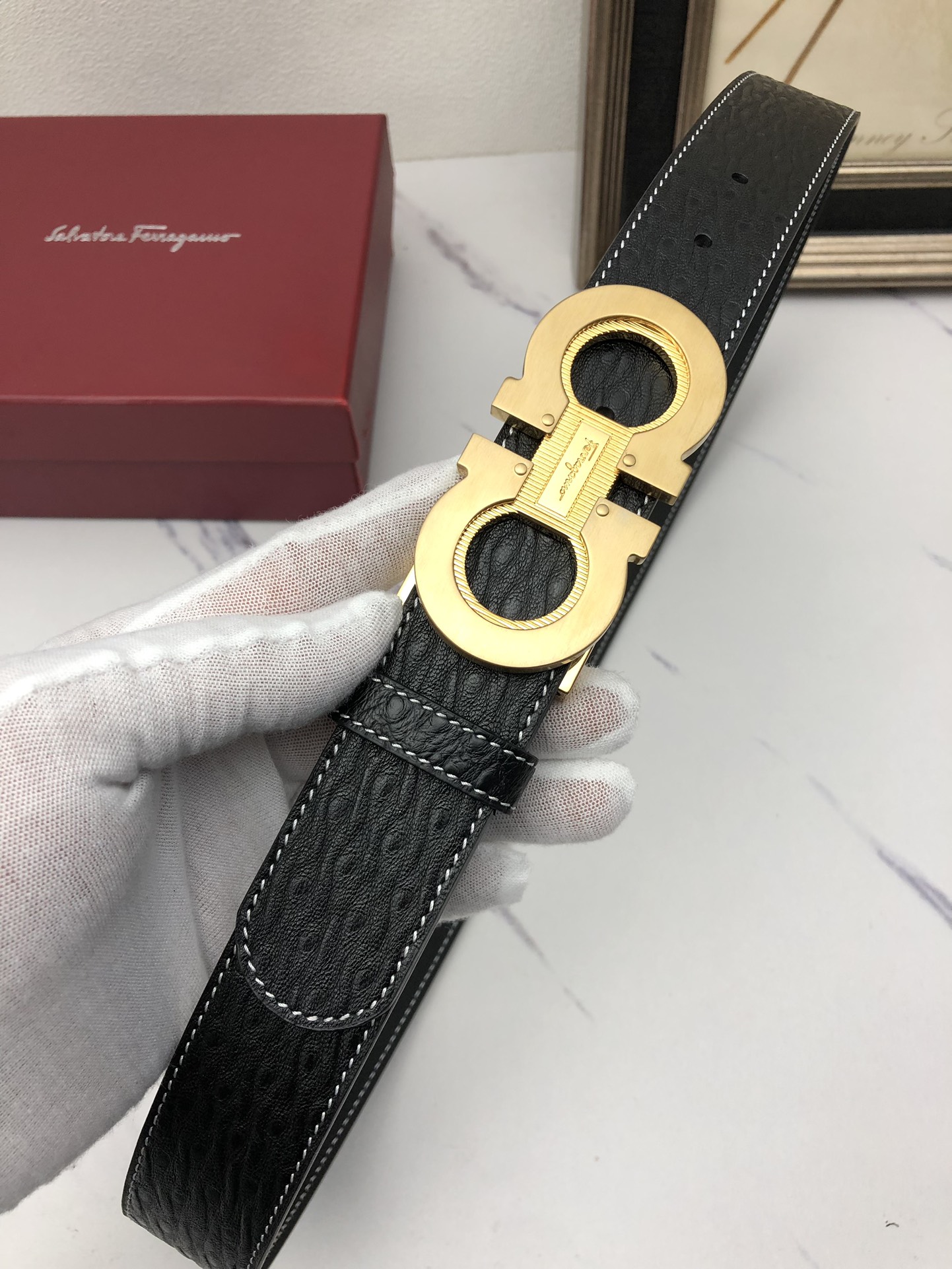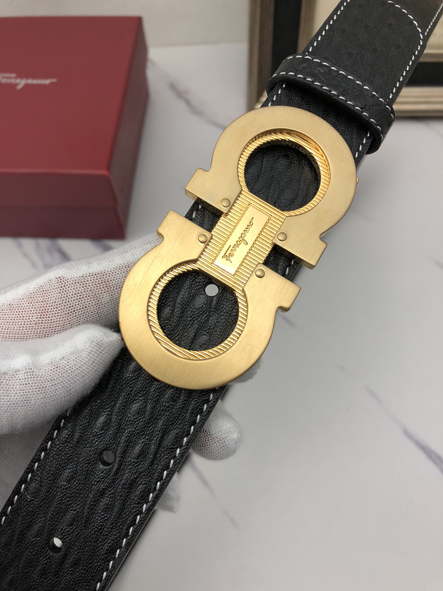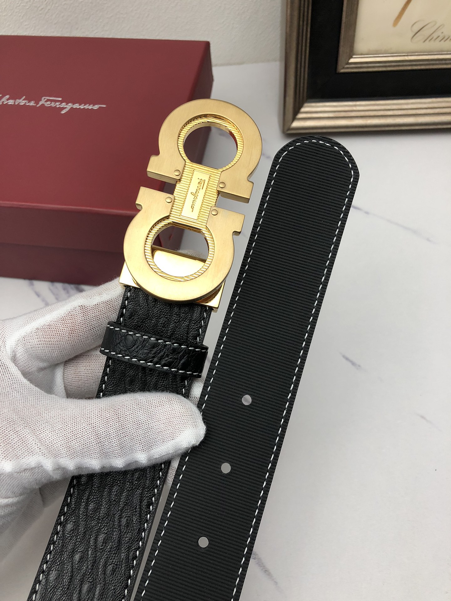 这款皮带是AAAAA 1:1 质量 (非常棒). 使用了和原版一模一样的材料. 商标部分也保持了和菲拉格慕/Salvatore Ferragamo一样. 图片拍摄是实物皮带拍摄, 您所收到的实物保证和我们图片一模一样.
