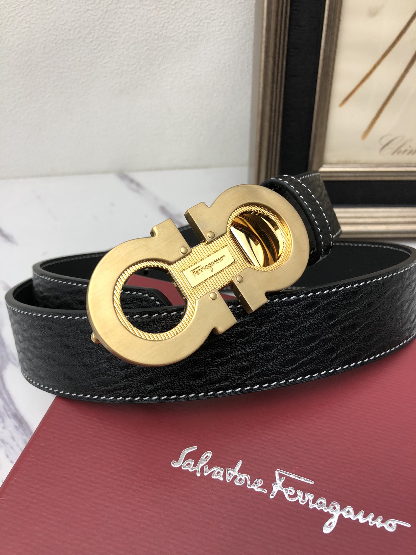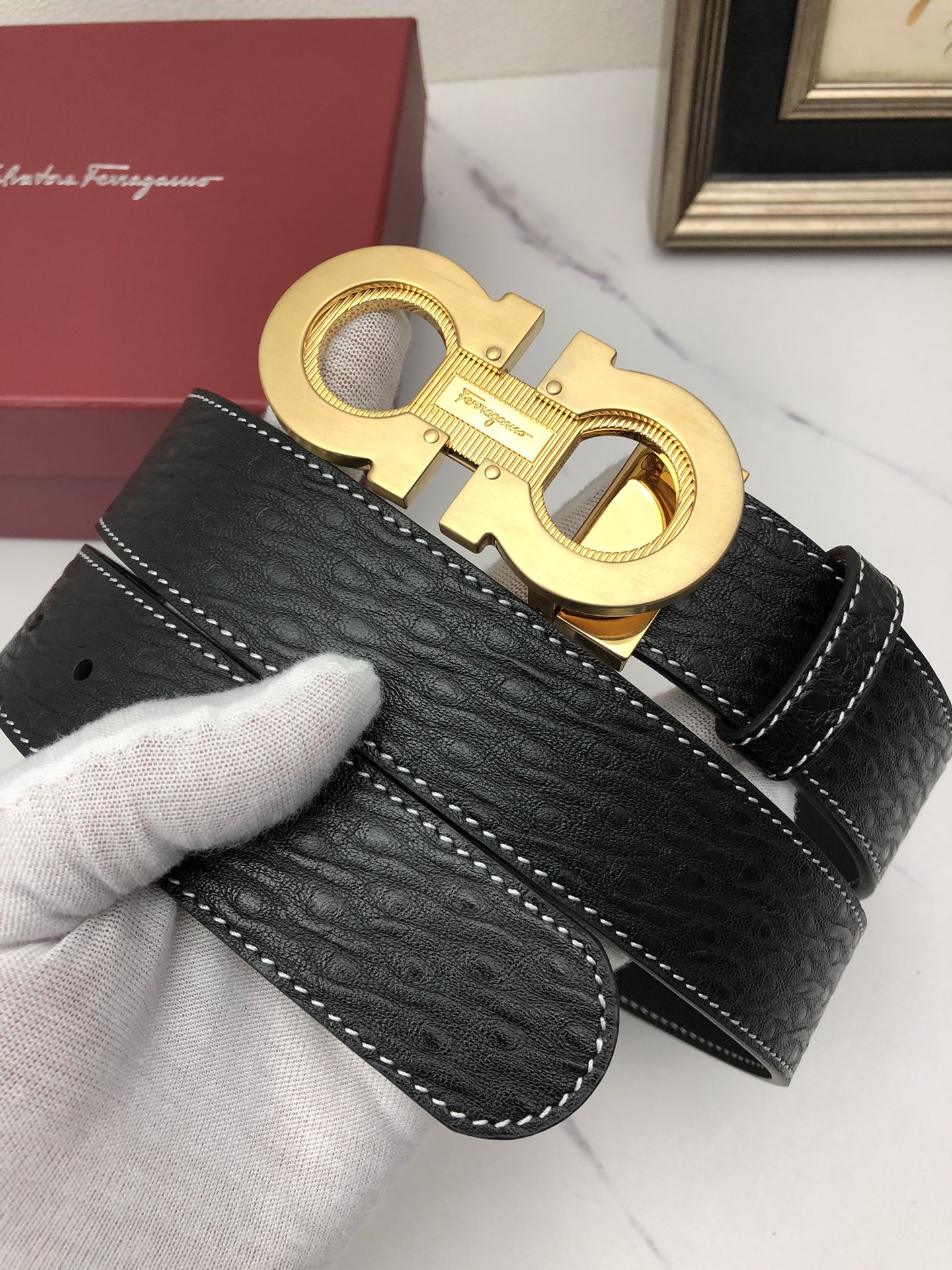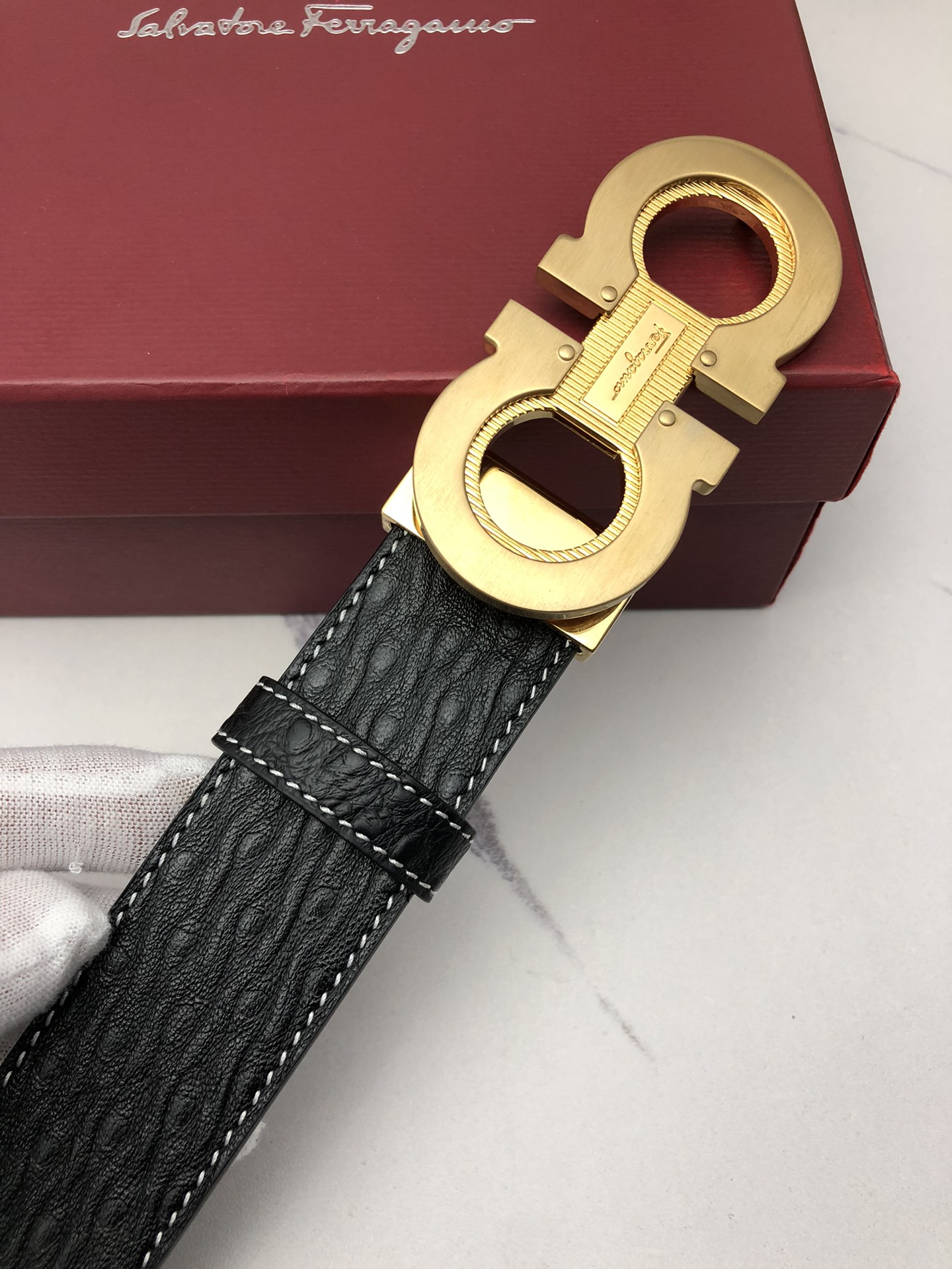 这款皮带是AAAAA 1:1 质量 (非常棒). 使用了和原版一模一样的材料. 商标部分也保持了和菲拉格慕/Salvatore Ferragamo一样. 图片拍摄是实物皮带拍摄, 您所收到的实物保证和我们图片一模一样.