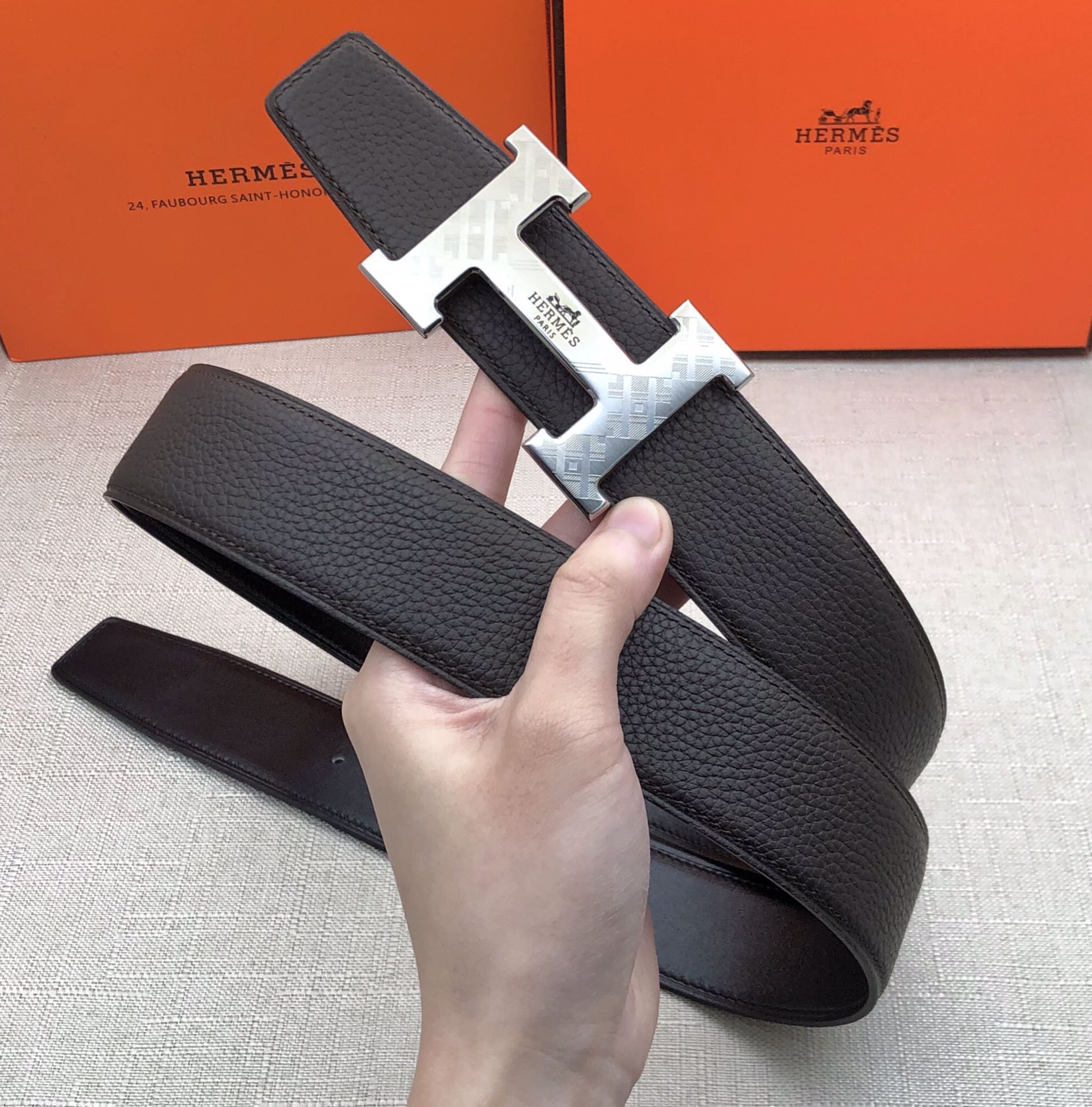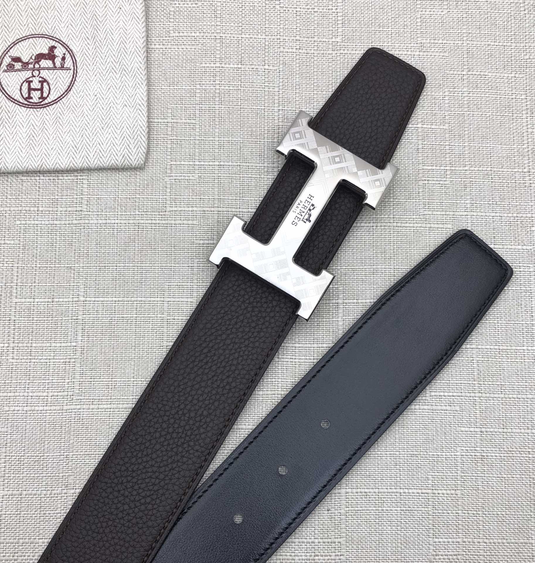 这款皮带是AAAAA 1:1 质量 (非常棒). 使用了和原版一模一样的材料. 商标部分也保持了和爱马仕/Hermes一样. 图片拍摄是实物皮带拍摄, 您所收到的实物保证和我们图片一模一样.