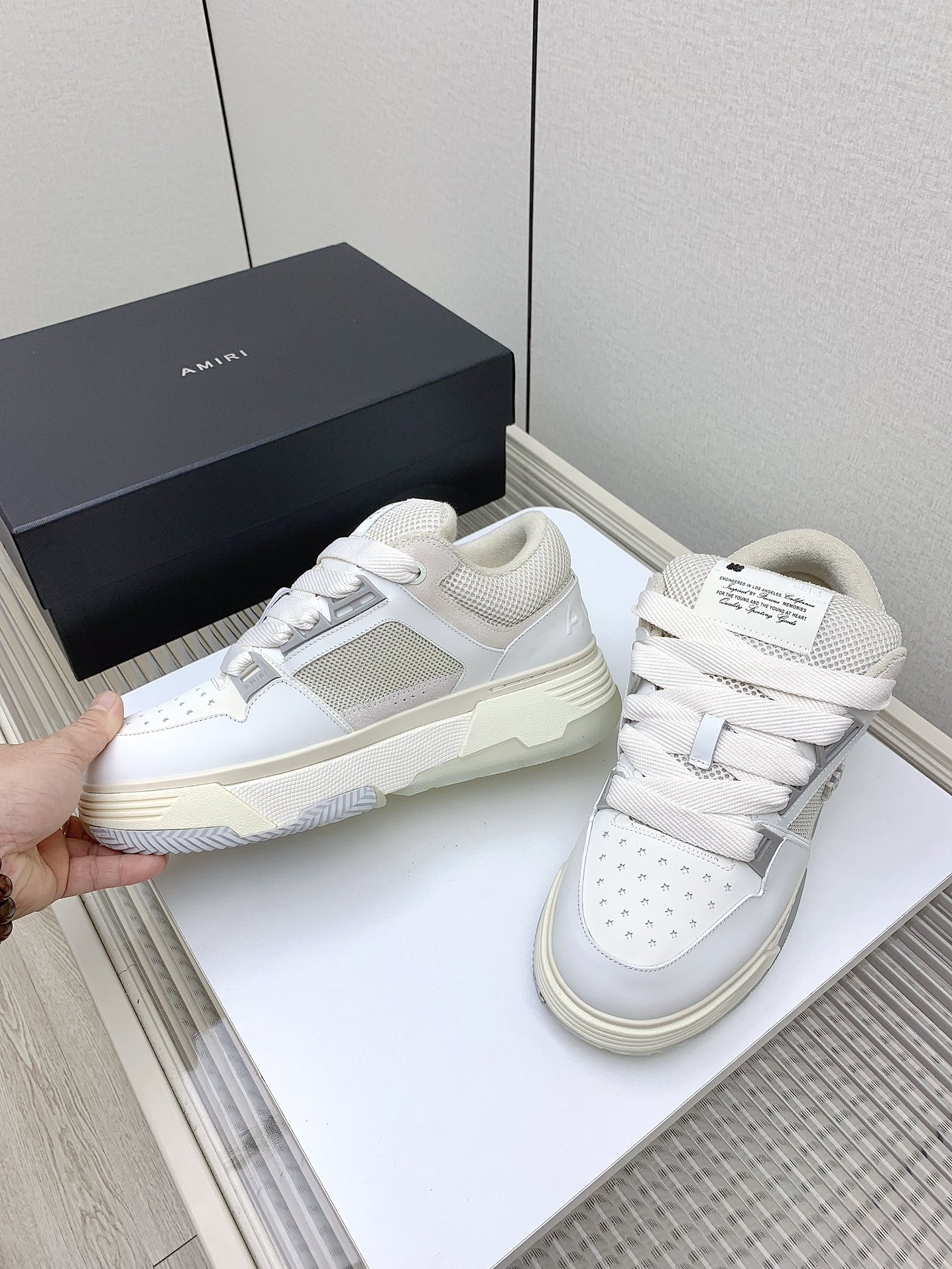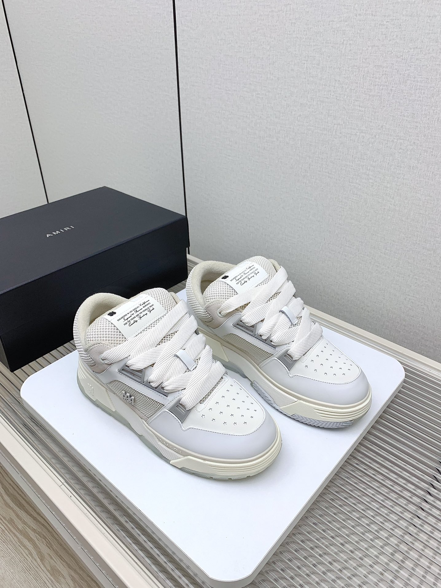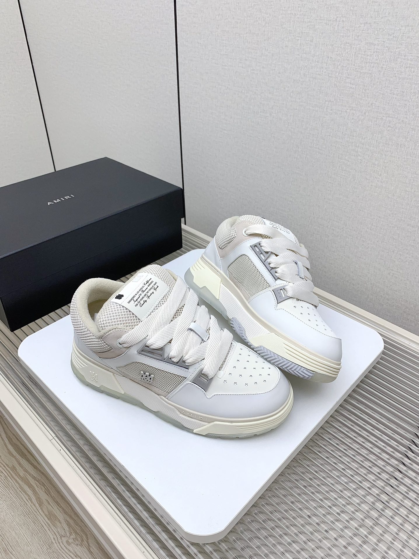 这款鞋子是AAAAA 1:1 质量 (非常棒). 使用了和原版一模一样的材料. 商标部分也保持了和AMIRI一样. 图片拍摄是实物鞋子拍摄, 您所收到的实物保证和我们图片一模一样.