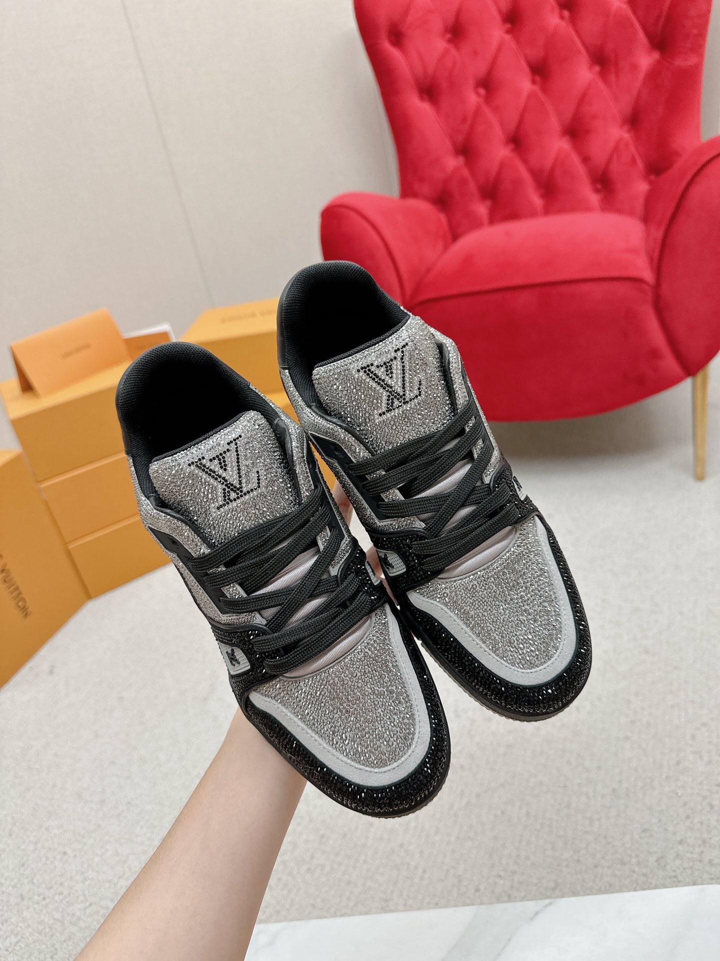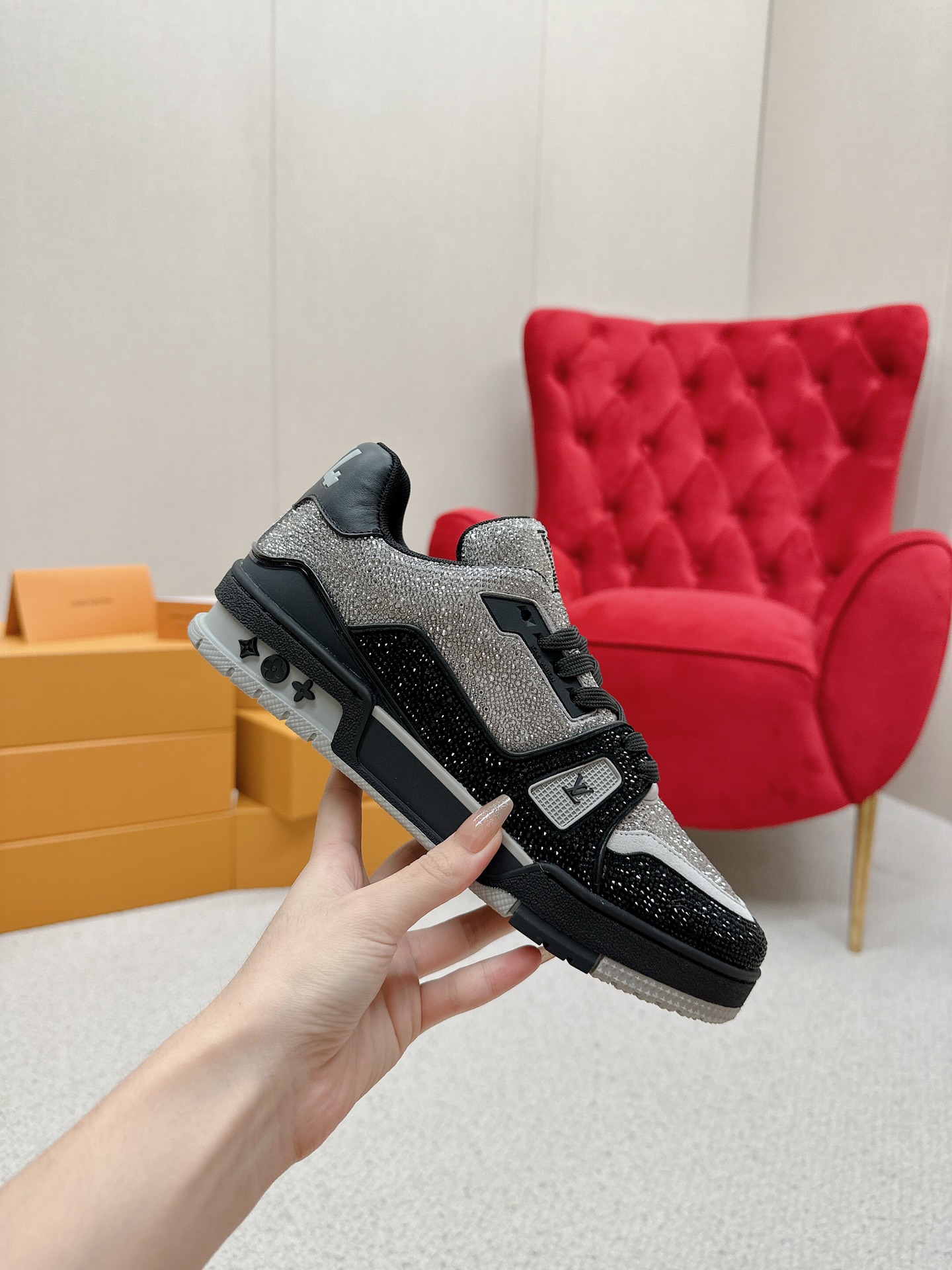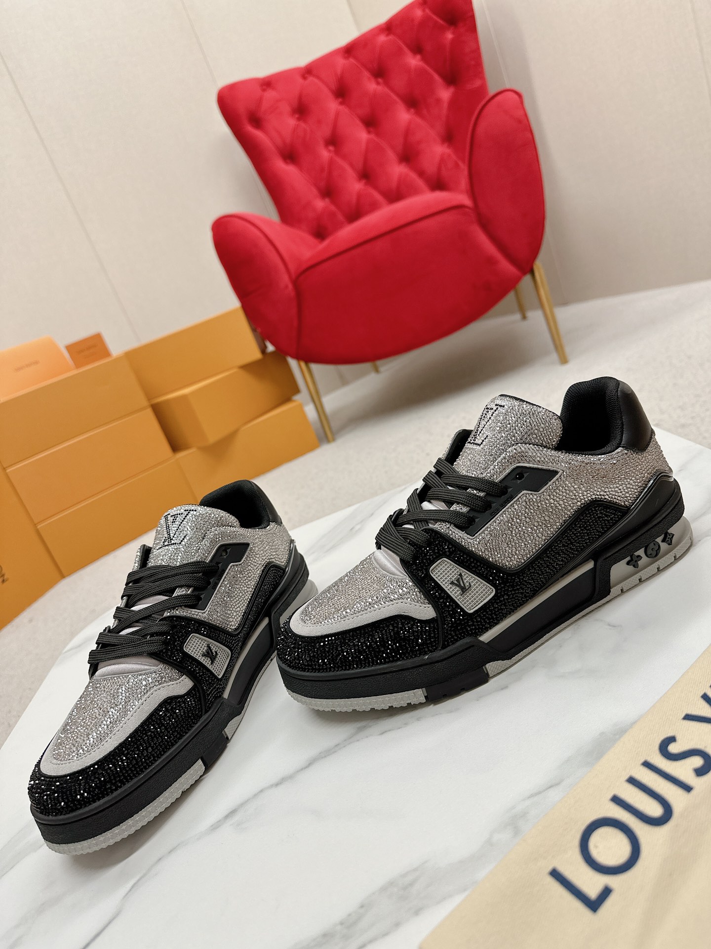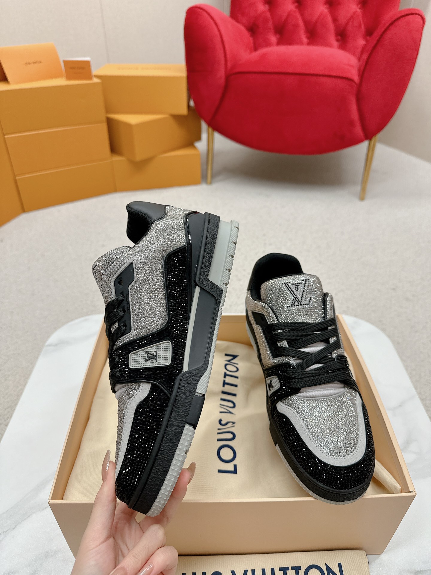 这款鞋子是AAAAA 1:1 质量 (非常棒). 使用了和原版一模一样的材料. 商标部分也保持了和路易威登/Louis Vuitton一样. 图片拍摄是实物鞋子拍摄, 您所收到的实物保证和我们图片一模一样.
